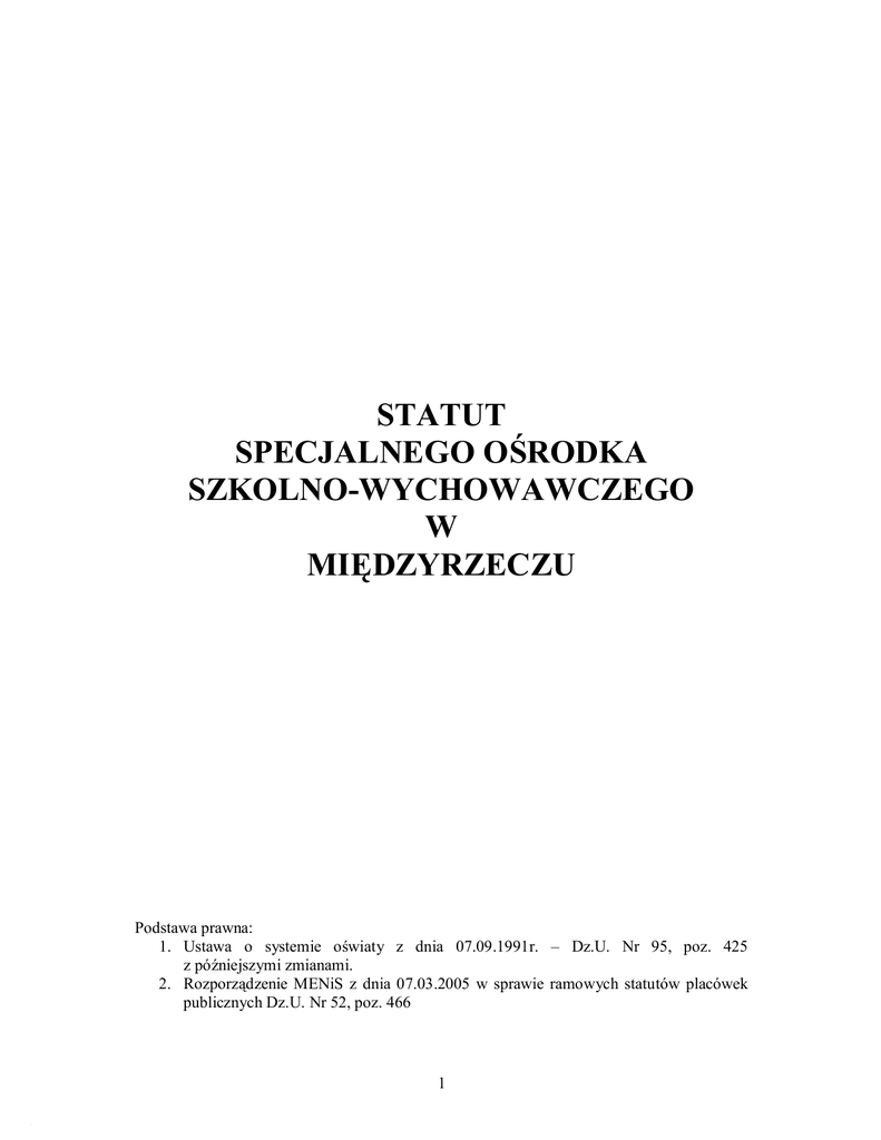 STATUT SPECJALNEGO OŚRODKA SZKOLNO-WYCHOWAWCZEGO W MIĘDZYRZECZU Podstawa prawna: 1. Ustawa o systemie oświaty z dnia 07.09.1991r. – Dz.U. Nr 95, poz. 425 z późniejszymi zmianami. 2. Rozporządzenie MENiS z dnia 07.03.2005 w sprawie ramowych statutów placówek publicznych Dz.U. Nr 52, poz. 466 1 § 1. Przepisy ogólne 1. Statut Specjalnego Ośrodka Szkolno-Wychowawczego w Międzyrzeczu określa zasady działania Ośrodka i wszystkich podmiotów wchodzących w jego skład. 2. Specjalny Ośrodek Szkolno-Wychowawczy zwany dalej „Ośrodkiem” jest publiczną placówką oświatową dla dzieci i młodzieży upośledzonej umysłowo w stopni lekkim, umiarkowanym, znacznym i głębokim. W Przypadku braku Ośrodka RewalidacyjnoWychowawczego na terenie powiatu Ośrodek organizuje zajęcia rewalidacyjnowychowawcze dla dzieci i młodzieży z głębokim stopniem niepełnosprawności intelektualnej. 3. Ośrodek mieści się w Międzyrzeczu przy ulicy Konstytucji 3 Maja 60. 4. Nazwa Specjalnego Ośrodka Szkolno-Wychowawczego jest używana w pełnym brzmieniu. 5. Na tablicach urzędowych pomija się określenie „Specjalny”- umieszcza się nazwę „Ośrodek Szkolno-Wychowawczy w Międzyrzeczu. 6. Ośrodek posiada stempel o treści: Specjalny Ośrodek Szkolno-Wychowawczy ul. Konstytucji 3 Maja 60 66-300 Międzyrzecz NIP 596-106-70-77 Regon 000847050 § 2. Cele i zadania Ośrodka 1. Głównym celem i zadaniem Ośrodka jest przygotowanie uczniów/wychowanków do samodzielnego udziału w życiu społecznym w integracji ze środowiskiem. 2. Szczegółowe zadania i cele pracy dydaktyczno-wychowawczo-opiekuńczej oraz rewalidacyjnej dziećmi wynikają z zadań pedagogiki specjalnej, dostosowanych do rozwoju i stopnia niepełnosprawności intelektualnej poszczególnych uczniów/wychowanków. 3. Celem Ośrodka poza celami określonymi ustawą jest w szczególności przygotowanie do życia w integracji ze środowiskiem poprzez: 1) osiągnięcie możliwego wszechstronnego rozwoju uczniów w dostępnym im zakresie za pomocą specjalnych metod; 2) przygotowanie do samodzielności; 3) udzielanie uczniom/wychowankom specjalistycznej pomocy pedagogicznej, rewalidacyjnej, logopedycznej, resocjalizacyjnej, psychologicznej; 4) udzielaniem uczniom/wychowankom pomocy materialnej; 5) umożliwienie uczniom podtrzymywania poczucia tożsamości narodowej i religijnej; 6) zorganizowanie i zapewnienie specjalistycznej pomocy pielęgniarskiej; 7) umożliwienie rozwoju zainteresowań uczniów poprzez realizowanie indywidualnych programów nauczania i wychowania (dostosowanych do indywidualnych możliwości uczniów); 8) sprawowanie opieki nad uczniami/wychowankami przebywającymi w Ośrodku podczas zajęć obowiązkowych, nadobowiązkowych i pozaszkolnych; 9) sprawowanie opieki nad uczniami podczas zajęć poza terenem szkoły, w trakcie wycieczek i zajęć; 2 4. Ośrodek wykonuje swoje zadania poprzez: 1) I etap edukacyjny dla uczniów z upośledzeniem umysłowym w stopniu lekkim, umiarkowanym, znacznym oraz ze sprzężeniami; 2) II etap edukacyjny – oddział IV-VI szkoły podstawowej dla uczniów z upośledzeniem umysłowym w stopniu lekkim, umiarkowanym, znacznym oraz ze sprzężeniami; 3) III etap edukacyjny – oddziały I-III gimnazjum dla uczniów z upośledzeniem w stopniu lekkim, umiarkowanym, znacznym oraz ze sprzężeniami; 4) IV etap – oddziały zasadniczej klasy zawodowej dla uczniów z upośledzeniem umysłowym w stopniu lekkim; 5) IV etap – oddziały I-III szkoły przysposabiającej do pracy dla uczniów z upośledzeniem umysłowym w stopniu umiarkowanym i zncznym; 6) działalność rewalidacyjną, edukacyjną i wychowawczą nauczycieli, wychowawców, pedagoga, psychologa, logopedy, pracowników służby zdrowia oraz personelu administracyjno-obsługowego, poprzez zajęcia: − dydaktyczno - wyrównawcze; − korekcyjne; − usuwania wad wymowy 7) bieżącą realizację poszczególnych zadań wychowawczych i edukacyjnych zawartą w programie wychowawczym i profilaktyki. 8) współdziałanie z: Powiatem Międzyrzeckim, Kuratorium Oświaty, Urzędami Miast i Gmin, Powiatowymi Centrami Pomocy Rodzinie, Ośrodkami Pomocy Społecznej, Poradniami Psychologiczno-Pedagogicznymi, Sądami Rodzinnymi i Nieletnich właściwymi do miejsca zamieszkania ucznia/wychowanka, specjalistycznymi poradniami zdrowia. 9) szeroko pojętą współpracę z rodzicami (opiekunami prawnymi) uczniów/wychowanków. § 3. Kompetencje organów Ośrodka 1. Organami Ośrodka są: 1) Dyrektor; 2) Rada Pedagogiczna; 3) Rada Rodziców; 4) Samorząd Uczniowski; 5) Samorząd Wychowanków 2. W Ośrodku nie tworzy się Rady Ośrodka. 3. Kompetencje dyrektora Ośrodka wynikają z Ustawy o systemie oświaty z dnia 07.09.1991r., Karty Nauczyciela, Kodeksu Pracy, a w szczególności dyrektor: 1) kieruje bieżącą działalnością dydaktyczno-opiekuńczo-wychowawczą Ośrodka oraz reprezentuje ją na zewnątrz; 2) sprawuje nadzór pedagogiczny, zgodnie z obowiązującymi przepisami; 3) sprawuje opiekę nad uczniami oraz stwarza im warunki do harmonijnego rozwoju psychofizycznego; 4) realizuje uchwały Rady Pedagogicznej, podjęte w ramach jej kompetencji i zgodnie z przepisami oświatowymi; 5) dysponuje środkami określonymi w planie finansowym Ośrodka oraz ponosi odpowiedzialność za ich prawidłowe wykorzystanie, organizuje administracyjną, finansową i gospodarczą obsługę Ośrodka; 3 6) może w drodze decyzji, skreślić ucznia z listy uczniów w przypadkach określonych w Statucie Ośrodka. Skreślenie następuje na podstawie uchwały Rady Pedagogicznej (nie dotyczy ucznia objętego obowiązkiem szkolnym); 7) jest kierownikiem zakładu pracy dla zatrudnionych w Ośrodka pracowników nie będących nauczycielami; 8) decyduje o zatrudnieniu i zwalnianiu nauczycieli oraz innych pracowników Ośrodka; 9) przyznaje nagrody oraz wymierza kary porządkowe nauczycielom i innym pracownikom Ośrodka; 10) wynagradza i premiuje pracowników wg o