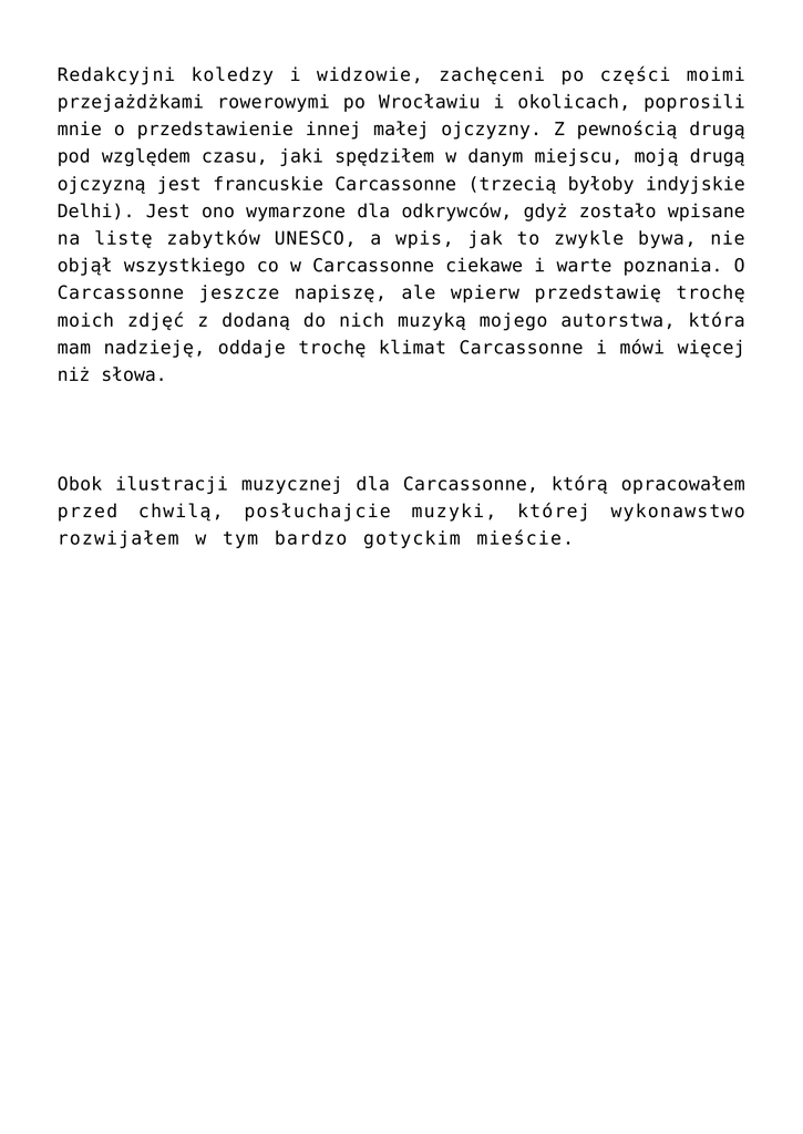 Redakcyjni koledzy i widzowie, zachęceni po części moimi przejażdżkami rowerowymi po Wrocławiu i okolicach, poprosili mnie o przedstawienie innej małej ojczyzny. Z pewnością drugą pod względem czasu, jaki spędziłem w danym miejscu, moją drugą ojczyzną jest francuskie Carcassonne (trzecią byłoby indyjskie Delhi). Jest ono wymarzone dla odkrywców, gdyż zostało wpisane na listę zabytków UNESCO, a wpis, jak to zwykle bywa, nie objął wszystkiego co w Carcassonne ciekawe i warte poznania. O Carcassonne jeszcze napiszę, ale wpierw przedstawię trochę moich zdjęć z dodaną do nich muzyką mojego autorstwa, która mam nadzieję, oddaje trochę klimat Carcassonne i mówi więcej niż słowa. Obok ilustracji muzycznej dla Carcassonne, którą opracowałem przed chwilą, posłuchajcie muzyki, której wykonawstwo rozwijałem w tym bardzo gotyckim mieście.