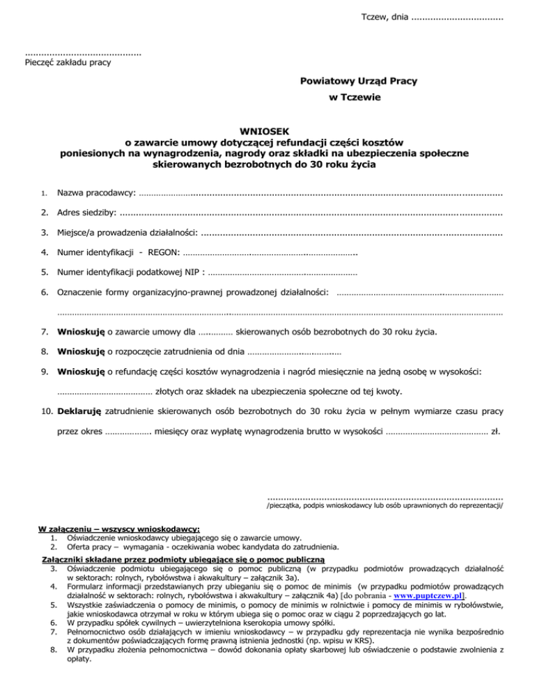 Tczew, dnia .................................. ........................................... Pieczęć zakładu pracy Powiatowy Urząd Pracy w Tczewie WNIOSEK o zawarcie umowy dotyczącej refundacji części kosztów poniesionych na wynagrodzenia, nagrody oraz składki na ubezpieczenia społeczne skierowanych bezrobotnych do 30 roku życia 1. Nazwa pracodawcy: …………………................................................................................................................... 2. Adres siedziby: ............................................................................................................................................. 3. Miejsce/a prowadzenia działalności: ............................................................................................................... 4. Numer identyfikacji - REGON: ……………………….…………………..……………….. 5. Numer identyfikacji podatkowej NIP : ………………………………….………………… 6. Oznaczenie formy organizacyjno-prawnej prowadzonej działalności: ……………………………………..…………………… ……………………………………………………………..………………………………………………………………………………………………… 7. Wnioskuję o zawarcie umowy dla …..……… skierowanych osób bezrobotnych do 30 roku życia. 8. Wnioskuję o rozpoczęcie zatrudnienia od dnia …………………..….……..… 9. Wnioskuję o refundację części kosztów wynagrodzenia i nagród miesięcznie na jedną osobę w wysokości: ………………………………… złotych oraz składek na ubezpieczenia społeczne od tej kwoty. 10. Deklaruję zatrudnienie skierowanych osób bezrobotnych do 30 roku życia w pełnym wymiarze czasu pracy przez okres ………………. miesięcy oraz wypłatę wynagrodzenia brutto w wysokości …………………………………… zł. ....................................................................................... /pieczątka, podpis wnioskodawcy lub osób uprawnionych do reprezentacji/ W załączeniu – wszyscy wnioskodawcy: 1. Oświadczenie wnioskodawcy ubiegającego się o zawarcie umowy. 2. Oferta pracy – wymagania - oczekiwania wobec kandydata do zatrudnienia. Załączniki składane przez podmioty ubiegające się o pomoc publiczną 3. Oświadczenie podmiotu ubiegającego się o pomoc publiczną (w przypadku podmiotów prowadzących działalność w sektorach: rolnych, rybołówstwa i akwakultury – załącznik 3a). 4. Formularz informacji przedstawianych przy ubieganiu się o pomoc de minimis (w przypadku podmiotów prowadzących działalność w sektorach: rolnych, rybołówstwa i akwakultury – załącznik 4a) [do pobrania - www.puptczew.pl]. 5. Wszystkie zaświadczenia o pomocy de minimis, o pomocy de minimis w rolnictwie i pomocy de minimis w rybołówstwie, jakie wnioskodawca otrzymał w roku w którym ubiega się o pomoc oraz w ciągu 2 poprzedzających go lat. 6. W przypadku spółek cywilnych – uwierzytelniona kserokopia umowy spółki. 7. Pełnomocnictwo osób działających w imieniu wnioskodawcy – w przypadku gdy reprezentacja nie wynika bezpośrednio z dokumentów poświadczających formę prawną istnienia jednostki (np. wpisu w KRS). 8. W przypadku złożenia pełnomocnictwa – dowód dokonania opłaty skarbowej lub oświadczenie o podstawie zwolnienia z opłaty. POUCZENIE: 1. W celu właściwego wypełnienia wniosku należy zapoznać się z poniższym pouczeniem, w razie dalszych wątpliwości kontaktować się z pracownikiem merytorycznym. 2. Wniosek należy wypełnić czytelnie, wszystkie wykropkowane pola winny być wypełnione. 3. Wniosek winien być podpisany przez umocowanego przedstawiciela lub przedstawicieli wnioskodawcy. 4. Złożenie wniosku nie gwarantuje zawarcia umowy. Z wnioskiem o zawarcie umowy dotyczącej refundacji części kosztów poniesionych na wynagrodzenia, nagrody oraz składki na ubezpieczenia społeczne skierowanych osób bezrobotnych do 30 roku życia może wystąpić pracodawca lub przedsiębiorca. Refundacja dotyczy części kosztów poniesionych na wynagrodzenia, nagrody oraz składki na ubezpieczenia społeczne przez 12 miesięcy, a jej wysokość nie może przekroczyć minimalnego wynagrodzenia za pracę. Po okresie refundacji pracodawca lub przedsiębiorca zobowiązany jest do dalszego utrzymania zatrudnienia w pełnym wymiarze czasu pracy skierowanego bezrobotnego przez okres kolejnych 12 miesięcy. Starosta nie może zawrzeć umowy z pracodawcą, u którego w okresie ostatnich 6 miesięcy przed złożeniem wniosku nastąpiło zmniejszenie zatrudnienia z przyczyn dotyczących zakładu pracy. Przyczyny dotyczące zakładu pracy – oznacza to: a) rozwiązanie stosunku pracy lub stosunku służbowego z przyczyn niedotyczących pracowników, zgodnie z przepisami o szczególnych zasadach rozwiązywania z pracownikami stosunków pracy z przyczyn niedotyczących pracowników lub zgodnie z przepisami ustawy z dnia 26 czerwca 1974 r. – Kodeks pracy, w przypadku rozwiązania stosunku pracy lub stosunku służbowego z tych przyczyn u pracodawcy zatrudniającego mniej niż 20 pracowników, b) rozwiązanie stosunku pracy lub stosunku służbowego z powodu ogłoszenia upadłości pracodawcy, jego likwidacji lub likwidacji stanowiska pracy z przyczyn ekonomicznych, organizacyjnych, produkcyjnych albo technologicznych, c) wygaśnięcie stosunku pracy lub stosunku służbowego w przypadku śmierci pracodawcy lub gdy odrębne przepisy przewidują wygaśnięcie stosunku pracy lub stosunku służbowego w wyniku przejścia zakładu pracy lub jego części na innego pracodawcę i niezaproponowania przez tego pracodawcę nowych warunków pracy i płacy, d) rozwiązanie stosunku pracy przez pracownika na podstawie art. 55 § 11 ustawy z dnia 26 czerwca 1974 r. – Kodeks pracy z uwagi na ciężkie naruszenie