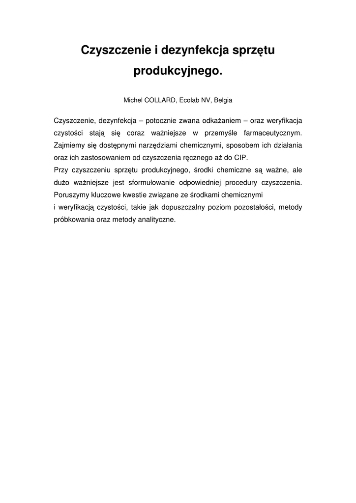 Czyszczenie i dezynfekcja sprzętu produkcyjnego. Michel COLLARD, Ecolab NV, Belgia Czyszczenie, dezynfekcja – potocznie zwana odkażaniem – oraz weryfikacja czystości stają się coraz ważniejsze w przemyśle farmaceutycznym. Zajmiemy się dostępnymi narzędziami chemicznymi, sposobem ich działania oraz ich zastosowaniem od czyszczenia ręcznego aż do CIP. Przy czyszczeniu sprzętu produkcyjnego, środki chemiczne są ważne, ale dużo ważniejsze jest sformułowanie odpowiedniej procedury czyszczenia. Poruszymy kluczowe kwestie związane ze środkami chemicznymi i weryfikacją czystości, takie jak dopuszczalny poziom pozostałości, metody próbkowania oraz metody analityczne.