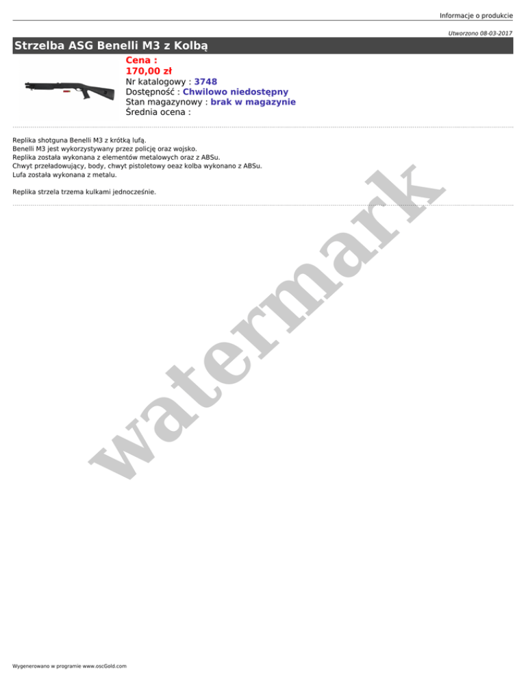Informacje o produkcie Utworzono 08-03-2017 Strzelba ASG Benelli M3 z Kolbą Cena : 170,00 zł Nr katalogowy : 3748 Dostępność : Chwilowo niedostępny Stan magazynowy : brak w magazynie Średnia ocena : Replika shotguna Benelli M3 z krótką lufą. Benelli M3 jest wykorzystywany przez policję oraz wojsko. Replika została wykonana z elementów metalowych oraz z ABSu. Chwyt przeładowujący, body, chwyt pistoletowy oeaz kolba wykonano z ABSu. Lufa została wykonana z metalu. w at er m ar k Replika strzela trzema kulkami jednocześnie. Wygenerowano w programie www.oscGold.com