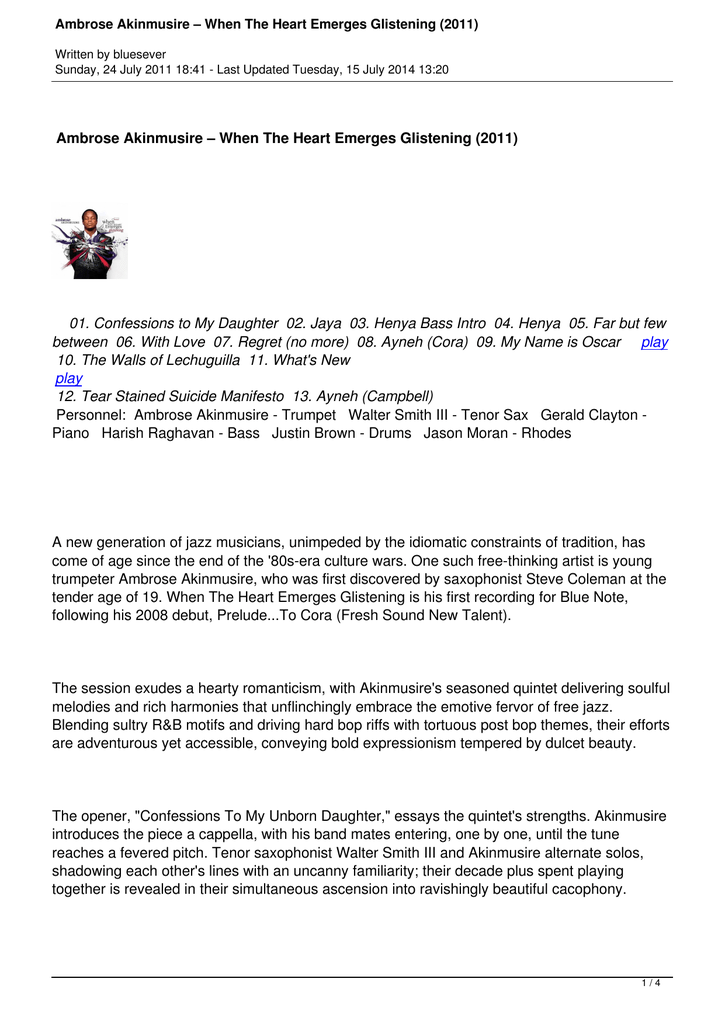 Ambrose Akinmusire – When The Heart Emerges Glistening (2011) Written by bluesever Sunday, 24 July 2011 18:41 - Last Updated Tuesday, 15 July 2014 13:20 Ambrose Akinmusire – When The Heart Emerges Glistening (2011) 01. Confessions to My Daughter 02. Jaya 03. Henya Bass Intro 04. Henya 05. Far but few between 06. With Love 07. Regret (no more) 08. Ayneh (Cora) 09. My Name is Oscar play 10. The Walls of Lechuguilla 11. What's New play 12. Tear Stained Suicide Manifesto 13. Ayneh (Campbell) Personnel: Ambrose Akinmusire - Trumpet Walter Smith III - Tenor Sax Gerald Clayton Piano Harish Raghavan - Bass Justin Brown - Drums Jason Moran - Rhodes A new generation of jazz musicians, unimpeded by the idiomatic constraints of tradition, has come of age since the end of the '80s-era culture wars. One such free-thinking artist is young trumpeter Ambrose Akinmusire, who was first discovered by saxophonist Steve Coleman at the tender age of 19. When The Heart Emerges Glistening is his first recording for Blue Note, following his 2008 debut, Prelude...To Cora (Fresh Sound New Talent). The session exudes a hearty romanticism, with Akinmusire's seasoned quintet delivering soulful melodies and rich harmonies that unflinchingly embrace the emotive fervor of free jazz. Blending sultry R&B motifs and driving hard bop riffs with tortuous post bop themes, their efforts are adventurous yet accessible, conveying bold expressionism tempered by dulcet beauty. The opener, "Confessions To My Unborn Daughter," essays the quintet's strengths. Akinmusire introduces the piece a cappella, with his band mates entering, one by one, until the tune reaches a fevered pitch. Tenor saxophonist Walter Smith III and Akinmusire alternate solos, shadowing each other's lines with an uncanny familiarity; their decade plus spent playing together is revealed in their simultaneous ascension into ravishingly beautiful cacophony. 1/4 Ambrose Akinmusire – When The Heart Emerges Glistening (2011) Written by bluesever Sunday, 24 July 2011 18:41 - Last Updated Tuesday, 15 July 2014 13:20 While Akinmusire and Smith elevate the bandstand with their spirited interplay, the rhythm section of Gerald Clayton (piano), Harish Ragahvan (bass) and Justin Brown (drums) fashions an endlessly shifting mosaic of tasteful accents, pulsating downbeats and clever harmonic interpolations. Expanding and contracting tempos and time signatures throughout the date, they ply fluid variations on traditional trio dynamics with ceaseless forward momentum. After the rousing opener, the band tears through the similarly energetic "Jaya," before revealing a more introspective side. The ethereal "Henya" demonstrates the quintet's capacity for lush cinematic detail, with an effervescent guest spot from producer Jason Moran on Fender Rhodes. The remaining pieces veer between similar extremes, from the punchy swinger "Far But Few Between" and anthem-like "The Walls of Lechuguilla," to the simmering ballad "With Love" and the rhapsodic meditation "Tear Stained Suicide Manifesto." Only "My Name Is Oscar" falls short of expectations—a conceptually interesting drum duet/spoken word tribute to Oscar Grant that is well-intentioned, but emotionally detached. More successful is Akinmusire's duet with Clayton on the standard "What's New," which clarifies the trumpeter's position in the jazz continuum as a forward thinking individualist with deep roots in the tradition. Bridging the divide between inside and outside aesthetics, Akinmusire's virtuosity encompasses numerous approaches, from poignant lyricism to abstract tonal manipulations. His ability to seamlessly integrate extended techniques into architecturally sound statements is one of the date's most compelling features, as he effortlessly bends, blurs and distorts notes between velvety consonance and bristling dissonance. When The Heart Emerges Glistening is a significant statement from an up and coming artist whose impressive abilities as an improviser and composer suggest potential greatness in the future. ---Troy Collins, allaboutjazz.com For his octave-vaulting lines and incandescent high-end tones, 28-year-old California-born trumpeter Ambrose Akinmusire suggests connections with Norwegian ambient-brass virtuoso Arve Henriksen. But this is American jazz, and the newcomer already sounds like a redefining force in that sphere. Akinmusire honed his craft with sax trailblazer Steve Coleman, and this music echoes that, and also the work of the album's producer, Jason Moran. But Akinmusire's arresting sound and the collective strength of his band of long-time friends – the dry-toned, Wayne Shorter-like saxophonist Walter Smith III, pianist Gerald Clayton, bassist Harish 2/4 Ambrose Akinmusire – When The Heart Emerges Glistening (2011) Written by bluesever Sunday, 24 July 2011 18:41 - Last Updated Tuesday, 15 July 2014 13:20 Raghavan and drummer Justin Brown – power it all. Passages of minimally accompanied trumpet are masterpieces of patient development, as is the ensemble ballad Henya, with its deliberate, slow-blown dissonance in an otherwise mellifluous theme. Akinmusire's empathy with tenorist Smith gives an updated Miles Davis/Wayne Shorter atmosphere to jolting faster pieces such as Jaya, and the bass and drums pairing nails everything with steely relish. Get used to pronouncing ah-kin-MOO-sir-ee: we're all going to be saying it a lot. --- John Fordham, guardian.co.uk Spotkałem się z opiniami, jakobym osiągnął więcej, niż zasłużyłem samą grą – przyznał trzy lata temu Ambrose Akinmusire po kolejnym wygranym konkursie dla młodych trębaczy. Jakże bolesną dla sceptyków musiała być w takim razie decyzja Amerykańskiego Zrzeszenia Krytyków Jazzowych (JJA), które w połowie czerwca ogłosiło Akinmusire wschodzącą gwiazdą gatunku. „When the Heart Emerges Glistening” to debiut 29-latka z Oakland w wytwórni Blue Note oraz jego druga autorska płyta w ogóle. Zawodowo grywa jednak od dzie