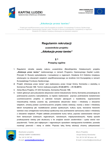 „Edukacja przez taniec" Projekt jest współfinansowany przez Unię Europejską ze środków Europejskiego Funduszu Społecznego w ramach Programu Operacyjnego Kapitał Ludzki, Priorytet IX Rozwój wykształcenia i kompetencji w regionach Działanie 9.5 Oddolne Inicjatywy edukacyjne na obszarach wiejskich __________________________________________________________________________________________________________ Regulamin rekrutacji uczestników projektu „Edukacja przez taniec” §1 Przepisy ogólne 1. Regulamin określa zasady naboru uczestników (Beneficjentów Ostatecznych) projektu „Edukacja przez taniec” realizowanego w ramach Programu Operacyjnego Kapitał Ludzki, Priorytet IX Rozwój wykształcenia i kompetencji w regionach, Działanie 9.5 Oddolne inicjatywy edukacyjne na obszarach wiejskich współfinansowanego ze środków Unii Europejskiej w ramach Europejskiego Funduszu Społecznego. 2. Projekt „Edukacja przez taniec” jest realizowany przez Urząd Gminy Somianka z siedzibą w Somiance-Parcele 16B. Termin realizacji projektu 01.04.2011r. – 31.10.2011r. 3. Adres Biura Projektu: 07-203 Somianka, Somianka-Parcele 16B. 4. Celem głównym jest pobudzenie aktywności wśród mieszkańców Gminy Somianka prowadzącej do podnoszenia poziomu wykształcenia, co będzie realizowane poprzez podniesienie świadomości uczniów/uczennic projektu w zakresie korzyści płynących z kształcenia, wypracowanie indywidualnej metody uczenia się, podniesienie aktywności dzieci i młodzieży z obszarów wiejskich, zmianę postaw uczniów/uczennic projektu wobec edukacji, rozwój u dzieci i młodzieży takich kompetencji jak: kształtowanie postaw społecznych, kultury życia, tworzenia hierarchii wartości oraz umiejętności komunikacji społecznej oraz podniesienie samooceny dzieci i młodzieży z obszarów wiejskich. Projekt zakłada prowadzenie kursu tańca, poprzez zastosowanie różnych form tanecznych (ludowych, regionalnych, narodowych, międzynarodowych). Każdy sposób przekazywania wiedzy jest skuteczny o ile znajdzie swoich zwolenników i zyska wśród nich popularność. Taniec jest najlepszym i najprostszym sposobem nawiązywania kontaktów, pozwala rozwinąć pewność i wiarę w siebie. Poprzez taką formę edukacji chcemy zaktywizować _______________________________________________________________________________________________________________________ Realizator projektu Biuro Projektu URZĄD GMINY SOMIANKA Urząd Gminy Somianka Tel. 29 74 187 90 Tel. 29 74 187 90 wew. 49 E-mail: [email protected] E-mail: [email protected] „Edukacja przez taniec" Projekt jest współfinansowany przez Unię Europejską ze środków Europejskiego Funduszu Społecznego w ramach Programu Operacyjnego Kapitał Ludzki, Priorytet IX Rozwój wykształcenia i kompetencji w regionach Działanie 9.5 Oddolne Inicjatywy edukacyjne na obszarach wiejskich __________________________________________________________________________________________________________ współczesną młodzież i dzieci z naszej gminy i przekonać ich, że zdobywanie wiedzy jest bardzo ważnym i nieodłącznym elementem naszego życia społecznego. 5. W ramach projektu zaplanowano realizację szkolenia z zakresu nauki tańca ludowego, uzupełnionego o prezentację dorobku kulturowego regionu oraz gwarę, plus naukę tańców innych narodów dla 32 osób w tym 16 dziewcząt i 16 chłopców. Kurs tańca będzie trwał 6 miesiące po 4 spotkania w miesiącu (zajęcia będą 2 godzinne). §2 Kryteria (warunki) uczestnictwa w projekcie 1. Uczestnikami projektu mogą być osoby spełniające następujące kryteria formalne: o zamieszkujące na terenie Gminy Somianka; o osoby w wieku od 10 do 16 lat; o osoby uczęszczające do jednej ze szkół na terenie Gminy Somianka (pierwszeństwo będą miały osoby pochodzące z rodzin wielodzietnych o niskich dochodach); o osoby pierwszy raz przystępujące do kursu tańca. 2. Warunkiem uczestnictwa w kursie tańca jest zakwalifikowanie przez Koordynatorkę Projektu. §3 Procedura rekrutacji 1. Rekrutacji uczestników dokona Asystentka Projektu we współpracy z Koordynatorką Projektu. 2. Nabór do projektu przeprowadzony będzie w terminie od 26 kwietnia 2011r. do 29 kwietnia 2011r. w godzinach 16.00 – 18.00. W sytuacji, gdy do udziału w projekcie zgłosi się więcej osób spełniających kryteria formalne (§ 2) niż ilość przewidzianych miejsc, to Asystentka Projektu weźmie pod uwagę datę wpływu zgłoszenia do Biura Projektu - Urząd Gminy w Somiance, pokój nr 10 (kolejność zgłoszeń). 3. Procedura rekrutacji obejmuje: nabór dokonany zostanie na podstawie Ankiety Zgłoszenia, której Wzór dostępny jest na stronie internetowej www.somianka.pl lub w Biurze Projektu - Urząd Gminy Somianka, SomiankaParcele 16B, 07-203 Somianka; _______________________________________________________________________________________________________________________ Realizator projektu Biuro Projektu URZĄD GMINY SOMIANKA Urząd Gminy Somianka Tel. 29 74 187 90 Tel. 29 74 187 90 wew. 49 E-mail: [email protected] E-mail: [email protected] „Edukacja przez taniec" Projekt jest współfinansowany przez Unię Europejską ze środków Europejskiego Funduszu Społecznego w ramach Programu Operacyjnego Kapitał Ludzki, Priorytet IX Rozwój wykształcenia i kompetencji w regionach Działanie 9.5 Oddolne Inicjatywy edukacyjne na obszarach wiejskich __________________________________________________________________________________________________________ podpisaną Ankietę Zgłoszenia należy dostarczyć osobiście w godzinach 16.00 – 18.00, listem poleconym lub pocztą kurierską do Biura Projektu - Urząd Gminy w Somiance, Somianka-Parcele 16B, 07-203 Somianka (Ankiety Zgłoszenia przesłane faksem lub pocztą elektroniczną nie będą honorowane z uwagi na wymóg dotyczący oryginału podpisu na dokumencie rekrutacyjnym); w/w Ankiety dostarczone po godzinie 18.00 dnia 29 kwietnia 2011r. nieza