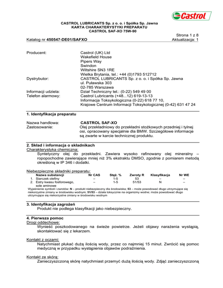 CASTROL LUBRICANTS Sp. z o. o. i Spółka Sp. Jawna KARTA CHARAKTERYSTYKI PREPARATU CASTROL SAF-XO 75W-90 Strona 1 z 8 Aktualizacja: 1 Katalog nr 450547-DE01/SAFXO Producent: Dystrybutor: Informacji udziela: Telefon alarmowy: Castrol (UK) Ltd Wakefield House Pipers Way Swindon Wiltshire SN3 1RE Wielka Brytania, tel.: +44 (0)1793 512712 CASTROL LUBRICANTS Sp. z o. o. i Spółka Sp. Jawna ul. Puławska 303 02-785 Warszawa Dział Techniczny tel.: (0-22) 549 49 00 Castrol Lubricants (+48...12) 619-13-13 Informacja Toksykologiczna (0-22) 618 77 10, Krajowe Centrum Informacji Toksykologicznej (0-42) 631 47 24 1. Identyfikacja preparatu Nazwa handlowa: Zastosowanie: CASTROL SAF-XO Olej przekładniowy do przekładni stożkowych przedniej i tylnej osi, opracowany specjalnie dla BMW. Szczegółowe informacje są zwarte w karcie technicznej produktu. 2. Skład i informacja o składnikach Charakterystyka chemiczna: Syntetyczny olej do przekładni. Zawiera wysoko rafinowany olej mineralny – ropopochodne zawierające mniej niż 3% ekstraktu DMSO, zgodnie z pomiarem metodą określoną w IP 346 i dodatki. Niebezpieczne składniki preparatu: Nazwa substancji 1. Siarczek olefiny 2. Estry kwasu fosforowego, sole aminowe Nr CAS – – Stęż. % 1-5 1-5 Zwroty R 53 51/53 Klasyfikacja – N Nr WE – – Wyjaśnienie symboli i zwrotów: N – produkt niebezpieczny dla środowiska; 53 – może powodować długo utrzymujące się niekorzystne zmiany w środowisku wodnym; 51/53 – działa toksycznie na organizmy wodne; może powodować długo utrzymujące się niekorzystne zmiany w środowisku wodnym 3. Identyfikacja zagrożeń Produkt nie podlega klasyfikacji jako niebezpieczny. 4. Pierwsza pomoc Drogi oddechowe: Wynieść poszkodowanego na świeże powietrze. Jeżeli objawy narażenia wystąpią, skontaktować się z lekarzem. Kontakt z oczami: Natychmiast płukać dużą ilością wody, przez co najmniej 15 minut. Zwrócić się pomoc medyczną w przypadku wystąpienia objawów podrażnienia. Kontakt ze skórą: Zanieczyszczoną skórę natychmiast przemyć dużą ilością wody. Zdjąć zanieczyszczoną CASTROL LUBRICANTS Sp. z o. o. i Spółka Sp. Jawna KARTA CHARAKTERYSTYKI PREPARATU CASTROL SAF-XO 75W-90 Katalog nr 450547-DE01/SAFXO Strona 2 z 8 Aktualizacja: 1 odzież i buty. W przypadku wystąpienia objawów podrażnienia, skontaktować się z lekarzem. Zanieczyszczoną odzież i buty oczyścić przed ponownym użyciem. Połknięcie: W przypadku połknięcia dużej dawki preparatu natychmiast wezwać pomoc medyczną. Nie wywoływać wymiotów bez konsultacji z lekarzem. Jeśli poszkodowany jest nieprzytomny nie podawać nic do picia. Wskazówki ogólne: Wskazówki dla lekarza: postępowanie objawowe. 5. Postępowanie w przypadku pożaru Odpowiednie środki gaśnicze: Woda – rozproszone prądy wodne, dwutlenek węgla, proszki gaśnicze, gaśnice pianowe. Środki gaśnicze, których nie wolno używać ze względów bezpieczeństwa: Nie stosować zwartych strumieni wody. Szczególne zagrożenia: Nieznane. Niebezpieczne produkty rozkładu: Możliwe jest powstanie ditlenku węgla (CO2), tlenku węgla (CO). Specjalne wyposażenie ochronne dla strażaków: Podczas pożaru mogą powstawać substancje szkodliwe dla zdrowia. Nałożyć odzież ochronną gazoszczelną i aparat izolujący drogi oddechowe (aparat tlenowy skompletowany z maską). Inne informacje: Woda skażona środkami gaśniczymi musi być usuwana jako odpad niebezpieczny. Zanieczyszczoną wodę nie wlewać do kanalizacji. Zawiadomić otoczenie o pożarze. Usunąć z obszaru zagrożenia wszystkie osoby niebiorące udziału w likwidowaniu pożaru. Powiadomić Państwową Straż Pożarną, a w razie konieczności także Policję Państwową, najbliższe władze terenowe i najbliższą jednostkę Ratownictwa Chemicznego. 6. Postępowanie w przypadku niezamierzonego uwolnienia do środowiska Indywidualne środki ostrożności: Środki ochrony indywidualnej jak podano w punkcie 8. Środki ostrożności w zakresie ochrony środowiska: W razie awarii nie dopuszczać do zrzutów do środowiska. Zabezpieczyć produkt przed przedostaniem się do kanałów ściekowych, wód powierzchniowych i gruntowych oraz do gleby. Próbować zebrać jak tylko to możliwe, do odpowiednich pojemników celem dalszej utylizacji. CASTROL LUBRICANTS Sp. z o. o. i Spółka Sp. Jawna KARTA CHARAKTERYSTYKI PREPARATU CASTROL SAF-XO 75W-90 Strona 3 z 8 Aktualizacja: 1 Katalog nr 450547-DE01/SAFXO Metody oczyszczania: Czynności mogą być podejmowane tylko przy pełnym zabezpieczeniu – gogle chroniące przed kroplami cieczy, ubranie ochronne, buty, rękawice. Jeżeli to możliwe, zlikwidować wyciek (zamknąć dopływ cieczy, uszczelnić, uszkodzone opakowanie umieścić w szczelnym opakowaniu ochronnym); w razie dużego wycieku miejsce gromadzenia się cieczy obwałować, zebraną ciecz odpompować; małe ilości rozlanej cieczy przysypać obojętnym materiałem chłonnym, zebrać do zamykanego pojemnika; usuwać jako odpad niebezpieczny. 7. Obchodzenie się z produktem i magazynowanie Obchodzenie się z produktem: Myć ręce zawsze po kontakcie z preparatem i przed jedzeniem. Stanowiska pracy powinny być wyposażone w prysznic i urządzenie do płukania oczu. Zabezpieczenia przed pożarem i wybuchem: Nie dotyczy. Magazynowanie: Opakowania, gdy nie są używane, przechowywać zamknięte. Przechowywać w miejscach chłodnych, dobrze wentylowanych. Inne informacje: Przechowywać zawsze w oryginalnych opakowaniach. Nie używać zanieczyszczonych, pustych opakowań do innych celów. 8. Kontrola narażenia i środki ochrony indywidualnej Wskazówki dodatkowe odnośnie wymogów stawianych urządzeniom technicznym: Niezbędna jest skuteczna wentylacja miejscowa wywiewna oraz wentylacja ogólna pomieszczenia w celu zmniejszenie stopnia narażenia pracowników. Substancje szkodliwe, kontrolować: wartości najwyższych Nazwa substancji 1. Oleje mineralne – (faza ciekła aerozol