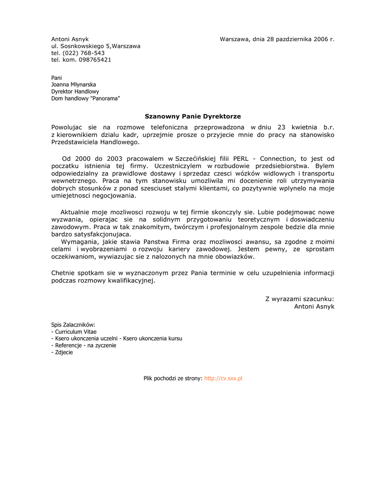 Antoni Asnyk ul. Sosnkowskiego 5,Warszawa tel. (022) 768-543 tel. kom. 098765421 Warszawa, dnia 28 pazdziernika 2006 r. Pani Joanna Młynarska Dyrektor Handlowy Dom handlowy "Panorama" Szanowny Panie Dyrektorze Powolujac sie na rozmowe telefoniczna przeprowadzona w dniu 23 kwietnia b.r. z kierownikiem dzialu kadr, uprzejmie prosze o przyjecie mnie do pracy na stanowisko Przedstawiciela Handlowego. Od 2000 do 2003 pracowalem w Szczećińskiej filii PERL - Connection, to jest od poczatku istnienia tej firmy. Uczestniczylem w rozbudowie przedsiebiorstwa. Bylem odpowiedzialny za prawidlowe dostawy i sprzedaz czesci wózków widlowych i transportu wewnetrznego. Praca na tym stanowisku umozliwila mi docenienie roli utrzymywania dobrych stosunków z ponad szesciuset stalymi klientami, co pozytywnie wplynelo na moje umiejetnosci negocjowania. Aktualnie moje mozliwosci rozwoju w tej firmie skonczyly sie. Lubie podejmowac nowe wyzwania, opierajac sie na solidnym przygotowaniu teoretycznym i doswiadczeniu zawodowym. Praca w tak znakomitym, twórczym i profesjonalnym zespole bedzie dla mnie bardzo satysfakcjonujaca. Wymagania, jakie stawia Panstwa Firma oraz mozliwosci awansu, sa zgodne z moimi celami i wyobrazeniami o rozwoju kariery zawodowej. Jestem pewny, ze sprostam oczekiwaniom, wywiazujac sie z nalozonych na mnie obowiazków. Chetnie spotkam sie w wyznaczonym przez Pania terminie w celu uzupelnienia informacji podczas rozmowy kwalifikacyjnej. Z wyrazami szacunku: Antoni Asnyk Spis Zalaczników: - Curriculum Vitae - Ksero ukonczenia uczelni - Ksero ukonczenia kursu - Referencje - na zyczenie - Zdjecie Plik pochodzi ze strony: http://cv.sxx.pl