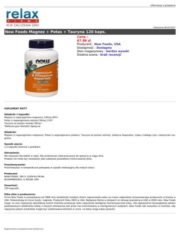 Informacje o produkcie Utworzono 08-03-2017 Now Foods Magnez + Potas + Tauryna 120 kaps. Cena : 67.99 zł Producent : Now Foods, USA Dostępność : Dostępny Stan magazynowy : bardzo wysoki Średnia ocena : brak recenzji SUPLEMENT DIETY Składniki 1 kapsułki: Magnez (z asparaginianu magnezu) 150mg 40%* Potas (z asparaginianiu potasu) 50mg 2,5%* Tauryna (w postaci wolnej) 50mg * *Referencyjne Wartości Spożycia Składniki: Magnez (z asparaginianu magnezu), Potas (z asparaginianiu potasu), Tauryna (w postaci wolnej), żelatyna (kapsułka), mąka z białego ryżu i stearynian magnezu. Sposób użycia: 1-2 kapsułki dziennie z posiłkiem. Ostrzeżenie: Nie stosować dla kobiet w ciąży. Nie przekraczać zalecanej porcji do spożycia w ciągu dnia. Produkt nie może być stosowany jako substytut prawidłowo zróżnicowanej diety. Przechowywanie: Przechowywać w temperaturze pokojowej w sposób niedostępny dla małych dzieci. Producent: NOW FOODS, 395 S. GLEN ELLYN Rd. BLOOMINGDALE, IL 60108, USA Zawartość: 120 kapsułek Kilka słów o producencie: Firma Now Foods w prowadzonej od 1968 roku działalności każdym dniem zapracowała sobie na miano najbardziej renomowanego producenta w branży w USA. Potwierdzają to liczne tytuły i nagrody: Producent Roku 2003 w USA, Najlepsza Marka w sklepach ze zdrową żywnością w USA w 2004 roku. Now Foods mając na celu najwyższą satysfakcję swoich klientów produkuje tylko najwyższej dostępnej farmaceutycznej klasy. Dla zapewnienia bezwzględnej jakości podstawowych składników każdy z naszych dostawców jest przez nas kontrolowany w nieregularnych audytach. Now Foods robi wszystko co możliwe, aby najwyższa jakość produktów mogła być zaoferowana klientom w cenie, na którą mogą sobie pozwolić. Wygenerowano w programie www.oscGold.com