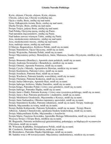 Litania Narodu Polskiego Kyrie, elejson, Chryste, elejson, Kyrie, elejson. Chryste, usłysz nas, Chryste wysłuchaj nas. Ojcze z nieba, Boże, zmiłuj się nad nami. Synu, Odkupicielu świata, Boże, zmiłuj się nad nami. Duchu Święty, Boże, zmiłuj się nad nami. Święta Trójco, jedyny Boże, zmiłuj się nad nami. Nad Polską, Ojczyzną naszą, zmiłuj się Panie. Nad narodem męczenników, zmiłuj się Panie. Nad ludem zawsze wiernym Tobie, zmiłuj się Panie. Jezu, nieskończenie miłosierny, zmiłuj się nad nami. Jezu, nieskończenie mocny, zmiłuj się nad nami. Jezu, nadziejo nasza, zmiłuj się nad nami. O Maryjo, Bogurodzico, Królowo Polski, módl się za nami. Święty Stanisławie, Ojcze Ojczyzny, módl się za nami. Święty Wojciechu, Patronie Polski, módl się za nami. Święci Męczennicy polscy: Benedykcie, Janie, Mateuszu, Izaaku i Krystynie, módlcie się za nami. Święty Brunonie (Bonifacy), Apostole ziem polskich, módl się za nami. Święty Andrzeju Świeradzie i Benedykcie, módlcie się za nami. Święty Ottonie, Apostole Pomorza, módl się za nami. Święty Cyrylu i Metody, Apostołowie Słowian, módlcie się za nami. Święty Kazimierzu, Patronie Litwy, módl się za nami. Święty Jozafacie, Patronie Rusi, módl się za nami. Święty Wacławie, Patronie katedry wawelskiej, módl się za nami. Święty Florianie, Patronie Krakowa, módl się za nami. Święty Jacku Odrowążu, Apostole Rusi, módl się za nami. Święta Jadwigo, królowo, Matko Narodów, módl się za nami. Święta Kingo, Patronko Polski i Litwy oraz górników, módl się za nami. Święta Jadwigo, Patronko Śląska, módl się za nami. Święty Janie z Dukli, Patronie Korony i Litwy oraz rycerstwa polskiego, módl się za nami. Święty Janie z Kęt, Patronie profesorów i studentów, módl się za nami. Święty Melchiorze Grodziecki, Męczenniku z Koszyc, módl się za nami. Święty Janie Sarkandrze, Obrońco tajemnicy spowiedzi, módl się za nami. Święty Stanisławie Kostko, Patronie młodzieży, módl się za nami. Święty Andrzeju Bobola, Męczenniku za wiarę, módl się za nami. Święty Rafale Kalinowski, Patronie Sybiraków, módl się za nami. Święty Bracie Albercie, Adamie Chmielowski, opiekunie biedoty krakowskiej, módl się za nami. Święty Maksymilianie Kolbe, Męczenniku z Auschwitz Święta Mario, Faustyno Kowalska, Apostołko Bożego Miłosierdzia, módl się za nami. Wszyscy Święci i Święte Boże, módlcie się za nami. Bł. Bogumile, Patronie archidiecezji gnieżnieńskiej, pokutujący za błądzących wyznawców Chrystusa, módl się za nami. Bł. Wincenty Kadłubku, Dziejopisarzu Polski, módl się za nami. Bł. Czesławie, Patronko Wrocławia, módl się za nami. Bł. Bronisławo, Patronko Śląska Opolskiego, módl się za nami. Bł. Sadoku wraz z 48 towarzyszami. Męczennicy sandomierscy, módlcie się za nami. Bł. Salomeo, wdowo i klarysko, Księżno Halicka, módl się za nami. Bł. Jolento zwana Heleną, Patronko Gniezna, módl się za nami. Bł. Doroto z Mątowów, Patronko diecezji chełmińskiej, módl się za nami. Bł. Jakubie Strepa (Strzemię), Patronie Lwowa, módl się za nami. Bł. Szymonie z Lipnicy, Kaznodziejo prawdy, módl się za nami. Bł. Stanisławie Kazimierczyku, duszpasterzu krakowski, módl się za nami. Bł. Władysławie z Gielniowa, Patronie Warszawy, módl się za nami. Bł. Regino Protman, Wyznawczyni Chrystusa w Najświętszym Sakramencie, módl się za nami. Bł. Rafale Chyliński, Patronie ubogich i chorych, módl się za nami. Bł. Edmundzie Bojanowski, Święty apostole ludu, módl się za nami. v Bł. Wincenty Lewoniuku wraz z XII towarzyszami, Męczennicy uniccy z Pratulina, módlcie się za nami. Bł. Mario, Anielo Truszkowska, Patronko doskonalszego posłuszeństwa Bogu, módl się za nami. Bł. Franciszko Siedliska, Apostołko życia Najświętszej Rodziny z Nazaretu, módl się za nami. v Bł. Mario, Marcelino Darowska, Apostołko Bożej obecności w działaniu, módl się za nami. Bł. Karolino Kózka, Dziewicza męczennico, módl się za nami. Bł. Wacławie, Honoracie Koźmiński, Obdarzony darem Bożego powołania, módl się za nami. Bł. Anielo Salawa, Tercjanko frańciszkańska, módl się za nami. Bł. Mario Tereso Ledóchowska, Matko Afrykanów, módl się za nami. Bł. Józefie, Sebastianie Pelczarze, Pasterzu Kościoła Przemyskiego, módl się za nami. Bł. Bernardyno, Mario Jabłońska, Patronko opuszczonych i nieszczęśliwych ludzi, módl się za nami. Bł. Mario Karłowska, Apostołko zagubionych moralnie, módl się za nami Bł. Jerzy, Bolesławie Matulewiczu (Matulaitisie), Niestrudzony Sługo Kościoła, módl się za nami. Bł. Urszulo, Julio Ledóchowska, Apostołko Służby Bożej, módl się za nami. Bł. Michale Kozalu, Męczenniku obozów koncentracyjnych, módl się za nami. Bł. Bolesławo Lament, Apostołko wśród prawosławnych, módl się za nami Bł. Stefanie, Wincenty Frelichowski, Kapłanie więźniów i obozów koncentracyjnych, módl się za nami. Bł. 108 polskich męczenników z czasów II wojny światowej: Antoni, Julianie Nowowiejski, Henryku Kaczorowski, Anicecie Kopliński, Marianno Biernacka i pozostali. Świadkowie wiary, umierających z nienawiści do wiary, wierni Panu Bogu i Jego Prawu, módlcie się za nami. Od długiej, ciężkiej pokuty dziejowej, wybaw nas Panie! Od kajdan niewoli, wybaw nas Panie! Od godziny zwątpienia, wybaw nas Panie! Od podszeptów zdrady, wybaw nas Panie! Od gnuśności naszej, wybaw nas Panie! Od ducha niezgody, wybaw nas Panie! Od nienawiści i złości, wybaw nas Panie! Od wszelkiej złej woli, wybaw nas Panie! Od śmierci wiecznej, wybaw nas Panie! Winy królów naszych, przebacz, o Panie! Winy magnatów naszych, przebacz, o Panie! Winy szlachty naszej, przebacz, o Panie! Winy rządzących krajem, przebacz, o Panie! Winy kierujących ludem, przebacz, o Panie! Winy pasterzy naszych, przebacz, o Panie! Winy ludu naszego, przeba