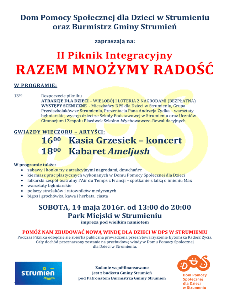 Dom Pomocy Społecznej dla Dzieci w Strumieniu oraz Burmistrz Gminy Strumień zapraszają na: II Piknik Integracyjny RAZEM MNOŻYMY RADOŚĆ W PROGRAMIE: 1300 Rozpoczęcie pikniku ATRAKCJE DLA DZIECI – WIELOBÓJ I LOTERIA Z NAGRODAMI (BEZPŁATNA) WYSTĘPY SCENICZNE - Mieszkańcy DPS dla Dzieci w Strumieniu, Grupa Przedszkolaków ze Strumienia, Prezentacja Pana Andrzeja Żydka – warsztaty bębniarskie, występ dzieci ze Szkoły Podstawowej w Strumieniu oraz Uczniów Gimnazjum i Zespołu Placówek Szkolno-Wychowawczo-Rewalidacyjnych GWIAZDY WIECZORU – ARTYŚCI: 1600 Kasia Grzesiek – koncert 1800 Kabaret Ameljush W programie także: zabawy i konkursy z atrakcyjnymi nagrodami, dmuchańce kiermasz prac plastycznych wykonanych w Domu Pomocy Społecznej dla Dzieci lalkarski zespół teatralny I’Air du Temps z Francji – spotkanie z lalką o imieniu Max warsztaty bębniarskie pokazy strażaków i ratowników medycznych bigos i grochówka, kawa i herbata, ciasta SOBOTA, 14 maja 2016r. od 13:00 do 20:00 Park Miejski w Strumieniu impreza pod wielkim namiotem POMÓŻ NAM ZBUDOWAĆ NOWĄ WINDĘ DLA DZIECI W DPS W STRUMIENIU Podczas Pikniku odbędzie się zbiórka publiczna prowadzona przez Stowarzyszenie Bytomska Radość Życia. Cały dochód przeznaczony zostanie na przebudowę windy w Domu Pomocy Społecznej dla Dzieci w Strumieniu. . Zadanie współfinansowane jest z budżetu Gminy Strumień pod Patronatem Burmistrza Gminy Strumień