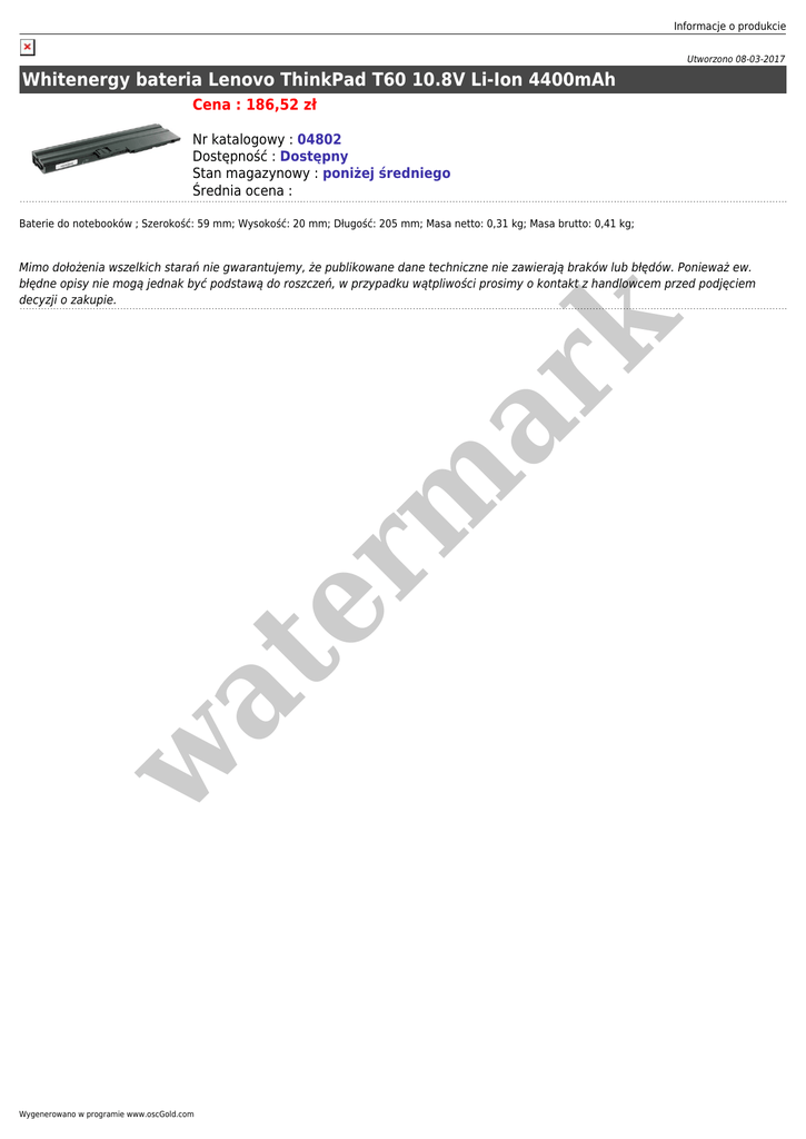 Informacje o produkcie Utworzono 08-03-2017 Whitenergy bateria Lenovo ThinkPad T60 10.8V Li-Ion 4400mAh Cena : 186,52 zł Nr katalogowy : 04802 Dostępność : Dostępny Stan magazynowy : poniżej średniego Średnia ocena : Baterie do notebooków ; Szerokość: 59 mm; Wysokość: 20 mm; Długość: 205 mm; Masa netto: 0,31 kg; Masa brutto: 0,41 kg; w at er m ar k Mimo dołożenia wszelkich starań nie gwarantujemy, że publikowane dane techniczne nie zawierają braków lub błędów. Ponieważ ew. błędne opisy nie mogą jednak być podstawą do roszczeń, w przypadku wątpliwości prosimy o kontakt z handlowcem przed podjęciem decyzji o zakupie. Wygenerowano w programie www.oscGold.com
