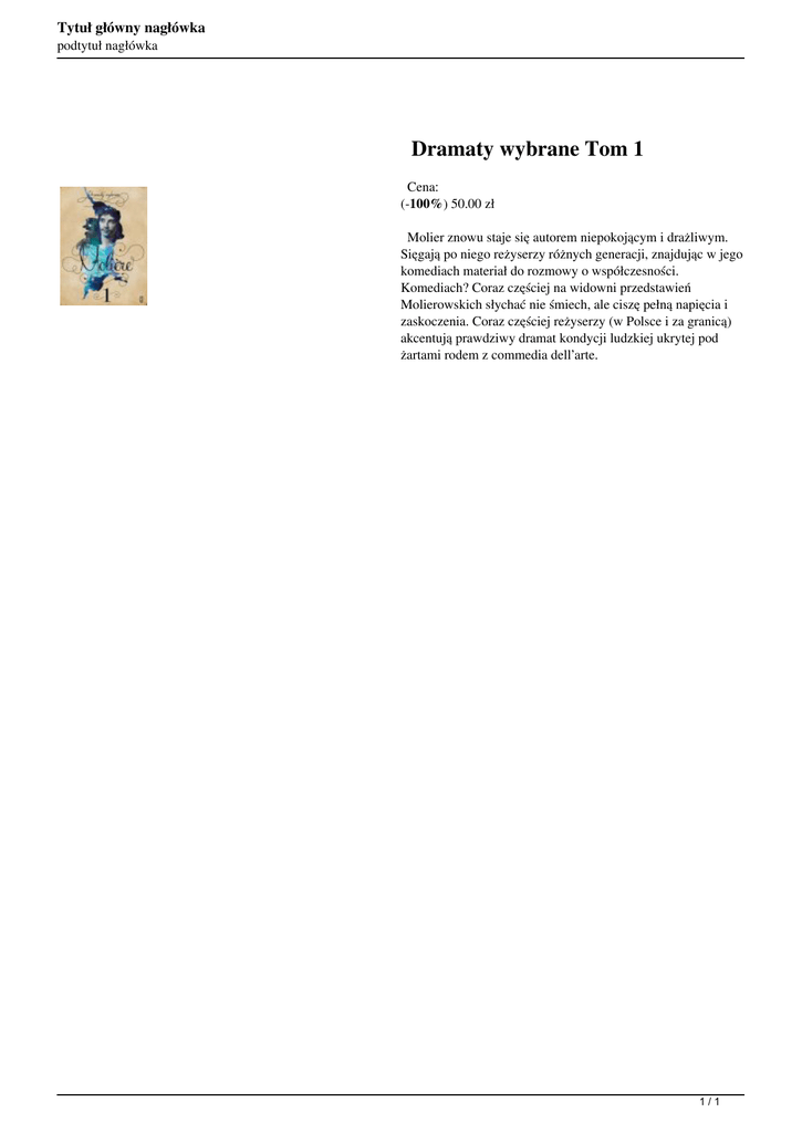 Tytuł główny nagłówka podtytuł nagłówka Dramaty wybrane Tom 1 Cena: (-100%) 50.00 zł Molier znowu staje się autorem niepokojącym i drażliwym. Sięgają po niego reżyserzy różnych generacji, znajdując w jego komediach materiał do rozmowy o współczesności. Komediach? Coraz częściej na widowni przedstawień Molierowskich słychać nie śmiech, ale ciszę pełną napięcia i zaskoczenia. Coraz częściej reżyserzy (w Polsce i za granicą) akcentują prawdziwy dramat kondycji ludzkiej ukrytej pod żartami rodem z commedia dell’arte. 1/1 Powered by TCPDF (www.tcpdf.org)