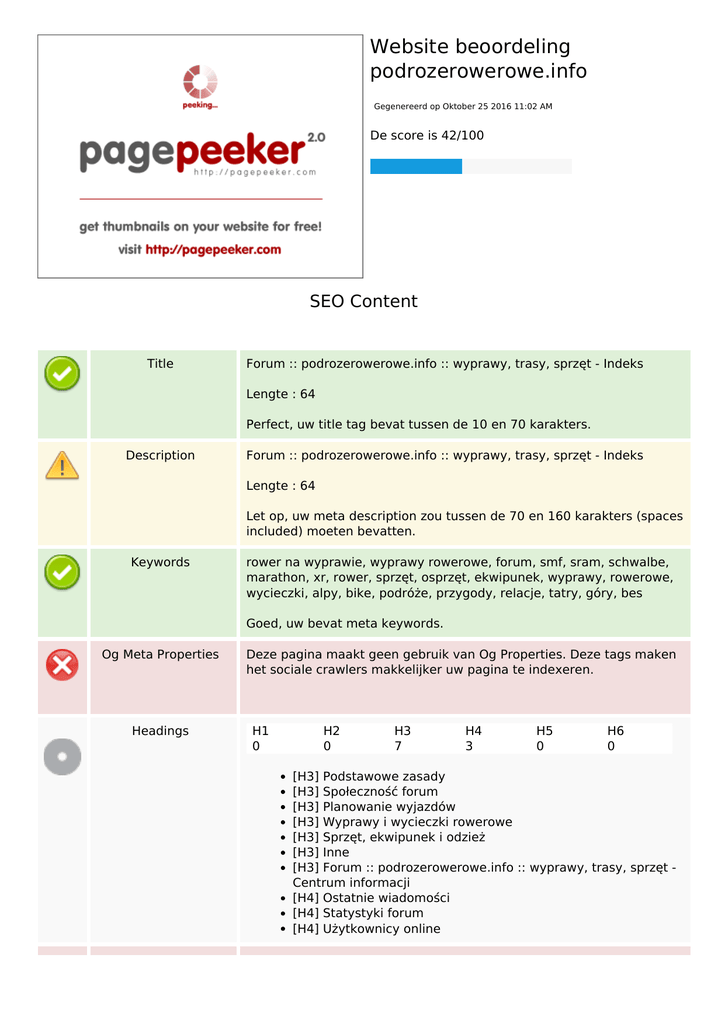 Website beoordeling podrozerowerowe.info Gegenereerd op Oktober 25 2016 11:02 AM De score is 42/100 SEO Content Title Forum :: podrozerowerowe.info :: wyprawy, trasy, sprzęt - Indeks Lengte : 64 Perfect, uw title tag bevat tussen de 10 en 70 karakters. Description Forum :: podrozerowerowe.info :: wyprawy, trasy, sprzęt - Indeks Lengte : 64 Let op, uw meta description zou tussen de 70 en 160 karakters (spaces included) moeten bevatten. Keywords rower na wyprawie, wyprawy rowerowe, forum, smf, sram, schwalbe, marathon, xr, rower, sprzęt, osprzęt, ekwipunek, wyprawy, rowerowe, wycieczki, alpy, bike, podróże, przygody, relacje, tatry, góry, bes Goed, uw bevat meta keywords. Og Meta Properties Headings Deze pagina maakt geen gebruik van Og Properties. Deze tags maken het sociale crawlers makkelijker uw pagina te indexeren. H1 0 H2 0 H3 7 H4 3 H5 0 H6 0 [H3] Podstawowe zasady [H3] Społeczność forum [H3] Planowanie wyjazdów [H3] Wyprawy i wycieczki rowerowe [H3] Sprzęt, ekwipunek i odzież [H3] Inne [H3] Forum :: podrozerowerowe.info :: wyprawy, trasy, sprzęt Centrum informacji [H4] Ostatnie wiadomości [H4] Statystyki forum [H4] Użytkownicy online SEO Content Afbeeldingen We vonden 40 afbeeldingen in de pagina. 11 alt attributen ontbreken. Voeg alternatieve text toe zodat zoekmachines beter kunnen beoordelen wat het onderwerp van de afbeeldingen is. Text/HTML Ratio Ratio : 23% Goed, De ratio van text tot HTML code hoger dan 15, maar lager dan 25 procent. Flash Iframe Perfect, geen Flash content gevonden in uw website. Perfect, er zijn geen Iframes in uw website aangetroffen. SEO Links Herschreven URL Slecht. Uw links maken gebruik van een query string. Underscores in de URLs Perfect! Geen underscores gevonden in uw URLs. In-page links We vonden een totaal van 106 links inclusie 0 link(s) naar bestanden Statistics Externe Links : noFollow 0% Externe Links : doFollow 4.72% Interne Links 95.28% In-page links Ankertekst Type samenstelling Zaloguj się Intern doFollow zarejestruj Intern doFollow email aktywacyjny? Intern doFollow Ogłoszenia Intern doFollow In-page links yoshko Intern doFollow Odp: Zmiany nicków Intern doFollow Błędy, problemy, propozycje, opinie itp. Intern doFollow Wilk Intern doFollow Odp: Ortografia Intern doFollow Przywitaj się Intern doFollow Majcher Intern doFollow Odp: Czołem ;-) Intern doFollow Nasze rowery Intern doFollow R_och Intern doFollow Odp: Miło mi przedstawić... Intern doFollow Ciekawostki oraz Dyskusje Rowerowe Intern doFollow wojtek Intern doFollow altharr Intern doFollow Odp: Bikestacja - proble... Intern doFollow O kobietach Intern doFollow hindiana Intern doFollow m.arek Intern doFollow Odp: naprawa roweru po k... Intern doFollow Do poczytania Intern doFollow Janus Intern doFollow Odp: rowerotopia Intern doFollow Planowanie trasy Intern doFollow Odp: Hiszpania wybrzeże ... Intern doFollow Szukam partnera/partnerki Intern doFollow Marek00 Intern doFollow Odp: Tadżykistan Kirgist... Intern doFollow Transport roweru Intern doFollow In-page links menel Intern doFollow Odp: Przewożenie roweru ... Intern doFollow Podróże i Wyprawy Intern doFollow Wagabunda Intern doFollow Odp: Ukraina 2016 Intern doFollow Wycieczki Intern doFollow latant Intern doFollow Odp: Z Olsztyna na Jurę ... Intern doFollow Podróże z dziećmi Intern doFollow AsiaNLG Intern doFollow Odp: Cargo zamiast auta Intern doFollow Na sportowo Intern doFollow skaut Intern doFollow Odp: BBTour 2018 Intern doFollow Porady wyprawowe Intern doFollow kosola Intern doFollow Odp: Białoruś? Intern doFollow Inne wyprawowe Intern doFollow AdrianU Intern doFollow Odp: Filmy rowerowe Intern doFollow Mapy i trasy rowerowe Intern doFollow Iwo Intern doFollow Terenowa trasa przez Fra... Intern doFollow Klub Zdobywców Gmin Intern doFollow Księgowy Intern doFollow Odp: ZaliczMiejscowość :... Intern doFollow Rower Intern doFollow JUREK Intern doFollow In-page links Odp: Wymiana ramy Intern doFollow Osprzęt Intern doFollow Waxmund Intern doFollow Odp: Damper Intern doFollow Napęd i hamulce Intern doFollow Rama, suport, mostek, kierownica, amortyzator, widelec i stery Intern doFollow Koła Intern doFollow Siodełka i sztyce Intern doFollow Bagażniki i przyczepki Intern doFollow Oświetlenie Intern doFollow Inne akcesoria Intern doFollow Ekwipunek Intern doFollow wjck Intern doFollow Odp: zakup namiotu wypra... Intern doFollow Sakwy, torby i worki Intern doFollow Kuchnia Intern doFollow Namioty Intern doFollow Śpiwory, maty i karimaty Intern doFollow Higiena Intern doFollow Elektronika, Foto Intern doFollow Odzież i obuwie rowerowe Intern doFollow Zbyszek Intern doFollow Odp: Kurtka puchowa(?) n... Intern doFollow HydePark Intern doFollow Odp: Czarny protest Intern doFollow Zapisz się do Webslice Intern doFollow Odp: Czarny protest Intern noFollow Odp: Miło mi przedstawić Wam Księżniczkę ... Intern noFollow In-page links Odp: Czarny protest Intern noFollow Odp: Czarny protest Intern noFollow Odp: Czarny protest Intern noFollow RDK Intern doFollow kubsoon Intern doFollow Zobacz ostatnio wysłane wiadomości Intern doFollow Waldemar Intern doFollow marg Intern doFollow Kuman Intern doFollow Borafu Intern doFollow wiki Intern doFollow Mobilna wersja forum Intern doFollow SMF 2.0.11 Intern doFollow SMF © 2011 Extern doFollow Simple Machines Extern doFollow SMFAds Extern doFollow Free Forums Extern doFollow DzinerStudio Extern doFollow SEO Keywords Keywords Cloud ostatnia dzisiaj wiadomości wojtek odp dnia forum wątków wiadomość moderator Keywords Consistentie Keyword Content wiadomości 28 Title Keywords Description Headings Keywords Consistentie odp 28 wiadomość 23 wątków 23 dnia 23 Bruikbaarheid Url Domein : podrozerowerowe.info Lengte : 20 Favicon Goed, uw website heeft een favicon. Printbaarheid Jammer. We vonden geen Print-Vriendelijke CSS. Taal Er is geen taal ingesteld. Gebruik deze gratis meta tags generator om de taal van uw website mee in te stellen. Dublin Core