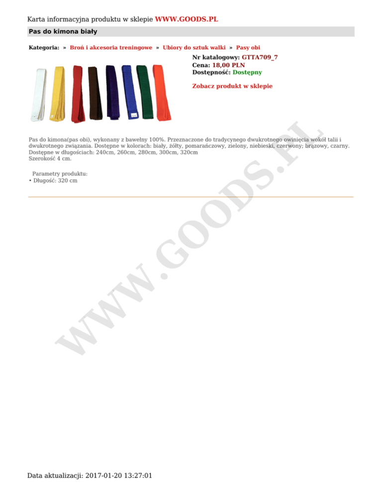 Karta informacyjna produktu w sklepie WWW.GOODS.PL Pas do kimona biały Kategoria: » Broń i akcesoria treningowe » Ubiory do sztuk walki » Pasy obi Nr katalogowy: GTTA709_7 Cena: 18,00 PLN Dostępność: Dostępny S. PL Zobacz produkt w sklepie Pas do kimona(pas obi), wykonany z bawełny 100%. Przeznaczone do tradycynego dwukrotnego owinięcia wokół talii i dwukrotnego związania. Dostępne w kolorach: biały, żółty, pomarańczowy, zielony, niebieski, czerwony; brązowy, czarny. Dostępne w długościach: 240cm, 260cm, 280cm, 300cm, 320cm Szerokość 4 cm. W W W .G O O D Parametry produktu: • Długość: 320 cm Data aktualizacji: 2017-01-20 13:27:01