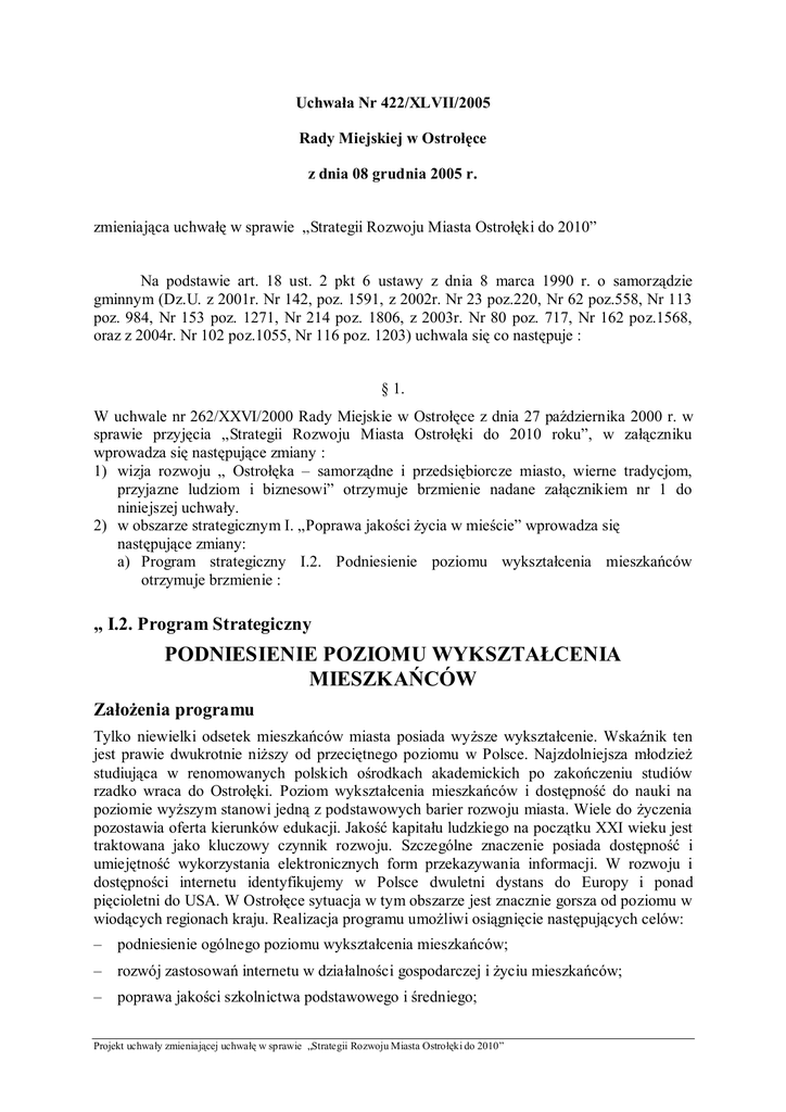 Uchwała Nr 422/XLVII/2005 Rady Miejskiej w Ostrołęce z dnia 08 grudnia 2005 r. zmieniająca uchwałę w sprawie „Strategii Rozwoju Miasta Ostrołęki do 2010” Na podstawie art. 18 ust. 2 pkt 6 ustawy z dnia 8 marca 1990 r. o samorządzie gminnym (Dz.U. z 2001r. Nr 142, poz. 1591, z 2002r. Nr 23 poz.220, Nr 62 poz.558, Nr 113 poz. 984, Nr 153 poz. 1271, Nr 214 poz. 1806, z 2003r. Nr 80 poz. 717, Nr 162 poz.1568, oraz z 2004r. Nr 102 poz.1055, Nr 116 poz. 1203) uchwala się co następuje : § 1. W uchwale nr 262/XXVI/2000 Rady Miejskie w Ostrołęce z dnia 27 października 2000 r. w sprawie przyjęcia „Strategii Rozwoju Miasta Ostrołęki do 2010 roku”, w załączniku wprowadza się następujące zmiany : 1) wizja rozwoju „ Ostrołęka – samorządne i przedsiębiorcze miasto, wierne tradycjom, przyjazne ludziom i biznesowi” otrzymuje brzmienie nadane załącznikiem nr 1 do niniejszej uchwały. 2) w obszarze strategicznym I. „Poprawa jakości życia w mieście” wprowadza się następujące zmiany: a) Program strategiczny I.2. Podniesienie poziomu wykształcenia mieszkańców otrzymuje brzmienie : „ I.2. Program Strategiczny PODNIESIENIE POZIOMU WYKSZTAŁCENIA MIESZKAŃCÓW Założenia programu Tylko niewielki odsetek mieszkańców miasta posiada wyższe wykształcenie. Wskaźnik ten jest prawie dwukrotnie niższy od przeciętnego poziomu w Polsce. Najzdolniejsza młodzież studiująca w renomowanych polskich ośrodkach akademickich po zakończeniu studiów rzadko wraca do Ostrołęki. Poziom wykształcenia mieszkańców i dostępność do nauki na poziomie wyższym stanowi jedną z podstawowych barier rozwoju miasta. Wiele do życzenia pozostawia oferta kierunków edukacji. Jakość kapitału ludzkiego na początku XXI wieku jest traktowana jako kluczowy czynnik rozwoju. Szczególne znaczenie posiada dostępność i umiejętność wykorzystania elektronicznych form przekazywania informacji. W rozwoju i dostępności internetu identyfikujemy w Polsce dwuletni dystans do Europy i ponad pięcioletni do USA. W Ostrołęce sytuacja w tym obszarze jest znacznie gorsza od poziomu w wiodących regionach kraju. Realizacja programu umożliwi osiągnięcie następujących celów: – podniesienie ogólnego poziomu wykształcenia mieszkańców; – rozwój zastosowań internetu w działalności gospodarczej i życiu mieszkańców; – poprawa jakości szkolnictwa podstawowego i średniego; Projekt uchwały zmieniającej uchwałę w sprawie „Strategii Rozwoju Miasta Ostrołęki do 2010” – rozwój możliwości kształcenia na poziomie wyższym; – dostosowanie jakości i specjalizacji kształcenia do wymogów lokalnego rynku pracy. Zadania strategiczne: 1. Stworzenie systemu stypendialnego dla młodzieży z rodzin o niskich dochodach Świadczenia dla uczących się dzieci i młodzieży stanowią istotną formę pomocy materialnej dla rodzin znajdujących się w trudnej sytuacji finansowej i życiowej. Udzielenie tych świadczeń ma na celu wyrównywanie szans edukacyjnych uczniów, słuchaczy i wychowanków, poprawę dostępności kształcenia na wyższych poziomach edukacji dla dzieci i młodzieży z uboższych środowisk oraz umożliwienie upowszechniania wykształcenia średniego. Świadczenia kierowane są do uczniów i słuchaczy pobierających naukę w różnych typach szkół, słuchaczy kolegiów nauczycielskich, nauczycielskich kolegiów języków obcych oraz studentów. Stypendia dla dzieci i młodzieży mają charakter socjalny i motywacyjny. Pomoc materialna ma także na celu wspieranie uczniów zdolnych. Zadanie obejmuje : - zabezpieczenie środków finansowych na stypendia socjalne i motywacyjne, - pozyskiwanie środków z funduszy strukturalnych, m.in. z Europejskiego Funduszu Społecznego, - opracowanie zasad i regulaminu przyznawania stypendiów. Termin realizacji 2005 – 2010 5,7 2000 2001 2002 2003 2004 2005 2006 2007 2008 2009 Realizatorzy: - Urząd Miasta Ostrołęki, Urząd Marszałkowski Województwa Mazowieckiego, dyrektorzy szkół. 2. Inicjowanie i wspieranie działań w celu utworzenie Państwowej Wyższej Szkoły Zawodowej, filii renomowanej wyższej uczelni państwowej lub Mazowieckiej Wyższej Szkoły Zawodowej. Studia w miejscu zamieszkania są przede wszystkim tańsze, a poprzez to dostępniejsze dla większej liczby mieszkańców. Umożliwiają również kształcenie ustawiczne dla pracujących. Zadanie obejmuje: – podejmowanie i wspieranie działań zmierzających do utworzenia uczelni; – współpraca przy określeniu priorytetowych kierunków nauczania; – przygotowanie propozycji bazy lokalowej bądź pomoc w zapewnieniu lokalu dla potrzeb uczelni; Projekt uchwały zmieniającej uchwałę w sprawie „Strategii Rozwoju Miasta Ostrołęki do 2010” 2010 Termin realizacji 2002-2008 5,7 2000 2001 2002 2003 2004 2005 2006 2007 2008 2009 Realizatorzy i współrealizatorzy: – Miasto Ostrołęki, – Ministerstwo Edukacji Narodowej – Sejmik Województwa Mazowieckiego – Zarząd Województwa Mazowieckiego, – instytucje pozarządowe, – firmy i osoby prywatne. 3. Rozwój systemu doskonalenia zawodowego (w szczególności oferty dla osób bezrobotnych lub zagrożonych utratą pracy). Wymogi współczesnego rynku pracy wymagają wielozawodowości i ciągłego doskonalenia kwalifikacji. Zadanie obejmuje: – przygotowanie programów i utworzenie instytucji szkoleniowych; – monitoring lokalnego rynku pracy, identyfikację potrzeb pracodawców; – opracowanie modelu projekcji rynku pracy – powołanie Centrum Kształcenia Praktycznego Termin realizacji 2000-2007 5,7 2000 2001 2002 2003 2004 2005 2006 2007 2008 2009 2010 Realizatorzy: – Urząd Miasta Ostrołęki, – Powiatowy Urząd Pracy, – Kuratorium Oświaty, – lokalni pracodawcy, – instytucje pozarządowe i organizacje przedstawicielskie biznesu, – szkoły i instytucje szkoleniowe. 4. Podniesienie jakości nauczania w szkołach. Zadanie obejmuje: - współpraca z Kurator
