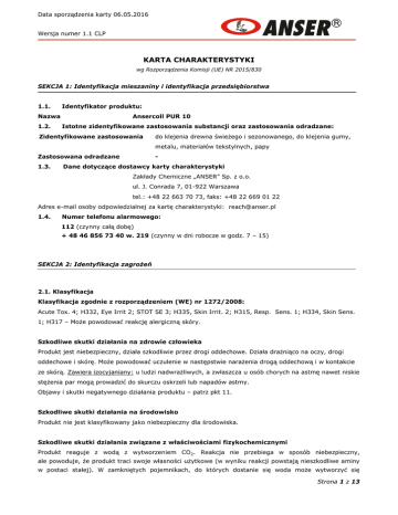 Data sporządzenia karty 06.05.2016 Wersja numer 1.1 CLP KARTA CHARAKTERYSTYKI wg Rozporządzenia Komisji (UE) NR 2015/830 SEKCJA 1: Identyfikacja mieszaniny i identyfikacja przedsiębiorstwa 1.1. Identyfikator produktu: Nazwa 1.2. Ansercoll PUR 10 Istotne zidentyfikowane zastosowania substancji oraz zastosowania odradzane: Zidentyfikowane zastosowania do klejenia drewna świeżego i sezonowanego, do klejenia gumy, metalu, materiałów tekstylnych, papy Zastosowana odradzane 1.3. - Dane dotyczące dostawcy karty charakterystyki Zakłady Chemiczne „ANSER” Sp. z o.o. ul. J. Conrada 7, 01-922 Warszawa tel.: +48 22 663 70 73, faks: +48 22 669 01 22 Adres e-mail osoby odpowiedzialnej za kartę charakterystyki: [email protected] 1.4. Numer telefonu alarmowego: 112 (czynny całą dobę) + 48 46 856 73 40 w. 219 (czynny w dni robocze w godz. 7 – 15) SEKCJA 2: Identyfikacja zagrożeń 2.1. Klasyfikacja Klasyfikacja zgodnie z rozporządzeniem (WE) nr 1272/2008: Acute Tox. 4; H332, Eye Irrit 2; STOT SE 3; H335, Skin Irrit. 2; H315, Resp. Sens. 1; H334, Skin Sens. 1; H317 – Może powodować reakcję alergiczną skóry. Szkodliwe skutki działania na zdrowie człowieka Produkt jest niebezpieczny, działa szkodliwie przez drogi oddechowe. Działa drażniąco na oczy, drogi oddechowe i skórę. Może powodować uczulenie w następstwie narażenia drogą oddechową i w kontakcie ze skórą. Zawiera izocyjaniany: u ludzi nadwrażliwych, a zwłaszcza u osób chorych na astmę nawet niskie stężenia par mogą prowadzić do skurczu oskrzeli lub napadów astmy. Objawy i skutki negatywnego działania produktu – patrz pkt 11. Szkodliwe skutki działania na środowisko Produkt nie jest klasyfikowany jako niebezpieczny dla środowiska. Szkodliwe skutki działania związane z właściwościami fizykochemicznymi Produkt reaguje z wodą z wytworzeniem CO2. Reakcja nie przebiega w sposób niebezpieczny, ale powoduje, że produkt traci swoje własności użytkowe (w wyniku reakcji powstają nieszkodliwe aminy w postaci stałej). W zamkniętych pojemnikach, do których dostanie się woda może wytworzyć się Strona 1 z 13 Ansercoll PUR 10 – Karta Charakterystyki ciśnienie na skutek powstawania gazu w czasie reakcji, co może spowodować rozerwanie pojemnika lub stwarzać zagrożenie w czasie jego otwierania. 2.2. Elementy oznakowania Oznakowanie zgodnie z rozporządzeniem (WE) 1272/2008 Piktogram: Hasło ostrzegawcze: Niebezpieczeństwo Identyfikator produktu: Diizocyjanian 4, 4’- metylenodifenylu, Numer WE: 202-966-0 Zwroty wskazujące rodzaj zagrożenia: H332 - Działa szkodliwie w następstwie wdychania. H335 - Może powodować podrażnienie dróg oddechowych. H334 - Może powodować objawy alergii lub astmy lub trudności w oddychaniu w następstwie wdychania. H315 - Działa drażniąco na skórę. H317 - Może powodować reakcję alergiczną skóry. H319 - Działa drażniąco na oczy. Zwroty wskazujące środki ostrożności: P102 - Chronić przed dziećmi. P260 - Nie wdychać par lub rozpylonej cieczy. P280 - Stosować rękawice ochronne i odzież ochronną. P342 + 311 - W przypadku wystąpienia objawów ze strony układu oddechowego: Skontaktować się z OŚRODKIEM ZATRUĆ lub lekarzem. P405 - Przechowywać pod zamknięciem. P501 - Zawartość i pojemnik usuwać w sposób bezpieczny. 2.3. Inne zagrożenia Brak informacji na temat spełnienia kryteriów PBT lub vPvB zgodnie z załącznikiem XIII Rozporządzenia REACH. Odpowiednie badania nie były przeprowadzone. SEKCJA 3: Skład/informacja o składnikach Numery identyfikacyjne Nazwa Diizocyjanian 4, 4’ - metylenodifenylu Zawartość 52% Nr CAS Nr WE Nr indeksowy 101-68-8 202-966-0 615-005-00-9 Strona 2 z 13 Ansercoll PUR 10 – Karta Charakterystyki SEKCJA 4: Środki pierwszej pomocy. 4.1. Opis środków pierwszej pomocy W przypadku narażenia przez drogi oddechowe - Wynieść osobę poszkodowaną z miejsca narażenia na świeże powietrze - Zapewnić spokój, chronić przed utratą ciepła - W przypadku zatrzymania oddechu wykonać sztuczne oddychanie - Natychmiast zapewnić pomoc lekarską W przypadku narażenia przez kontakt ze skórą - Zdjąć zanieczyszczoną odzież - Zmyć skórę glikolem polietylenowym lub dużą ilością ciepłej wody z mydłem - Zapewnić pomoc lekarską w przypadku utrzymywania się podrażnienia W przypadku narażenia przez kontakt z oczami - Usunąć szkła kontaktowe - Nie stosować środków zobojętniających - Przemywać oczy dużą ilością chłodnej wody przez około 15 minut przy otwartych powiekach - Unikać silnego strumienia wobec ryzyka uszkodzenia rogówki - Zapewnić natychmiastową pomoc lekarską W przypadku narażenia przez przewód pokarmowy - Nie wywoływać wymiotów - Przepłukać usta wodą - Nie podawać niczego do picia - Zapewnić natychmiastową pomoc lekarską 4.2. Najważniejsze ostre i opóźnione objawy oraz skutki narażenia Ból głowy, wymioty, duszność, ból gardła, czerwony plamy na skórze. Długotrwały lub powtarzający się kontakt ze skórą może powodować nadwrażliwość. Długotrwałe lub powtarzające się narażenie układu oddechowego może powodować astmę. 4.3. Wskazania dotyczące wszelkiej natychmiastowej pomocy lekarskiej i szczególnego postępowania z poszkodowanym Nie stosować środków zobojętniających. Decyzję o sposobie postępowania ratunkowego podejmuje lekarz po dokładnej ocenie stanu poszkodowanego. Ze względu na możliwość wystąpienia opóźnionych objawów zastosować 48-godzinną obserwację. SEKCJA 5: Postępowanie w przypadku pożaru. Postępować zgodnie z istniejącą Instrukcją Bezpieczeństwa Pożarowego, jeżeli odbiorca takiej nie posiada należy: zawiadomić otoczenie o awarii. Usunąć z obszaru zagrożenia wszystkie osoby nie biorące udziału w likwidowaniu awarii. W razie potrzeby zarządzić ewakuację. Małe pożary gasić podręcznymi środkami gaśniczymi, w przypadku dużych pożarów wezwać Straż Pożarną i Po