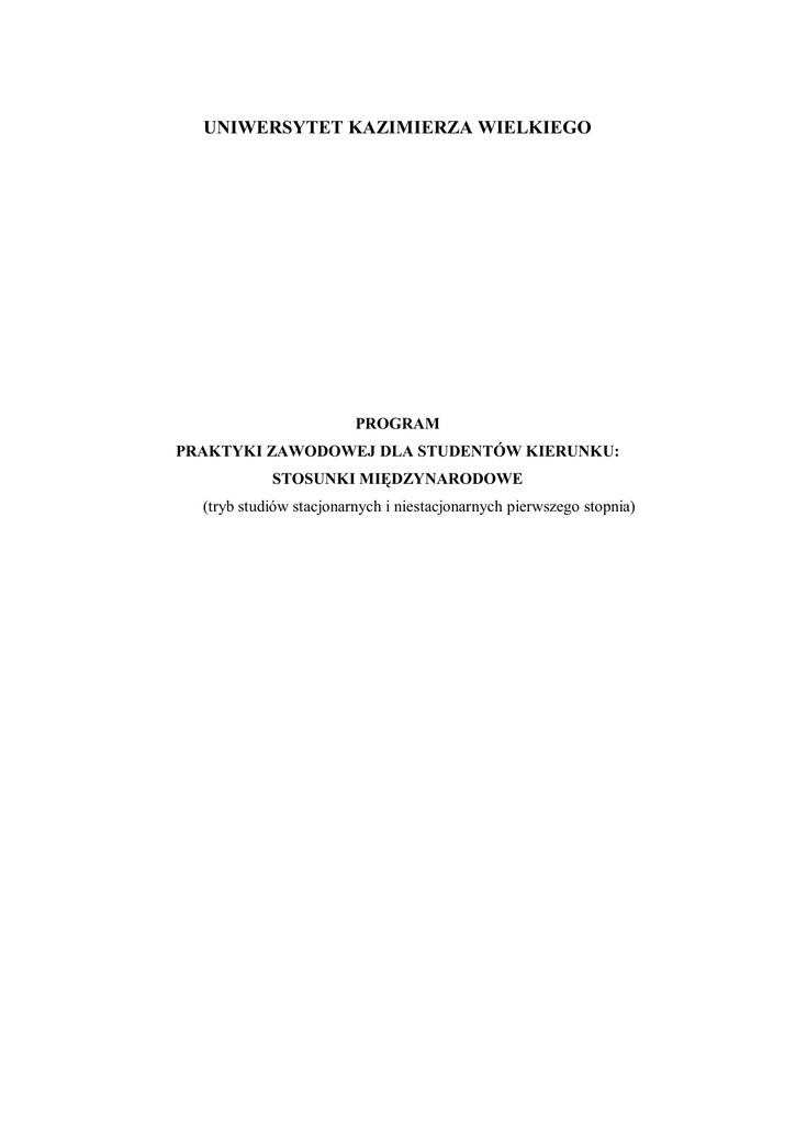 UNIWERSYTET KAZIMIERZA WIELKIEGO PROGRAM PRAKTYKI ZAWODOWEJ DLA STUDENTÓW KIERUNKU: STOSUNKI MIĘDZYNARODOWE (tryb studiów stacjonarnych i niestacjonarnych pierwszego stopnia) I. Postanowienia ogólne: 1. Praktyka zawodowa stanowi integralną część programu studiów określonych w standardach kształcenia dla kierunku Stosunki Międzynarodowe i podlega zaliczeniu. 2. Praktyka zawodowa realizowana jest po IV semestrze studiów w wymiarze nie krótszym niż trzy tygodnie (120 godzin). 3. O wyborze miejsca praktyki decyduje Student uwzględniając jego specyfikę, zgodność ze zdobytą wiedzą lub potencjalnymi kwalifikacjami oraz opinią Opiekuna Praktyk. 4. Uczelnia nie zwraca Studentowi żadnych kosztów z tytułu odbywania praktyki. W związku z tym Praktykantowi nie przysługują żadne roszczenia finansowe w stosunku do Uczelni. Praca praktykanta na rzecz instytucji/zakładu ma charakter nieodpłatny. W przypadku, gdy organizator praktyki zdecyduje o wynagrodzeniu Studenta z tytułu pracy wykonanej w trakcie odbywanej praktyki, stosowna umowa zawierana jest pomiędzy organizatorem praktyki a studentem bez pośrednictwa Uczelni. 5. Przed rozpoczęciem praktyki student, który nie posiada ubezpieczenia od następstw nieszczęśliwych wypadków, zobowiązany jest ubezpieczyć się na czas jej trwania. 6. Miejsce odbywania praktyki zawodowej, jej cele, organizację i przebieg, czas trwania, obowiązki studentów i opiekunów oraz warunki zaliczenia określa niniejszy program. II. Miejsce praktyki: 1. Student odbywa praktykę w: a. w wybranych instytucjach, z którymi Uniwersytet Kazimierza Wielkiego posiada zawarte porozumienia b. innych instytucjach/zakładach działających w regionie, m.in.: o Biurze Integracji Europejskiej Urzędu Wojewódzkiego o Powiatowym Centrum Integracji Europejskiej i Rozwoju w Bydgoszczy o Regionalnym Centrum Informacji Europejskiej w Bydgoszczy o Urzędach Miejskich o Urzędzie Marszałkowskim o mediach lokalnych o organizacjach pozarządowych o przedsiębiorstwach transgranicznych c. innych instytucjach centralnych i zagranicznych, których oferta praktyk dostępna jest w Internecie po wpisaniu do wyszukiwarki hasła – praktyki studenckie. W przypadku wyboru miejsca praktyki student ubiegając się o indywidualne przyjęcie na praktyki zobowiązany jest zapoznać się nie tylko z ofertą i jej zgodnością z kierunkiem studiów, ale również warunkami rekrutacji oraz zawartością aplikacji. III. Cele praktyki 1. Celem praktyki jest doskonalenie umiejętności zawodowych, w tym umożliwienie zastosowania zdobytej w trakcie studiów wiedzy teoretycznej w działaniu praktycznym oraz kształtowanie odpowiedniej postawy i motywacji do pracy (punktualność, systematyczność, odpowiedzialność, umiejętność pracy w zespole, poprawność kontaktów interpersonalnych, kreatywność). 2. W trakcie praktyki student powinien poznać i zdobyć nowe doświadczenia, które będą niezbędne w późniejszej pracy zawodowej, min.: Poznanie specyfiki struktury i funkcjonowania instytucji/zakładu. Podstawowej dokumentacji i aktów prawnych określających działalność organizatora praktyki. Kształcenie umiejętności zastosowania wiedzy teoretycznej zdobytej w trakcie studiów z praktyką. Planowanie, organizowanie i ocenę efektów pracy. Umiejętność komunikowania się, nawiązywania kontaktów interpersonalnych. Poznanie i sprawne korzystanie z metod oraz technik komunikacji z wykorzystaniem nowoczesnych technologii informacyjnych. Rozwijanie umiejętności pracy zespołowej oraz samodzielnego działania. Poznanie zasad i form współpracy zagranicznej instytucji/zakładu lub ich działalności na rzecz propagowania i rozwoju działań transgranicznych. Wykorzystanie praktyki do nawiązania kontaktów umożliwiających ich wykorzystanie w późniejszym poszukiwaniu miejsca pracy. IV. Organizacja i przebieg praktyki 1. Po dokonaniu wyboru miejsca praktyki (I.3.) Student dokonuje wpisu na listę praktyk przedstawioną przez Studium Praktyk Zawodowych UKW. 2. Podstawą realizacji praktyki jest porozumienie zawarte między Uczelnią a przyjmującym na praktykę. 3. Na kierunku Stosunki Międzynarodowe praktyki zawodowe w przypadku studiów stacjonarnych mają charakter ciągły i odbywają się w czasie wolnym od zajęć akademickich. W szczególnych i uzasadnionych przypadkach, ze względu na specyfikę miejsca praktyki (np. Ambasada RP), termin jej odbycia może ulec zmianie. Takie przypadki rozpatrywane są indywidualnie przez Dziekana, Kierownika Studium Praktyk Zawodowych i Opiekuna Praktyk po złożeniu odpowiedniego wniosku. 4. Identyczne zasady dotyczą Studentów Studiów Niestacjonarnych. Ze względu na specyfikę tej formy kształcenia Studenci mogą również odbywać praktykę zawodową cyklicznie (z przerwami), jednak jej czas trwania (I.2) nie może być krótszy niż trzy tygodnie (120 godzin). 5. O zaliczenie praktyki bez obowiązku jej odbycia mogą się ubiegać Studenci, którzy: Przedstawią dokument potwierdzający zatrudnienie zgodne z kierunkiem studiów, trwające nie mniej niż wskazany w planach studiów czas trwania praktyki Są zatrudnieni na podstawie umowy o pracę lub umowy zlecenie w instytucjach czy placówkach, których działalność odpowiada programowi praktyk i była realizowana w czasie nie krótszym niż czas praktyki zawodowej. Studenci i absolwenci szkół wyższych, którzy już odbyli praktykę zawodową spełniającą wymogi programu praktyk na kierunku Stosunki Międzynarodowe w Uniwersytecie Kazimierza Wielkiego. 6. Zwolnienie, o którym mowa w pkt.5. udzielane jest na pisemny wniosek Studenta. 7. Warunkiem zaliczenia praktyki jest realizacja programu praktyk zawodowych oraz przedłożenie przez studenta stosownej dokumentacji: Opinii z praktyki zawodowej (zał. nr 1) i Dziennika Praktyki Zawodowej (zał. nr 2). 8. Decyzję dotyczącą zaliczenia praktyki zawodowej podejmuje Opiekun Praktyki w oparciu dokument