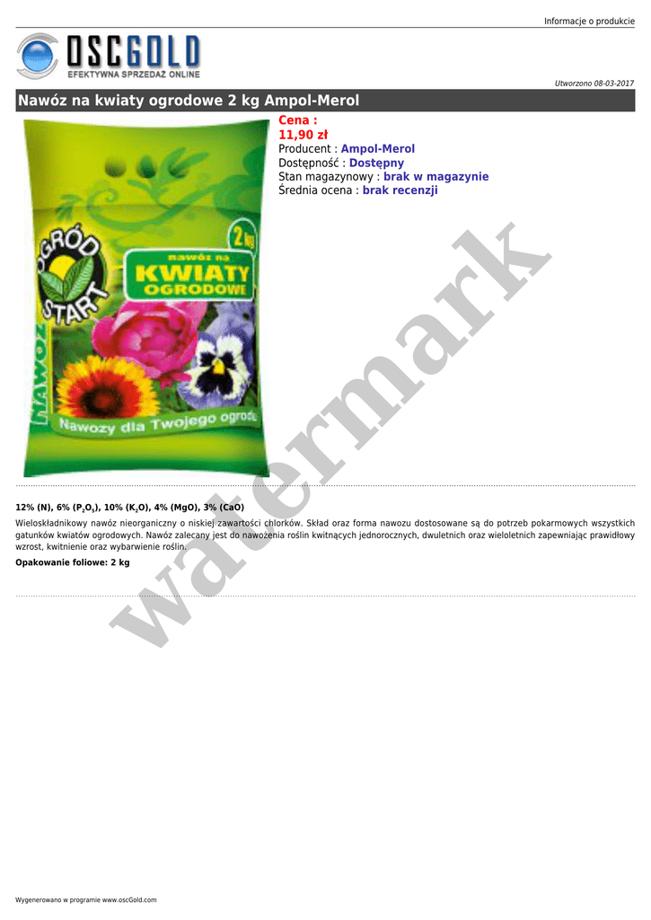 Informacje o produkcie Utworzono 08-03-2017 Nawóz na kwiaty ogrodowe 2 kg Ampol-Merol Cena : 11,90 zł er m ar k Producent : Ampol-Merol Dostępność : Dostępny Stan magazynowy : brak w magazynie Średnia ocena : brak recenzji 12% (N), 6% (P2O5), 10% (K2O), 4% (MgO), 3% (CaO) at Wieloskładnikowy nawóz nieorganiczny o niskiej zawartości chlorków. Skład oraz forma nawozu dostosowane są do potrzeb pokarmowych wszystkich gatunków kwiatów ogrodowych. Nawóz zalecany jest do nawożenia roślin kwitnących jednorocznych, dwuletnich oraz wieloletnich zapewniając prawidłowy wzrost, kwitnienie oraz wybarwienie roślin. w Opakowanie foliowe: 2 kg Wygenerowano w programie www.oscGold.com