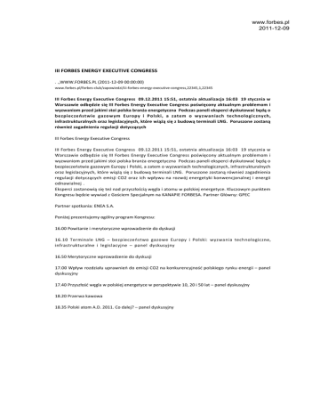 www.forbes.pl 2011-12-09 III FORBES ENERGY EXECUTIVE CONGRESS . .,WWW.FORBES.PL (2011-12-09 00:00:00) www.forbes.pl/forbes-club/zapowiedzi/iii-forbes-energy-executive-congress,22345,1,22345 III Forbes Energy Executive Congress 09.12.2011 15:51, ostatnia aktualizacja 16:03 19 stycznia w Warszawie odbędzie się III Forbes Energy Executive Congress poświęcony aktualnym problemom i wyzwaniom przed jakimi stoi polska branża energetyczna Podczas paneli eksperci dyskutować będą o bezpieczeństwie gazowym Europy i Polski, a zatem o wyzwaniach technologicznych, infrastrukturalnych oraz legislacyjnych, które wiążą się z budową terminali LNG. Poruszone zostaną również zagadnienia regulacji dotyczących III Forbes Energy Executive Congress III Forbes Energy Executive Congress 09.12.2011 15:51, ostatnia aktualizacja 16:03 19 stycznia w Warszawie odbędzie się III Forbes Energy Executive Congress poświęcony aktualnym problemom i wyzwaniom przed jakimi stoi polska branża energetyczna Podczas paneli eksperci dyskutować będą o bezpieczeństwie gazowym Europy i Polski, a zatem o wyzwaniach technologicznych, infrastrukturalnych oraz legislacyjnych, które wiążą się z budową terminali LNG. Poruszone zostaną również zagadnienia regulacji dotyczących emisji CO2 oraz ich wpływu na rozwój energetyki konwencjonalnej i energii odnawialnej . Eksperci zastanowią się też nad przyszłością węgla i atomu w polskiej energetyce. Kluczowym punktem Kongresu będzie wywiad z Gościem Specjalnym na KANAPIE FORBESA. Partner Główny: GPEC Partner spotkania: ENEA S.A. Poniżej prezentujemy ogólny program Kongresu: 16.00 Powitanie i merytoryczne wprowadzenie do dyskusji 16.10 Terminale LNG – bezpieczeństwo gazowe Europy i Polski: wyzwania technologiczne, infrastrukturalne i legislacyjne – panel dyskusyjny 16.50 Merytoryczne wprowadzenie do dyskusji 17.00 Wpływ rozdziału uprawnień do emisji CO2 na konkurencyjność polskiego rynku energii – panel dyskusyjny 17.40 Przyszłość węgla w polskiej energetyce w perspektywie 10, 20 i 50 lat – panel dyskusyjny 18.20 Przerwa kawowa 18.35 Polski atom A.D. 2011. Co dalej? – panel dyskusyjny www.forbes.pl 2011-12-09 19.15 Merytoryczne wprowadzenie do dyskusji 19.25 Smart grid – panel dyskusyjny 20.05 KANAPA FORBESA – wywiad z gościem specjalnym 20.35 Koktajl