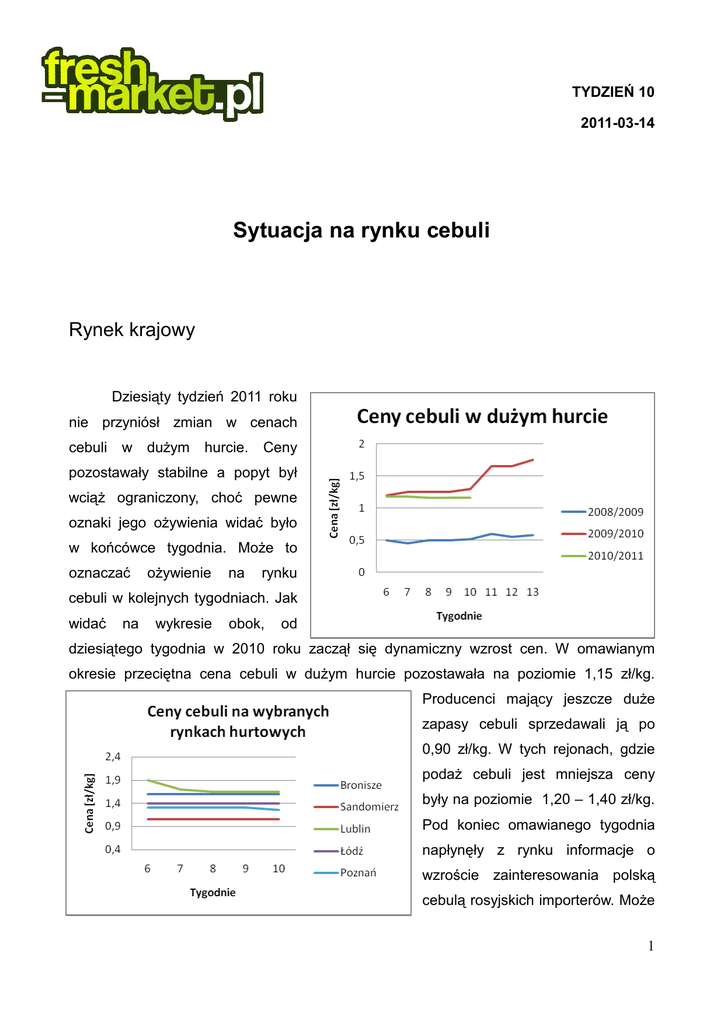 TYDZIEŃ 10 2011-03-14 Sytuacja na rynku cebuli Rynek krajowy Dziesiąty tydzień 2011 roku nie przyniósł zmian w cenach cebuli w duŜym hurcie. Ceny pozostawały stabilne a popyt był wciąŜ ograniczony, choć pewne oznaki jego oŜywienia widać było w końcówce tygodnia. MoŜe to oznaczać oŜywienie na rynku cebuli w kolejnych tygodniach. Jak widać na wykresie obok, od dziesiątego tygodnia w 2010 roku zaczął się dynamiczny wzrost cen. W omawianym okresie przeciętna cena cebuli w duŜym hurcie pozostawała na poziomie 1,15 zł/kg. Producenci mający jeszcze duŜe zapasy cebuli sprzedawali ją po 0,90 zł/kg. W tych rejonach, gdzie podaŜ cebuli jest mniejsza ceny były na poziomie 1,20 – 1,40 zł/kg. Pod koniec omawianego tygodnia napłynęły z rynku informacje o wzroście zainteresowania polską cebulą rosyjskich importerów. MoŜe 1 TYDZIEŃ 10 2011-03-14 to się przełoŜyć na wyŜszy eksport w następnych tygodniach. Na lokalnych rynkach hurtowych ceny w dziesiątym tygodniu 2011 roku pozostawały stabilne. Wyjątkiem był rynek wielkopolski, gdzie cena minimalnie spadła, co widać na wykresie prezentowanym powyŜej. WciąŜ teŜ utrzymywała się duŜa róŜnica między cenami minimum (Sandomierz) a maksimum (Lublin). Jeśli chodzi o ceny w hipermarketach, tym razem cenę cebuli obniŜyło Tesco. Z poziomu 2,45 zł/kg do 1,79 zł/kg. W pozostałych monitorowanych hipermarketach ceny w omawianym okresie były stabilne. Import i eksport W omawianym okresie nie zmieniły się ceny cebuli importowanej oferowanej na polskim rynku. Za cebulę holenderską kalibru 4 – 6 płacono 1,40 zł/kg. Za grubszą cebulę kalibru 6 – 8 trzeba było zapłacić 1,60 zł/kg. Popyt na cebulę importowaną, jak w poprzednich tygodniach utrzymywał się na niskim poziomie. Stabilne pozostały równieŜ ceny sprzedaŜowe polskiej cebuli przeznaczonej na eksport. W dziesiątym tygodniu 2011 roku było to dla cebuli kalibru 4 – 6 były 0,34 – 0,37 euro/kg (worki 15 i 25 kg). Eksport w omawianym okresie wciąŜ nie był duŜy, jednak, jak wspomniano wyŜej w końcówce tygodnia wzrosło zainteresowanie rosyjskich importerów, co daje lepsze widoki na przyszłość. Tak, jak napisano w poprzednim raporcie zapasy cebuli w Holandii mogą się okazać zbyt małe w stosunku do popytu na rynku międzynarodowym i jeden z głównych importerów holenderskiej cebuli – Rosja moŜe szukać cebuli równieŜ na rynku polskim. Według wstępnych danych holenderskich 2 TYDZIEŃ 10 2011-03-14 Productschap Tuinbouw i Kwaliteits-Controle-Bureau (KCB) od początku bieŜącego sezonu (12 lipca 2010 r.) do 11 lutego br. Holandia wyeksportowała 537 tys. ton cebuli. Jest to o 54 tys. ton mniej niŜ w analogicznym okresie sezonu poprzedniego. W szóstym tygodniu br. (7-11 lutego) eksport cebuli z Holandii wyniósł około 16 tys. ton. Największymi odbiorcami w tym czasie były Senegal, Rosja i Wielka Brytania. Według wstępnych danych prezentowanych przez Productschap Tuinbouw do Rosji trafiło w piątym tygodniu 3595 ton holenderskiej cebuli a w szóstym tygodniu 2503 ton (wobec 4081 i 6839 ton w piątym i szóstym tygodniu 2010 roku). Do Polski w piątym tygodniu trafiło 610 ton a w szóstym 306 ton (wobec 1016 i 1045 ton w odpowiednich tygodniach 2010 roku). 3
