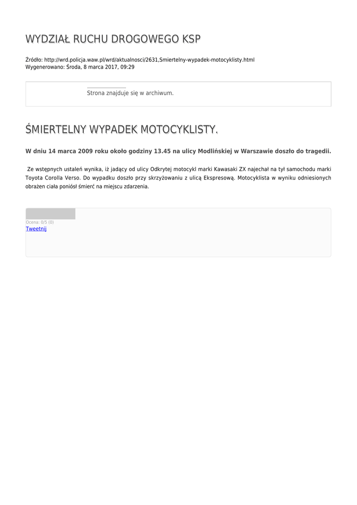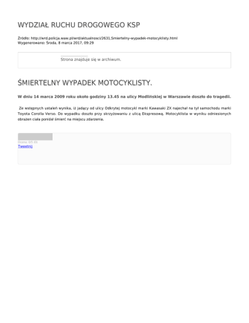 WYDZIAŁ RUCHU DROGOWEGO KSP Źródło: http://wrd.policja.waw.pl/wrd/aktualnosci/2631,Smiertelny-wypadek-motocyklisty.html Wygenerowano: Środa, 8 marca 2017, 09:29 Strona znajduje się w archiwum. ŚMIERTELNY WYPADEK MOTOCYKLISTY. W dniu 14 marca 2009 roku około godziny 13.45 na ulicy Modlińskiej w Warszawie doszło do tragedii. Ze wstępnych ustaleń wynika, iż jadący od ulicy Odkrytej motocykl marki Kawasaki ZX najechał na tył samochodu marki Toyota Corolla Verso. Do wypadku doszło przy skrzyżowaniu z ulicą Ekspresową. Motocyklista w wyniku odniesionych obrażen ciała poniósł śmierć na miejscu zdarzenia. Ocena: 0/5 (0) Tweetnij