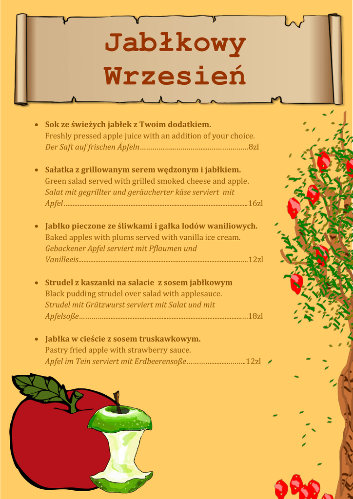 Sezon na jablka! Jabłkowy Wrzesień Sok ze świeżych jabłek z Twoim dodatkiem. Freshly pressed apple juice with an addition of your choice. Der Saft auf frischen Äpfeln……………...………….....………….……8zl Sałatka z grillowanym serem wędzonym i jabłkiem. Green salad served with grilled smoked cheese and apple. Salat mit gegrillter und geräucherter käse serviert mit Apfel….........................................................................................................16zl Jabłko pieczone ze śliwkami i gałka lodów waniliowych. Baked apples with plums served with vanilla ice cream. Gebackener Apfel serviert mit Pflaumen und Vanilleeis...............................................................................................….12zl Strudel z kaszanki na salacie z sosem jabłkowym Black pudding strudel over salad with applesauce. Strudel mit Grützwurst serviert mit Salat und mit Apfelsoße………….................................................................................…18zl Jabłka w cieście z sosem truskawkowym. Pastry fried apple with strawberry sauce. Apfel im Tein serviert mit Erdbeerensoße…………...........……..12zl