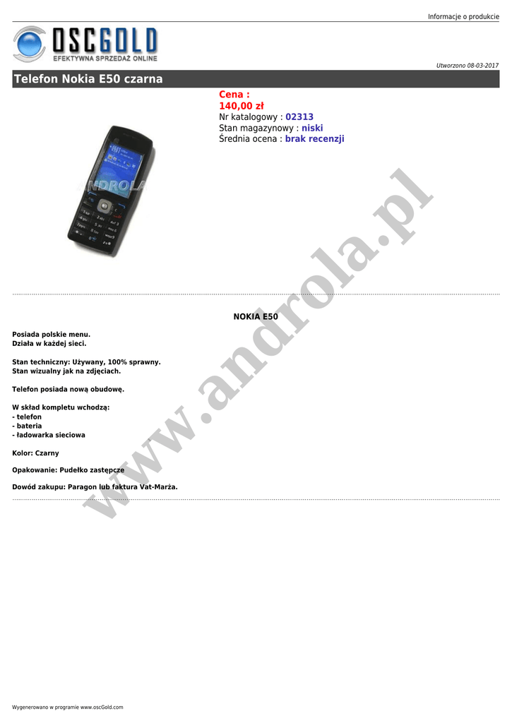 Informacje o produkcie Utworzono 08-03-2017 Telefon Nokia E50 czarna Cena : 140,00 zł ro la .p l Nr katalogowy : 02313 Stan magazynowy : niski Średnia ocena : brak recenzji Posiada polskie menu. Działa w każdej sieci. Stan techniczny: Używany, 100% sprawny. Stan wizualny jak na zdjęciach. W skład kompletu wchodzą: - telefon - bateria - ładowarka sieciowa w Kolor: Czarny w .a Telefon posiada nową obudowę. nd NOKIA E50 Opakowanie: Pudełko zastępcze w Dowód zakupu: Paragon lub faktura Vat-Marża. Wygenerowano w programie www.oscGold.com