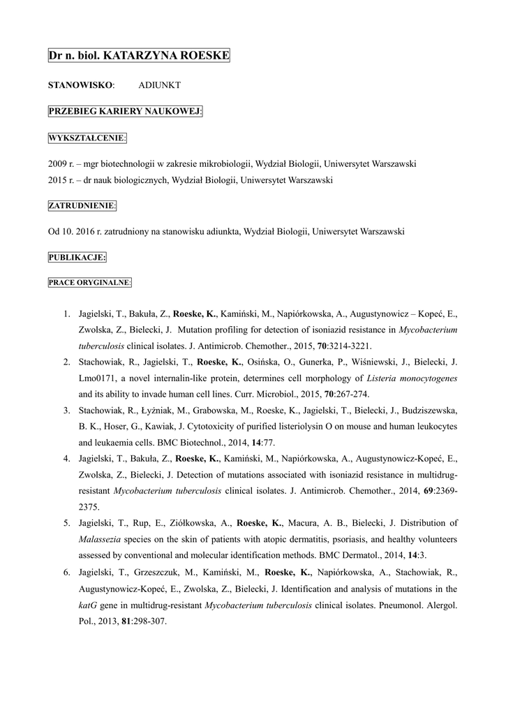 Dr n. biol. KATARZYNA ROESKE STANOWISKO: ADIUNKT PRZEBIEG KARIERY NAUKOWEJ: WYKSZTAŁCENIE: 2009 r. – mgr biotechnologii w zakresie mikrobiologii, Wydział Biologii, Uniwersytet Warszawski 2015 r. – dr nauk biologicznych, Wydział Biologii, Uniwersytet Warszawski ZATRUDNIENIE: Od 10. 2016 r. zatrudniony na stanowisku adiunkta, Wydział Biologii, Uniwersytet Warszawski PUBLIKACJE: PRACE ORYGINALNE: 1. Jagielski, T., Bakuła, Z., Roeske, K., Kamiński, M., Napiórkowska, A., Augustynowicz – Kopeć, E., Zwolska, Z., Bielecki, J. Mutation profiling for detection of isoniazid resistance in Mycobacterium tuberculosis clinical isolates. J. Antimicrob. Chemother., 2015, 70:3214-3221. 2. Stachowiak, R., Jagielski, T., Roeske, K., Osińska, O., Gunerka, P., Wiśniewski, J., Bielecki, J. Lmo0171, a novel internalin-like protein, determines cell morphology of Listeria monocytogenes and its ability to invade human cell lines. Curr. Microbiol., 2015, 70:267-274. 3. Stachowiak, R., Łyżniak, M., Grabowska, M., Roeske, K., Jagielski, T., Bielecki, J., Budziszewska, B. K., Hoser, G., Kawiak, J. Cytotoxicity of purified listeriolysin O on mouse and human leukocytes and leukaemia cells. BMC Biotechnol., 2014, 14:77. 4. Jagielski, T., Bakuła, Z., Roeske, K., Kamiński, M., Napiórkowska, A., Augustynowicz-Kopeć, E., Zwolska, Z., Bielecki, J. Detection of mutations associated with isoniazid resistance in multidrugresistant Mycobacterium tuberculosis clinical isolates. J. Antimicrob. Chemother., 2014, 69:23692375. 5. Jagielski, T., Rup, E., Ziółkowska, A., Roeske, K., Macura, A. B., Bielecki, J. Distribution of Malassezia species on the skin of patients with atopic dermatitis, psoriasis, and healthy volunteers assessed by conventional and molecular identification methods. BMC Dermatol., 2014, 14:3. 6. Jagielski, T., Grzeszczuk, M., Kamiński, M., Roeske, K., Napiórkowska, A., Stachowiak, R., Augustynowicz-Kopeć, E., Zwolska, Z., Bielecki, J. Identification and analysis of mutations in the katG gene in multidrug-resistant Mycobacterium tuberculosis clinical isolates. Pneumonol. Alergol. Pol., 2013, 81:298-307. 7. Stachowiak, R., Łyżniak, M., Budziszewska, B.K., Roeske, K., Bielecki, J., Hoser, G., Kawiak, J. Cytotoxicity of bacterial metabolic products, including listeriolysin O, on leukocyte targets. J. Biomed. Biotechnol., 2012, 2012:954375. PRACE POGLĄDOWE: 1. Roeske, K., Stachowiak, R., Bielecki, J. Założenia i perspektywy wykorzystania żywych wektorów bakteryjnych we współczesnej wakcynologii. Post. Mikrobiol., 2016, 55:27-44. 2. Golec, K., Stachowiak, R., Jopek, K., Bielecki, J. Systemy sekrecyjne Bacillus subtilis. Post. Mikrobiol., 2010, 49:3-13. DONIESIENIA ZJAZDOWE: 1. Roeske, K., Stachowiak, R., Bielecki, J. Listeriolizyna O Listeria monocytogenes jako czynnik wspomagający dostarczanie modelowego antygenu do komórek prezentujących antygen i jego ekspresję w kontekście MHC I. I. Ogólnopolska Konferencja Młodych Naukowców Nauk Przyrodniczych, «Wkraczając w świat nauki 2014», Wrocław, 11. – 12. 09. 2014 r., Książka abstraktów, str. 83. 2. Jagielski, T., Bakuła, Z., Roeske, K., Kamiński, M., Napiórkowska, A., Stachowiak, R., Augustynowicz-Kopeć, E., Zwolska, Z., Bielecki J. Gene markers for predicting second-line antituberculosis drug resistance. «24th European Congress of Clinical Microbiology and Infectious Diseases». Barcelona, Hiszpania, 10. – 13. 05. 2013 r., 24th ECCMID Final Programme, P0936, str. 184. 3. Roeske, K., Stachowiak, R., Kamiński, M., Jagielski, T., Bakuła, Z., Bielecki J. A recombinant Bacillus subtilis vaccine to induce CD8+ T cell response. «BioMicroWorld 2013». Madryt, Hiszpania, 1. – 4. 10. 2013 r., Book of abstracts, str. 291. 4. Roeske, K., Bakuła, Z., Ignatowska, H., Kamiński, M., Napiórkowska, A., Bielecki, J., Augustynowicz-Kopeć, E., Jagielski, T. Characterisation of rpsL and rrs mutations associated with streptomycin resistance in multidrug-resistant Mycobacterium tuberculosis clinical isolates from Poland. «BioMicroWorld 2013», Madryt, Hiszpania, 1. – 4. 10. 2013 r., Book of abstracts, str. 422. 5. Roeske, K., Stachowiak, R., Jagielski, T., Kamiński, M., Bielecki, J. A recombinant Bacillus subtilis vaccine to promote MHC class I-dependent antigen presentation – preliminary results. « FEMS 2013, 5th Congress of European Microbiologists», Lipsk, Niemcy, 21. – 25. 07. 2013 r., FEMS 2013, Program Book, str. 307 (nr 486). 6. Bakuła, Z., Napiórkowska, A., Roeske, K., Kamiński, M., Stachowiak, R., Bielecki, J., Augustynowicz-Kopeć, E., Jagielski, T. Sequence analysis of the embB gene for identification of mutations associated with resistance of multidrug-resistanct Mycobacterium tuberculosis strains to ethambutol. « FEMS 2013, 5th Congress of European Microbiologists», Lipsk, Niemcy, 21. – 25. 07. 2013 r., FEMS 2013, Program Book, str. 155 (nr 2). 7. Jagielski, T., Roeske, K., Kamiński, M., Grzeszczuk, M., Napiórkowska, A., Bakuła, Z., Stachowiak, R., Augustynowicz-Kopeć, E., Zwolska, Z., Bielecki, J. Detection of mutations associated with isoniazid resistance in multidrug-resistant Mycobacterium tuberculosis clinical isolates from Poland. 23rd European Congress of Clinical Microbiology and Infectious Diseases «ECCMID», Berlin, Niemcy, 27. – 30. 04. 2013 r., 23rd ECCMID Final Programme, P2374, str. 187. 8. Jagielski, T., Kamiński, M., Grzeszczuk, M., Roeske, K., Stachowiak, R., Napiórkowska, A., Augustynowicz-Kopeć, E., Zwolska, Z., Bielecki, J. Wykrywanie i charakterystyka mutacji związanych z opornością na izoniazyd w szczepach klinicznych Mycobacterium tuberculosis o wielolekooporności typu MDR. «XXVII. Zjazd Polskiego Towarzystwa Mikrobiologów», Lublin, 5. – 8. 09. 2012 r., Książka abstraktów, P-III-094, str. 155. 9. Roeske, K., Stachowiak, R., Jagielski, T., Bielecki, J. Wpływ delecji C-końcowej części białka SecA na ekspresję białek heterologicznych w szczepach Bacill