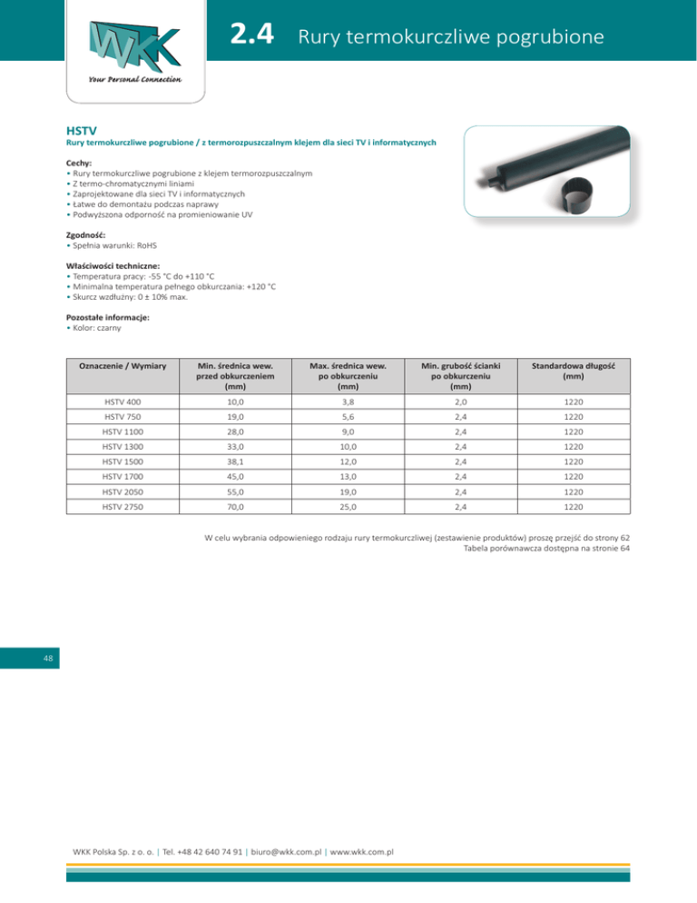 2.4 Rury termokurczliwe pogrubione HSTV Rury termokurczliwe pogrubione / z termorozpuszczalnym klejem dla sieci TV i informatycznych Cechy: • Rury termokurczliwe pogrubione z klejem termorozpuszczalnym • Z termo-chromatycznymi liniami • Zaprojektowane dla sieci TV i informatycznych • Łatwe do demontażu podczas naprawy • Podwyższona odporność na promieniowanie UV Zgodność: • Spełnia warunki: RoHS Właściwości techniczne: • Temperatura pracy: -55 °C do +110 °C • Minimalna temperatura pełnego obkurczania: +120 °C • Skurcz wzdłużny: 0 ± 10% max. Pozostałe informacje: • Kolor: czarny Oznaczenie / Wymiary Min. średnica wew. przed obkurczeniem (mm) Max. średnica wew. po obkurczeniu (mm) Min. grubość ścianki po obkurczeniu (mm) Standardowa długość (mm) HSTV 400 10,0 3,8 2,0 1220 HSTV 750 19,0 5,6 2,4 1220 HSTV 1100 28,0 9,0 2,4 1220 HSTV 1300 33,0 10,0 2,4 1220 HSTV 1500 38,1 12,0 2,4 1220 HSTV 1700 45,0 13,0 2,4 1220 HSTV 2050 55,0 19,0 2,4 1220 HSTV 2750 70,0 25,0 2,4 1220 W celu wybrania odpowieniego rodzaju rury termokurczliwej (zestawienie produktów) proszę przejść do strony 62 Tabela porównawcza dostępna na stronie 64 48 WKK Polska Sp. z o. o. | Tel. +48 42 640 74 91 | [email protected] | www.wkk.com.pl