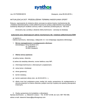 l.dz. 61/TZ/DW/2015 Oświęcim, dnia 05.03.2015 r. AKTUALIZACJA DOT. PRZEDŁUŻENIA TERMINU NADSYŁANIA OFERT Dotyczy: zaproszenie do złożenia oferty cenowej na zakres branży mechanicznej dla „Instalacji doświadczalnej w skali półtechnicznej do syntezy półproduktów do produkcji substancji aktywnych środków ochrony roślin o zdolności produkcyjnej ok. 150 t/rok” Zwracamy się z prośbą o złożenie oferty techniczno - cenowej na dostawę: wykonanie prac obejmujących zakres mechaniczny dla instalacji półtechnicznej ŚOR w oparciu o: • Zakres techniczny stanowiący Załącznik nr 2 do niniejszego zapytania ofertowego. 1. Strony zaangażowane w postępowanie ofertowe: Zamawiający: firma Synthos S.A. Ul. Chemików 1 32-600 Oświęcim 2. Oferta winna zawierać: a) pełną nazwę oferenta, b) adres lub siedzibę oferenta, numer telefonu oraz NIP, c) informacje techniczne o oferowanych urządzeniach, d) cenę (wraz z dostawą) e) okres gwarancji, f) termin dostawy, g) termin ważności oferty (min. do 30.03.2015 r. ), h) oferta musi być podpisana przez osobę lub osoby uprawnione do występowania w obrocie prawnym w imieniu oferenta, podpis musi być czytelny lub opisany pieczęciami imiennymi, 3. Osoby uprawnione do kontaktów z oferentami: Sprawy techniczne – p. Sławomir Liwacz – Tel. 33 847 23 88, tel. kom. 667 760 558, adres e-mail: [email protected] 4. Ofertę – należy złożyć w terminie do 12.03.2015r. godz. 15:00 w formie elektronicznej na adres [email protected] lub w zamkniętej kopercie na adres: Synthos S.A., przy ul. Chemików 1, 32-600 Oświęcim, Dział Zakupów Technicznych budynek E-119, pokój nr 17 z napisem: L.dz. 61/TZ/DW/2015 oferta – ,,branża mechaniczna” nie otwierać 5. Postępowanie ofertowe prowadzone będzie wg procedur własnych Zamawiającego. 6. Po rozpatrzeniu ofert o decyzji Zamawiającego oferenci zostaną powiadomieni pisemnie. 7. Umowa zostanie zawarta z wybranym kontrahentem. 8. Koszt przygotowania oferty ponosi wyłącznie oferent. 9. Zamawiającemu przysługuje prawo do swobodnego wyboru oferty. 10. Z tytułu nieuwzględnienia ofert, oferentom nie przysługują żadne roszczenia przeciwko Zamawiającemu. 11. W razie nieuwzględnienia żadnej z ofert, Zamawiający zastrzega sobie możliwość negocjacji z wybranym oferentem. 12. Przed złożeniem oferty wymagane jest dokonanie wizji lokalnej. 13. Kryteria oceny ofert: • • • 70 % - cena 20 % - termin realizacji 10 % - gwarancja 14. W zakresie dodatkowo należy ująć: o dostawę i montaż zestawu hydroforowego do zasilania w wodę pitną instalacji oczomyjek i pryszniców bezpieczeństwa na wszystkich kondygnacjach obiektu. o wykonanie izolacji termicznej wełną mineralną o grubości 40 mm mieszalnika pionowego (o dnie eliptycznym) o średnicy 700 mm i wysokości części roboczej 730 mm o oznakowanie wizualne aparatów i rurociągów nazwą medium i kierunkiem przepływu (folia samoprzylepna lub tabliczki) • Dostawa armatury i aparatów jest po stronie Synthos • W ofercie należy uwzględnić: o transport aparatów z magazynu I-73 do obiektu C-45 i na odpowiednie kondygnacje o montaż aparatury kontrolno-pomiarowej na rurociągach Prosimy o potwierdzenie gotowości do złożenia oferty cenowej telefonicznie 33/847 22 08 lub e-mail [email protected] Załączniki: - załącznik nr 1 - warunki handlowe - załącznik nr 2 – zakres techniczny Załącznik nr 1 Warunki handlowe dot. zapytania ofertowego nr 61/TZ/DW/2015 l.dz. 1. 2. 3. Wymagania Synthos SA Numer oferty ( wypełnić ) Oferta ważna do dnia ( wypełnić ) Cena Waluta 30.03.2015 PLN/EUR/USD 4. Termin płatności faktur 5. 6. Gwarancja ( wypełnić ) Termin realizacji 7. sugerowane 60 dni od dnia wpływu do zamawiającego Do 6 tygodni od otrzymania zamówienia Uwagi/zmiany wprowadzone przez Wykonawcę Załącznik nr 2 do zapytania ofertowego nr 61/TZ/DW/2015 ZAKRES TECHNICZNY 1. W zakresie dodatkowo należy ująć: a. dostawę i montaż zestawu hydroforowego do zasilania w wodę pitną instalacji oczomyjek i pryszniców bezpieczeństwa na wszystkich kondygnacjach obiektu. b. wykonanie izolacji termicznej wełną mineralną o grubości 40 mm mieszalnika pionowego (o dnie eliptycznym) o średnicy 700 mm i wysokości części roboczej 730 mm c. oznakowanie wizualne aparatów i rurociągów nazwą medium i kierunkiem przepływu (folia samoprzylepna lub tabliczki) 2. Dostawa armatury i aparatów jest po stronie Synthos 3. W ofercie należy uwzględnić: a. transport aparatów z magazynu I-73 do obiektu C-45 i na odpowiednie kondygnacje b. montaż aparatury kontrolno-pomiarowej na rurociągach Dokumentacja techniczna (22MB) do odbioru u p. Dominiki Węgrzyn po uprzednim telefonicznym ustaleniu terminu odbioru (tel. 33 847 22 08; kom. 783-294-092). Proszę o przyniesienie własnego pen-drive’a. Ul. Chemików 1 32-600 Oświęcim Budynek E-119 Pokój 17 Lub jeśli Państwa pojemność skrzynki na to pozwala to wysyłamy jednym mailem (22MB), [email protected]