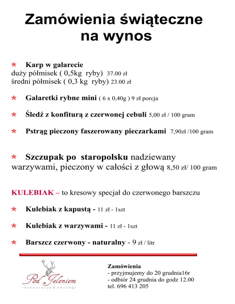 Zamówienia świąteczne na wynos Karp w galarecie duży półmisek ( 0,5kg ryby) 37.00 zł średni półmisek ( 0,3 kg ryby) 23.00 zł Galaretki rybne mini ( 6 x 0,40g ) 9 zł porcja Śledź z konfiturą z czerwonej cebuli 5,00 zł / 100 gram Pstrąg pieczony faszerowany pieczarkami 7,90zł /100 gram Szczupak po staropolsku nadziewany warzywami, pieczony w całości z głową 8,50 zł/ 100 gram KULEBIAK – to kresowy specjał do czerwonego barszczu Kulebiak z kapustą - 11 zł - 1szt Kulebiak z warzywami - 11 zł - 1szt Barszcz czerwony - naturalny - 9 zł / litr Zamówienia - przyjmujemy do 20 grudnia16r - odbiór 24 grudnia do godz 12.00 tel. 696 413 205