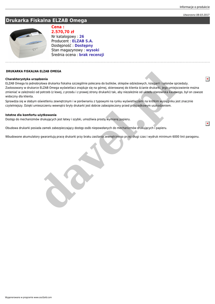 Informacje o produkcie Utworzono 08-03-2017 Drukarka Fiskalna ELZAB Omega Cena : 2.570,70 zł Nr katalogowy : 26 Producent : ELZAB S.A. Dostępność : Dostępny Stan magazynowy : wysoki Średnia ocena : brak recenzji DRUKARKA FISKALNA ELZAB OMEGA l Charakterystyka urządzenia ELZAB Omega to jednobryłowa drukarka fiskalna szczególnie polecana do butików, sklepów odzieżowych, księgarń i salonów sprzedaży. Zastosowany w drukarce ELZAB Omega wyświetlacz znajduje się na górnej, skierowanej do klienta ścianie drukarki. Jego umiejscowienie można zmieniać w zależności od potrzeb (z lewej, z przodu i z prawej strony drukarki) tak, aby niezależnie od układu stanowiska kasowego, był on zawsze widoczny dla klienta. .p Sprawdza się w słabym oświetleniu zewnętrznym i w porównaniu z typowymi na rynku wyświetlaczami na krótkim wysięgniku jest znacznie czytelniejszy. Dzięki umieszczeniu wewnątrz bryły drukarki jest dobrze zabezpieczony przed przypadkowym uszkodzeniem. Istotne dla komfortu użytkowania Dostęp do mechanizmów drukujących jest łatwy i szybki, umożliwia prostą wymianę papieru. ve l Obudowa drukarki posiada zamek zabezpieczający dostęp osób niepowołanych do mechanizmów drukujących i papieru. da Wbudowane akumulatory gwarantują pracę drukarki przy braku zasilania zewnętrznego przez długi czas i wydruk minimum 6000 linii paragonu. Wygenerowano w programie www.oscGold.com ELZAB Omega współpracuje z wieloma popularnymi na rynku programami, zapewniając poprawną komunikację pod DOS, WIN95, 98, 2000, XP, WIN NT, UNIX/LINUX. Gotowa na Euro ELZAB Omega posiada możliwość wydruku linii z informacjami o przyjętych płatnościach (gotówka w złotych, innej walucie, płatność kartą), kursie waluty użytej do zapłaty, jak również wydrukowania informacji o walucie, w której zwrócono resztę. Wydrukiem tych linii steruje program sprzedaży. l Wydruki ELZAB Omega, zgodnie z wymogami polskiego prawa fiskalnego, drukuje wszystkie raporty fiskalne (dobowe, miesięczne oraz okresowe). Ma możliwość druku raportów również w trybie autonomicznym (off-line). Urządzenie udostępnia zestaw formatek niefiskalnych, które program obsługujący sprzedaż może wykorzystać do wydruków różnorakich operacji, takich jak: kasowe: potwierdzenie zapłaty kartą płatniczą, raport kasowy, raport transakcji odłożonych, raport funkcji operatora, raport środków płatności, raport sprzedaży, pokwitowanie wpłaty i wypłaty, raport towarów, cennik, statystyka sprzedaży, • obsługi sprzedaży: przedpłata, zamówienie, bon upominkowy, kupon rabatowy, płatność za pobraniem, rabat dla pracownika, przelew bankowy, • rozliczenia kasjerów: listy kasjerów, raport godzinowy, rozliczenie kasjera, waluta w sejfie, • na stacjach benzynowych: raport tankowania, raport alarmu paliwa, bilet do myjni, raport stanu zbiornika, raport dostawy paliw, karta flotowa, • związane z kartami telefonicznymi: doładowanie karty SIM. ve l .p Współpraca z programami sprzedaży i urządzeniami Współpracując z programem sprzedaży drukarka umożliwia: • realizację sprzedaży: drukowanie paragonów i kontrolne wydruki bazy nazw towarów; • realizację wydruków fiskalnych: fiskalnego dobowego, okresowego szczegółowego i skróconego; • inne wydruki: stanu drukarki, nazw towarów zablokowanych, raportu rozliczeniowego, opisów stałych; • odczyt danych: bieżącego numeru paragonu, bieżącego czasu i daty, numeru raportu dobowego, aktualnych stawek podatkowych, statusu drukarki, numeru unikatowego, sprzedaży; • udzielanie rabatów; • sterowanie szufladą; • konfigurowanie prędkości transmisji pomiędzy komputerem a drukarką: do wyboru prędkości 9 600 bitów/s, 19 200 bitów/s. Do ELZAB Omega można podłączyć szufladę na pieniądze zalecane są » szuflady z rodziny ELZAB Gamma (dostępne w różnych wymiarach, aby optymalnie dopasować je do posiadanego miejsca w punkcie sprzedaży). Pełną swobodę w zakresie generowanych wydruków na współczesnym stanowisku sprzedaży dowolnej branży, zapewnia zestaw, na który składa się drukarka fiskalna ELZAB Omega wraz z małogabarytową drukarką termiczną » ELZAB Talos. Drukarka ELZAB Talos realizuje wówczas wydruki faktur, potwierdzeń, pokwitowań i autoryzacji, bonów, dowodów operacji, tekstów informacyjnych, rozliczeń i podsumowań. Typ: da DANE TECHNICZNE drukarka fiskalna Ilość PLU: 110 000 Stawki VAT: 7 Mechanizm drukujący: 2 mechanizmy termiczne, 40 znaków w wierszu, prędkość druku 15 linii/ sek. każdy Wyświetlacz klienta: LED, 9-cyfrowy z wyświetlanymi napisami RAZEM, RESZTA Złącza: - zasilania - interfejsu RS232 do komputera PC - szuflady na pieniądze typu RJ oraz Mini Jack Zasilanie: - sieciowe (zewnętrzny zasilacz w komplecie) - z akumulatora wewnętrznego 2x6V/1,2Ah Waga: 2,5 kg Wymiary: (gł. x szer. x wys.) 220mm x 236mm x 164mm Współpraca z komputerem: wydruki niefiskalne na drukarce ELZAB Talos Wyposażenie dodatkowe: szuflada ELZAB Gamma szuflada flip top klawiatura programowalna S65A rozdzielacz drukarek ELZAB Omega Materiały eksploatacyjne: - rolka papieru termicznego 57mm/30m/30szt. - rolka papieru termicznego 57mm/30m/120szt.