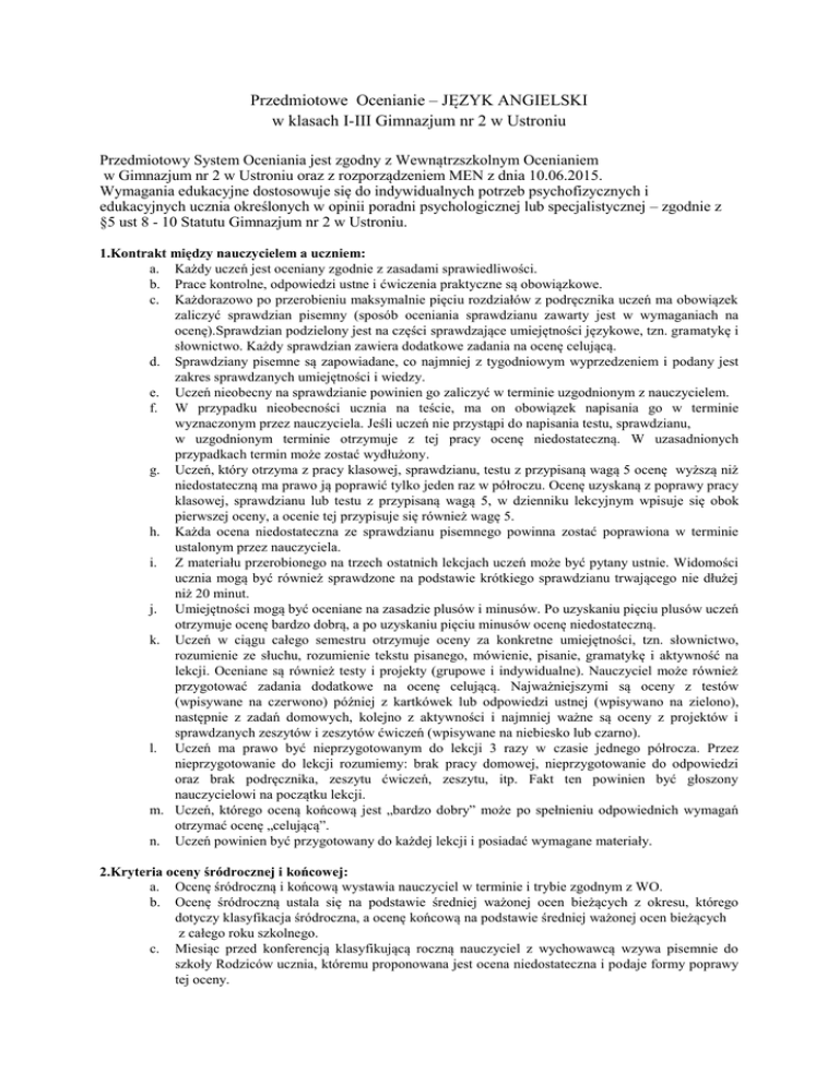 Przedmiotowe Ocenianie – JĘZYK ANGIELSKI w klasach I-III Gimnazjum nr 2 w Ustroniu Przedmiotowy System Oceniania jest zgodny z Wewnątrzszkolnym Ocenianiem w Gimnazjum nr 2 w Ustroniu oraz z rozporządzeniem MEN z dnia 10.06.2015. Wymagania edukacyjne dostosowuje się do indywidualnych potrzeb psychofizycznych i edukacyjnych ucznia określonych w opinii poradni psychologicznej lub specjalistycznej – zgodnie z §5 ust 8 - 10 Statutu Gimnazjum nr 2 w Ustroniu. 1.Kontrakt między nauczycielem a uczniem: a. Każdy uczeń jest oceniany zgodnie z zasadami sprawiedliwości. b. Prace kontrolne, odpowiedzi ustne i ćwiczenia praktyczne są obowiązkowe. c. Każdorazowo po przerobieniu maksymalnie pięciu rozdziałów z podręcznika uczeń ma obowiązek zaliczyć sprawdzian pisemny (sposób oceniania sprawdzianu zawarty jest w wymaganiach na ocenę).Sprawdzian podzielony jest na części sprawdzające umiejętności językowe, tzn. gramatykę i słownictwo. Każdy sprawdzian zawiera dodatkowe zadania na ocenę celującą. d. Sprawdziany pisemne są zapowiadane, co najmniej z tygodniowym wyprzedzeniem i podany jest zakres sprawdzanych umiejętności i wiedzy. e. Uczeń nieobecny na sprawdzianie powinien go zaliczyć w terminie uzgodnionym z nauczycielem. f. W przypadku nieobecności ucznia na teście, ma on obowiązek napisania go w terminie wyznaczonym przez nauczyciela. Jeśli uczeń nie przystąpi do napisania testu, sprawdzianu, w uzgodnionym terminie otrzymuje z tej pracy ocenę niedostateczną. W uzasadnionych przypadkach termin może zostać wydłużony. g. Uczeń, który otrzyma z pracy klasowej, sprawdzianu, testu z przypisaną wagą 5 ocenę wyższą niż niedostateczną ma prawo ją poprawić tylko jeden raz w półroczu. Ocenę uzyskaną z poprawy pracy klasowej, sprawdzianu lub testu z przypisaną wagą 5, w dzienniku lekcyjnym wpisuje się obok pierwszej oceny, a ocenie tej przypisuje się również wagę 5. h. Każda ocena niedostateczna ze sprawdzianu pisemnego powinna zostać poprawiona w terminie ustalonym przez nauczyciela. i. Z materiału przerobionego na trzech ostatnich lekcjach uczeń może być pytany ustnie. Widomości ucznia mogą być również sprawdzone na podstawie krótkiego sprawdzianu trwającego nie dłużej niż 20 minut. j. Umiejętności mogą być oceniane na zasadzie plusów i minusów. Po uzyskaniu pięciu plusów uczeń otrzymuje ocenę bardzo dobrą, a po uzyskaniu pięciu minusów ocenę niedostateczną. k. Uczeń w ciągu całego semestru otrzymuje oceny za konkretne umiejętności, tzn. słownictwo, rozumienie ze słuchu, rozumienie tekstu pisanego, mówienie, pisanie, gramatykę i aktywność na lekcji. Oceniane są również testy i projekty (grupowe i indywidualne). Nauczyciel może również przygotować zadania dodatkowe na ocenę celującą. Najważniejszymi są oceny z testów (wpisywane na czerwono) później z kartkówek lub odpowiedzi ustnej (wpisywano na zielono), następnie z zadań domowych, kolejno z aktywności i najmniej ważne są oceny z projektów i sprawdzanych zeszytów i zeszytów ćwiczeń (wpisywane na niebiesko lub czarno). l. Uczeń ma prawo być nieprzygotowanym do lekcji 3 razy w czasie jednego półrocza. Przez nieprzygotowanie do lekcji rozumiemy: brak pracy domowej, nieprzygotowanie do odpowiedzi oraz brak podręcznika, zeszytu ćwiczeń, zeszytu, itp. Fakt ten powinien być głoszony nauczycielowi na początku lekcji. m. Uczeń, którego oceną końcową jest „bardzo dobry” może po spełnieniu odpowiednich wymagań otrzymać ocenę „celującą”. n. Uczeń powinien być przygotowany do każdej lekcji i posiadać wymagane materiały. 2.Kryteria oceny śródrocznej i końcowej: a. Ocenę śródroczną i końcową wystawia nauczyciel w terminie i trybie zgodnym z WO. b. Ocenę śródroczną ustala się na podstawie średniej ważonej ocen bieżących z okresu, którego dotyczy klasyfikacja śródroczna, a ocenę końcową na podstawie średniej ważonej ocen bieżących z całego roku szkolnego. c. Miesiąc przed konferencją klasyfikującą roczną nauczyciel z wychowawcą wzywa pisemnie do szkoły Rodziców ucznia, któremu proponowana jest ocena niedostateczna i podaje formy poprawy tej oceny. 3. Określenia wagi ocen bieżących: Każdej ocenie cząstkowej przyporządkowuje się liczbę naturalną, oznaczając jej wagę w hierarchii ocen według następujących kategorii: Lp. Oceniane aktywności Waga Kolor zapisu w oceny dzienniku 1 Osiągnięcia w konkursach (etap wojewódzki, 6 czerwony powiatowy). 2 Sprawdzian, test; 5 czerwony Osiągnięcia w konkursach(etap szkolny, miejski). 3 Odbiór tekstu słuchanego; 4 zielony Czytanie ze zrozumieniem; Samodzielna wypowiedź pisemna. 4 Odpowiedź ustna (wypowiedź ustna); 3 zielony Odpowiedź ustna (słówka); Dyktando; Kartkówka 5 Zadanie domowe; 2 czarny Wykonanie prezentacji, referatu, projektu; Wykonanie pomocy dydaktycznych, pracy na rzecz szkoły. 6 Kartkówka z ostatniej lekcji; 1 czarny Praca na lekcji, praca w grupach; Aktywność na lekcji lub jej brak; Zeszyt przedmiotowy, zeszyt ćwiczeń. 4. Kryteria oceny śródrocznej oraz końcowej: Średnie ocen ważonych przełożone na oceny: stopień niedostateczny 0 ≤ x< 1,74; stopień dopuszczający 1,75 ≤ x < 2,5; stopień dostateczny 2,51 ≤ x < 3,5; stopień dobry 3,51 ≤ x < 4,5; stopień bardzo dobry 4,51 ≤ x < 5,5; stopień celujący 5,51 ≤ x ≤ 6,0 oraz spełnienie kryteriów oceny celującej. Pozytywnymi ocenami klasyfikacyjnymi są stopnie: dopuszczający, dostateczny, dobry, bardzo dobry oraz celujący. Negatywną oceną klasyfikacyjną jest ocena niedostateczna. 5. Kryteria ocen w procentach: 100%-90% - bardzo dobry 89%-75% - dobry 74%-51% - dostateczny 50%-33% - dopuszczający 32%-0% - niedostateczny 6. Ocenę celującą (lub ocenę wyższą o stopień) może otrzymać uczeń który: Kwalifikuje się do etapu rejonowego Konkursu Przedmiotowego z Języka Angielskiego LUB Osiąga sukcesy 