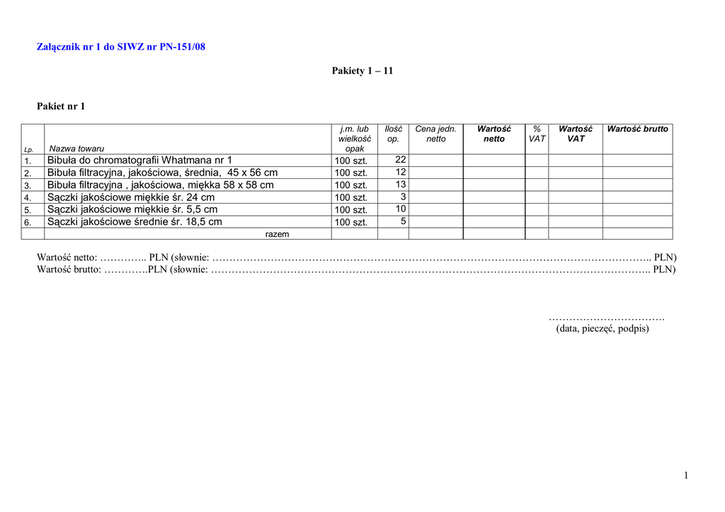 Załącznik nr 1 do SIWZ nr PN-151/08 Pakiety 1 – 11 Pakiet nr 1 j.m. lub wielkość opak Lp. Nazwa towaru 1. 2. 3. 4. 5. 6. Bibuła do chromatografii Whatmana nr 1 Bibuła filtracyjna, jakościowa, średnia, 45 x 56 cm Bibuła filtracyjna , jakościowa, miękka 58 x 58 cm Sączki jakościowe miękkie śr. 24 cm Sączki jakościowe miękkie śr. 5,5 cm Sączki jakościowe średnie śr. 18,5 cm 100 szt. 100 szt. 100 szt. 100 szt. 100 szt. 100 szt. Ilość op. Cena jedn. netto Wartość netto % VAT Wartość VAT Wartość brutto 22 12 13 3 10 5 razem Wartość netto: ………….. PLN (słownie: ……………………………………………………………………………………………………………….. PLN) Wartość brutto: ………….PLN (słownie: ……………………………………………………………………………………………………………….. PLN) ……………………………. (data, pieczęć, podpis) 1 Pakiet nr 2 Lp. 1. Nazwa towaru j.m. lub wielkość opak Wapno absorbcyjne z indykatorem barwnym, wkład z jednorazowym pojemnikiem do aparatu AESPIRE i ADU 800 g Ilość op. Cena jedn. netto Wartość netto % VAT Wartość VAT Wartość brutto 150 Wartość netto: ………….. PLN (słownie: ……………………………………………………………………………………………………………….. PLN) Wartość brutto: ………….PLN (słownie: ……………………………………………………………………………………………………………….. PLN) ……………………………. (data, pieczęć, podpis) Pakiet nr 3 Lp. 1. Nazwa towaru j.m. lub wielkość opak Wapno sodowane z indykatorem do pochłaniacza CO2 4,5 kg Ilość op. Cena jedn. netto Wartość netto % VAT Wartość VAT Wartość brutto 260 Wartość netto: ………….. PLN (słownie: ……………………………………………………………………………………………………………….. PLN) Wartość brutto: ………….PLN (słownie: ……………………………………………………………………………………………………………….. PLN) ……………………………. (data, pieczęć, podpis) 2 Pakiet nr 4 Wzór sumaryczny Lp. 1. 2. 3. 4. 5. 6. 7. 8. 9. 10. 11. 12. 13. 14. 15. 16. 17. 18. 19. Nazwa towaru Aceton cz.d.a. odpow. FPVI Amonu octan cz.d.a. odpow. FP VI Anilina cz.d.a., aminobenzen Chlorek wapnia cz.d.a. odpow. FP VI Eter dietylowy cz.d.a. odpow. FP VI Formalina 36-38% cz.d.a. formaldehyd odp. ACS Formaldehyd, roztwór 37%, pH >4,0 cz.d.a. odp. ACS Glukoza bezwodna cz.d.a. odp. FP VI Ksylen cz.d.a. odp. FP VI Metanol cz.d.a. Octan sodu, bezwodny cz.d.a. odp. ACS, Potasowy fosforan I zasad.(potasu di-wodorofosforan) cz.d.a. odp. FP VI Potasowy wodorotlenek cz.d.a. odp. FP VI Sodowy fosforan II zasad. (di sodu wodorofosforan) cz.d.a. bezw. odp. FP VI Sodowy wodorotlenek cz.d.a. odp. FP VI Sodu tiosiarczan pięciowodny odp. FP VI Toluen cz.d.a. odp. FP VI Tween 20 odp. FP VI Woda amoniakalna 25 % odp. FP VI C3H6O CH3COONH4 C6H5NH2 CaCl2 (C2H5)2O CH2O CH2O C6H12O6 ((C6H4CH3)2 CH3OH CH3COONa KH2PO4 KOH Na2HPO4 NaOH Na2S2O3x5H2O C7H8 - j.m. lub wielkość opak litr kg litr 500 g litr litr 250 ml kg litr litr 500 g kg kg kg kg kg litr litr litr Ilość Cena jedn. netto Wartość netto % VAT Wartość VAT Wartość brutto 12 1 1 1 8 51 4 2 53 2 1 2 1 121 4 2 6 1 2 razem Wartość netto: ………….. PLN (słownie: ……………………………………………………………………………………………………………….. PLN) Wartość brutto: ………….PLN (słownie: ……………………………………………………………………………………………………………….. PLN) ……………………………. (data, pieczęć, podpis) 3 Pakiet nr 5 Wzór sumaryczny Lp. 1. 2. Nazwa towaru Sodu chlorek czystość min 95 % Sodu wodorotlenek TECHN NaCl NaOH j.m. lub wielkość opak 25 kg 25 kg Ilość op. Cena jedn. netto Wartość netto % VAT Wartość VAT Wartość brutto 3500 44 razem Wartość netto: ………….. PLN (słownie: ……………………………………………………………………………………………………………….. PLN) Wartość brutto: ………….PLN (słownie: ……………………………………………………………………………………………………………….. PLN) ……………………………. (data, pieczęć, podpis) Pakiet nr 6 Lp. Nazwa towaru 1. Parafina do mikroskopii z dodatkiem 8% DMSO j.m. lub wielkość opak 8 kg Ilość op. Cena jedn. netto Wartość netto % VAT Wartość VAT Wartość brutto 250 Wartość netto: ………….. PLN (słownie: ……………………………………………………………………………………………………………….. PLN) Wartość brutto: ………….PLN (słownie: ……………………………………………………………………………………………………………….. PLN) ……………………………. (data, pieczęć, podpis) 4 Pakiet nr 7 Wzór sumaryczny Lp. 1. 2. 3. 4. 5. 6. 7. 8. 9. Nazwa towaru 2-Propanol czystość do biologii molekularnej EDTA, sól dwusodowa dwuwodna czystość do biologii molekularnej EDTA, (roztwór 0,5M, pH 8,0) czystość do biologii molekularnej Formaldehyd dejonizowany (amid kwasu mrówk.) czystość do biologii molekularnej Glicerol absolutny czystość do biologii molekularnej Nadsiarczan amonu czystość do biologii molekularnej Temed (N,N,N,N' tetrametyloetylenodiamina) czystość do biologii molekularnej Triton X-100 100 ml czystość do biologii molekularnej Tween 20 czystość do biologii molekularnej j.m. lub wielkość opak C3H7OH 500 ml C10H14O8N2Na2 x 2H2O 250 g C10H14O8N2Na2 x 2H2O 100 ml CH3NO 250 ml Ilość op. Cena jedn. netto Wartość netto % VAT Wartość VAT Wartość bru