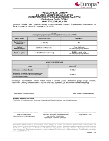 TABELA OPŁAT I LIMITÓW DO UMÓW UBEZPIECZENIA NA ŻYCIE Z UBEZPIECZENIOWYM FUNDUSZEM KAPITAŁOWYM „Ekologiczny Portfel FIZ Bis” (kod: 2015_EKP_02_v.01) Niniejsza Tabela Opłat i Limitów została przyjęta Uchwałą Zarządu Towarzystwa Ubezpieczeń na Życie Europa S.A. nr 02/02/15 z dnia 24.02.2015 r. OPŁATY szczegółowy sposób pobierania opłat określony jest w OWU nazwa opłaty sposób naliczania wysokość Opłata Wstępna od Składki od Składki 0% Opłata Administracyjna od Wartości Rachunku 3% w skali roku (za rok przyjmuje się 365 dni) Opłata za ryzyko od Składki Zainwestowanej 0,028% w skali roku (za rok przyjmuje się 365 dni) WARTOŚCI MINIMALNE rodzaj wysokość Minimalna wysokość Składki 10 000 zł Minimalna wysokość kwoty przeznaczonej na nabycie Jednostek Uczestnictwa UFK z tytułu zapłaty Składki 10 000 zł Niniejszym potwierdzam odbiór Tabeli Opłat i Limitów przed złożeniem podpisanego Wniosku o zawarcie Umowy Ubezpieczenia, zapoznanie się z jej treścią, jej zrozumienie oraz akceptację. data i podpis Ubezpieczonego data i podpis Ubezpieczającego Wypełnia upoważniona osoba: Potwierdza się własnoręczność złożonego podpisu przez Ubezpieczającego oraz Ubezpieczonego. …………………………………………... ………..………..…….…….………………. ……………………………………. imię i nazwisko osoby wykonującej czynności agencyjne pieczątka służbowa, pieczątka oddziału oraz czytelny podpis osoby wykonującej czynności agencyjne miejscowość i data Towarzystwo Ubezpieczeń na Życie Europa Spółka Akcyjna z siedzibą we Wrocławiu pod adresem: ul. Gwiaździsta 62, 53-413 Wrocław, wpisane do Rejestru Przedsiębiorców Krajowego Rejestru Sądowego prowadzonego przez Sąd Rejonowy dla Wrocławia – Fabrycznej we Wrocławiu, VI Wydział Gospodarczy Krajowego Rejestru Sądowego pod numerem KRS 0000092396, o numerze REGON 932716961 i numerze NIP 8951765137, kapitał zakładowy zarejestrowany i w całości opłacony 307 200 000 zł. Strona 1 z 1