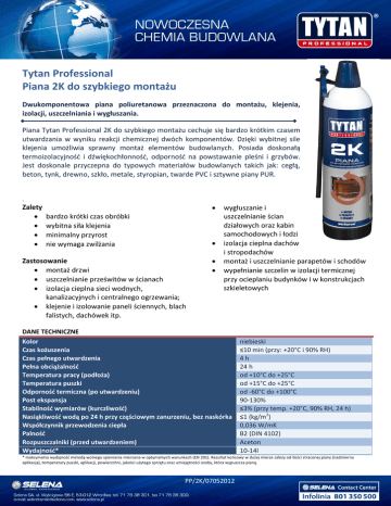 Tytan Professional Piana 2K do szybkiego montażu Dwukomponentowa piana poliuretanowa przeznaczona do montażu, klejenia, izolacji, uszczelniania i wygłuszania. Piana Tytan Professional 2K do szybkiego montażu cechuje się bardzo krótkim czasem utwardzania w wyniku reakcji chemicznej dwóch komponentów. Dzięki wybitnej sile klejenia umożliwia sprawny montaż elementów budowlanych. Posiada doskonałą termoizolacyjność i dźwiękochłonność, odporność na powstawanie pleśni i grzybów. Jest doskonale przyczepna do typowych materiałów budowlanych takich jak: cegłą, beton, tynk, drewno, szkło, metale, styropian, twarde PVC i sztywne piany PUR. . Zalety bardzo krótki czas obróbki wybitna siła klejenia minimalny przyrost nie wymaga zwilżania Zastosowanie montaż drzwi uszczelnianie prześwitów w ścianach izolacja cieplna sieci wodnych, kanalizacyjnych i centralnego ogrzewania; klejenie i izolowanie paneli ściennych, blach falistych, dachówek itp. wygłuszanie i uszczelnianie ścian działowych oraz kabin samochodowych i łodzi izolacja cieplna dachów i stropodachów montaż i uszczelnianie parapetów i schodów wypełnianie szczelin w izolacji termicznej przy ocieplaniu budynków i w konstrukcjach szkieletowych DANE TECHNICZNE Kolor Czas kożuszenia Czas pełnego utwardzenia Pełna obciążalność Temperatura pracy (podłoża) Temperatura puszki Odporność termiczna (po utwardzeniu) Post ekspansja Stabilność wymiarów (kurczliwość) Nasiąkliwość wodą po 24 h przy częściowym zanurzeniu, bez naskórka Współczynnik przewodzenia ciepła Palność Rozpuszczalniki (przed utwardzeniem) Wydajność* niebieski ≤10 min (przy: +20°C i 90% RH) 4h 24 h od +10°C do +25°C od +15°C do +25°C od -60°C do +100°C 90-130% ≤3% (przy temp. +20°C, 90% RH, 24 h) ≤1 (kg/m2) 0,036 W/mK B2 (DIN 4102) Aceton 10-14l * maksymalna wydajność metodą wolnego spieniania mierzona w optymalnych warunkach (EN 291). Rezultat końcowy w dużej mierze zależy od ilości straconej piany (nadmierna aplikacja), temperatury puszki, aplikacji, powierzchni, jakości użytego sprzętu oraz umiejętności osoby, która wypuszcza pianę. PP/2K/07052012 SPOSÓB UŻYCIA Przygotowanie ościeżnicę drzwiową zamontować i rozeprzeć osadzanie drzwi należy wykonywać zgodnie z zaleceniami producenta i powinno odbywać się z użyciem łączników mechanicznych zawartość puszki doprowadzić do optymalnej temperatury +20°C (Nie aktywować piany gdy temperatura puszki jest powyżej +25°C). założyć rękawiczki następnie aktywować pianę poprzez przekręcenie plastikowego pokrętła na dnie puszki min. 5 obrotów zgodnie ze strzałkami umieszczonymi na spodzie pokrętła. mocno i intensywnie wstrząsać puszką (ok. 40 sekund) na przemian (zaworem w dół i zaworem do góry) w celu dokładnego wymieszania składników zdjąć kołpak ochronny i przykręcić aplikator niebieski równomierny kolor piany świadczy o prawidłowym wymieszaniu składników. W przypadku braku niebieskiego koloru piany ponownie przekręcić plastikowym pokrętłem na dnie puszki i wymieszać zawartość. podczas wypuszczania piany, na skutek reakcji chemicznej dwóch składników, dochodzi do ogrzania puszki, dlatego konieczne jest całkowite opróżnienie puszki w ciągu 5 minut od ich wymieszania. W przypadku braku możliwości całkowitego opróżnienia puszki i znacznemu wzrostowi temperatury, należy schłodzić puszkę w zimnej wodzie. aktywowaną pianę zużyć w ciągu 5 minut wielkość strumienia piany reguluje się przez siłę nacisku na rączkę aplikatora wypełniać szczeliny do szerokości nie większej niż 3 cm, szersze wypełniać warstwami, piana powiększa swoją objętość po nałożeniu, dlatego też należy wypełniać szczeliny w 70% ich głębokości nadmiar piany po utwardzeniu usunąć metodami mechanicznymi (np. nożem). Pianę przed jej utwardzeniem możemy usunąć czyścikiem TYTAN. Klasa palności B2 (DIN 4102) Zawartość netto 400 ml utwardzoną pianę należy zabezpieczyć i osłonić tynkiem, farbą lub innymi materiałami zabezpieczającymi przed promieniami UV OGRANICZENIA STOSOWANIA Piana utwardza się poprzez reakcję chemiczną. Nie używać wody do zwilżania powierzchni roboczych oraz piany. Produkt nie przylega do polietylenu, polipropylenu, poliamidu, silikonu i teflonu. Pełne utwardzanie następuje po 4 h, zbyt wczesne próby wstępnej obróbki mogą powodować nieodwracalne zmiany w strukturze piany oraz wpływają na pogorszenie się parametrów użytkowych piany. Piana jednorazowego użytku. W przypadku niecałkowitego zużycia piany, puszkę należy schłodzić. Ponowna aplikacja takiej piany nie jest możliwa Przed użyciem należy zapoznać się z kartą techniczną producenta i wykonać próbę wypuszczenia piany. PRZECHOWYWANIE I OPAKOWANIE Termin ważności wynosi 9 miesięcy od daty produkcji. Produkt przechowywać w suchym i chłodnym miejscu, w oryginalnie zapakowanych pojemnikach, „zaworem do góry”. Temperatura przechowywania: od +5°C do +25°C. Przechowywanie w temperaturze 0 większej niż +25 C skraca okres przydatności produktu do użycia, wpływając negatywnie na jego parametry Nie jest dozwolone przechowywanie pojemników z pianą w temp. powyżej +50C i w pobliżu otwartego ognia. Puszki przechowywać w pozycji pionowej. Przechowywanie produktu w pozycji innej niż zalecana może doprowadzić do blokady zaworu. Puszki nie wolno zgniatać ani przebijać nawet po całkowitym opróżnieniu. temperatura czas transportu piany o <-20 C o o od -20 C do -10 C o o od -9 C do 0 C Opakowanie Puszka 4 dni 7 dni 10 dni Ilość sztuk w kartonie 9 Ilość sztuk na palecie 720 Normy i Atesty Aprobata Techniczna Instytutu Techniki Budowlanej Nr: AT-15-8415/2010 Ostrzeżenia i zalecenia BHP PRZED ZASTOSOWANIEM NALEŻY ZAPOZNAĆ SIĘ Z KARTĄ BEZPIECZEŃSTWA PRODUKTU LUB PRZECZYTAĆ ETYKIETĘ NA OPAKOWANIU. Data sporządzenia 07.05.2012 Powyższe dane, 