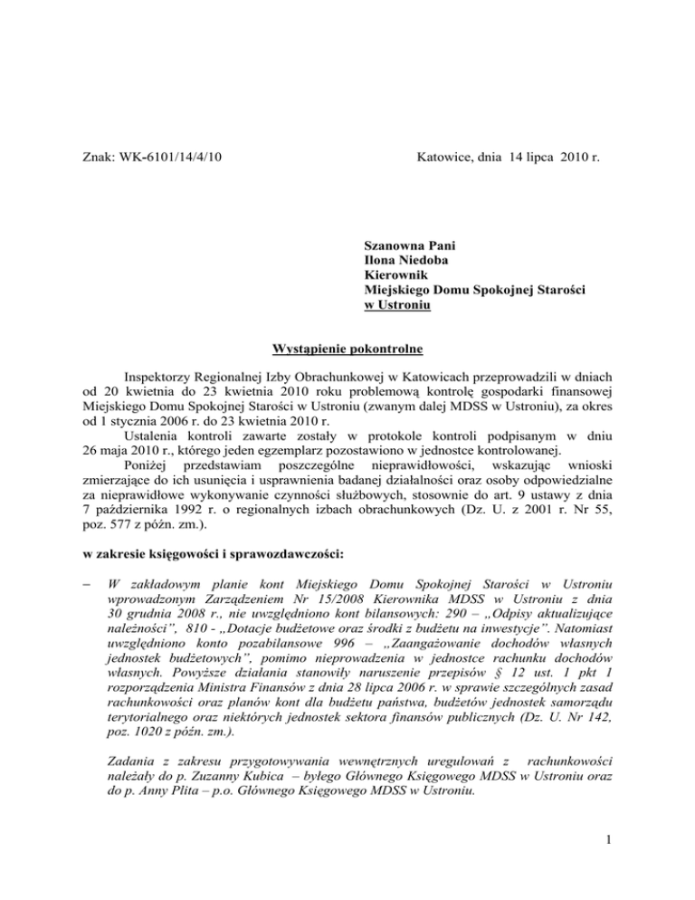 Znak: WK-6101/14/4/10 Katowice, dnia 14 lipca 2010 r. Szanowna Pani Ilona Niedoba Kierownik Miejskiego Domu Spokojnej Starości w Ustroniu Wystąpienie pokontrolne Inspektorzy Regionalnej Izby Obrachunkowej w Katowicach przeprowadzili w dniach od 20 kwietnia do 23 kwietnia 2010 roku problemową kontrolę gospodarki finansowej Miejskiego Domu Spokojnej Starości w Ustroniu (zwanym dalej MDSS w Ustroniu), za okres od 1 stycznia 2006 r. do 23 kwietnia 2010 r. Ustalenia kontroli zawarte zostały w protokole kontroli podpisanym w dniu 26 maja 2010 r., którego jeden egzemplarz pozostawiono w jednostce kontrolowanej. PoniŜej przedstawiam poszczególne nieprawidłowości, wskazując wnioski zmierzające do ich usunięcia i usprawnienia badanej działalności oraz osoby odpowiedzialne za nieprawidłowe wykonywanie czynności słuŜbowych, stosownie do art. 9 ustawy z dnia 7 października 1992 r. o regionalnych izbach obrachunkowych (Dz. U. z 2001 r. Nr 55, poz. 577 z późn. zm.). w zakresie księgowości i sprawozdawczości: − W zakładowym planie kont Miejskiego Domu Spokojnej Starości w Ustroniu wprowadzonym Zarządzeniem Nr 15/2008 Kierownika MDSS w Ustroniu z dnia 30 grudnia 2008 r., nie uwzględniono kont bilansowych: 290 – „Odpisy aktualizujące naleŜności”, 810 - „Dotacje budŜetowe oraz środki z budŜetu na inwestycje”. Natomiast uwzględniono konto pozabilansowe 996 – „ZaangaŜowanie dochodów własnych jednostek budŜetowych”, pomimo nieprowadzenia w jednostce rachunku dochodów własnych. PowyŜsze działania stanowiły naruszenie przepisów § 12 ust. 1 pkt 1 rozporządzenia Ministra Finansów z dnia 28 lipca 2006 r. w sprawie szczególnych zasad rachunkowości oraz planów kont dla budŜetu państwa, budŜetów jednostek samorządu terytorialnego oraz niektórych jednostek sektora finansów publicznych (Dz. U. Nr 142, poz. 1020 z późn. zm.). Zadania z zakresu przygotowywania wewnętrznych uregulowań z rachunkowości naleŜały do p. Zuzanny Kubica – byłego Głównego Księgowego MDSS w Ustroniu oraz do p. Anny Plita – p.o. Głównego Księgowego MDSS w Ustroniu. 1 Wniosek nr 1 Uzupełnić zakładowy plan kont o konta 290-„Odpisy aktualizujące naleŜności” i 810-„Dotacje budŜetowe oraz środki z budŜetu na inwestycje” i ustalić zasady klasyfikacji zdarzeń na tych kontach, mając na uwadze przepisy art. 10 ust. 1 pkt 3 ustawy z dnia 29 września 1994 r. o rachunkowości (Dz. U. z 2009 r. Nr 157, poz. 1240 z późn. zm.) i § 12 ust. 1 rozporządzenia Ministra Finansów z dnia 28 lipca 2006 r. w sprawie szczególnych zasad rachunkowości oraz planów kont dla budŜetu państwa, budŜetów jednostek samorządu terytorialnego oraz niektórych jednostek sektora finansów publicznych (Dz. U. Nr 142, poz. 1020 z późn. zm.). − Przy prowadzeniu ksiąg rachunkowych za lata 2008 – 2009 stwierdzono następujące nieprawidłowości: • w latach 2008 – 2009 nie prowadzono zapisów w ewidencji księgowej na kontach pozabilansowych: 980 – „Plan finansowy wydatków budŜetowych”, 998 – „ZaangaŜowanie wydatków roku budŜetowego”, 999 – „ZaangaŜowanie wydatków przyszłych lat”. Naruszono tym postanowienia § 12 ust. 1 rozporządzenia Ministra Finansów z dnia 28 lipca 2006 r. w sprawie szczególnych zasad rachunkowości oraz planów kont dla budŜetu państwa, budŜetów jednostek samorządu terytorialnego oraz niektórych jednostek sektora finansów publicznych (Dz. U. Nr 142, poz. 1020 z późn. zm.) oraz obowiązującego w 2009 r. Zarządzenia Nr 15/2008 Kierownika MDSS z dnia 30 grudnia 2008 r. Ww. zarządzeniu wprowadzono i opisano zasady funkcjonowania kont: 980, 998, 999. • w latach 2008 - 2009 ujmowano na koncie 229 - „Pozostałe rozrachunki publicznoprawne” potracenia z list wynagrodzeń pracowniczych: z tytułu zapłaty przez pracownika składek PZU, składek członkowskich na rzecz organizacji np. Izby Pielęgniarek, składek i spłaty rat poŜyczek MKZP. Zgodnie z postanowieniami rozporządzenia Ministrów Finansów z dnia 28 lipca 2006 r. w sprawie szczególnych zasad rachunkowości oraz planów kont dla budŜetu państwa, budŜetów jednostek samorządu terytorialnego oraz niektórych jednostek sektora finansów publicznych (Dz. U. Nr 142, poz. 1020 z późn. zm.), operacje ww. winny być ujmowane na koncie 240 – „Pozostałe rozrachunki”. Zasady takie ewidencji rozrachunków na kontach zespołu 2 zostały określone w Zarządzeniu Nr 15/2008 Kierownika MDSS z dnia 30 grudnia 2008 r. • na koniec 2008 r. i 2009 r. ujęto na koncie 225 – „Rozrachunki z budŜetami” zobowiązanie MDSS wobec Urzędu Skarbowego z tytułu podatku dochodowego od osób fizycznych, naliczonego od dodatkowego wynagrodzenia rocznego za 2008 r. i 2009 r. Wysokość dodatkowego wynagrodzenia rocznego, ustalono na podstawie ustawy z dnia 12 grudnia 1997 r. o dodatkowym wynagrodzeniu rocznym pracowników sfery budŜetowej (Dz. U. Nr 160, poz. 1080 z późn. zm.), którego wypłata przypadała w roku następnym. W myśl art. 38 ust. 1 w związku z art. 31 ustawy z dnia 26 lipca 1991 r. o podatku dochodowym od osób fizycznych (Dz. U. z 2000 r. Nr 14, poz. 176, z późn. zm.), zakłady pracy jako płatnicy, są obowiązane obliczyć i pobrać w ciągu roku zaliczki na podatek dochodowy od osób, które uzyskują od tych zakładów przychody m.in. ze stosunku pracy, następnie przekazać do Urzędu Skarbowego kwoty pobranych zaliczek w terminie do dnia 20 miesiąca następującego po miesiącu, w którym pobrano zaliczki. Zobowiązanie wobec Urzędu Skarbowego powstawało w momencie dokonania wypłaty wynagrodzenia, czyli w następnym roku. • na koniec 2008 r. i 2009 r. ujęto na koncie 229 – „Pozostałe rozrachunki publicznoprawne” zobowiązanie MDSS w Ustroniu wobec Zakładu Ubezpieczeń Społecznych z tytułu kwot składek na ubezpieczenie społeczne i zdrowotne obciąŜających 2 pracownika, naliczonych od dodatkowego