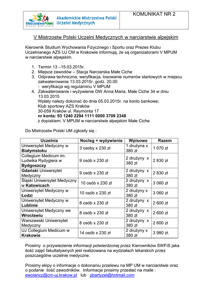KOMUNIKAT NR 2 V Mistrzostw Polski Uczelni Medycznych w narciarstwie alpejskim Kierownik Studium Wychowania Fizycznego i Sportu oraz Prezes Klubu Uczelnianego AZS UJ CM w Krakowie informują, że są organizatorami V MPUM w narciarstwie alpejskim. 1. Termin 13 –15.03.2015r. 2. Miejsce zawodów – Stacja Narciarska Małe Ciche 3. Odprawa techniczna, weryfikacja, losowanie numerów startowych w miejscu zakwaterowania 13.03.2015r. godz. 20.00 - weryfikacja wg regulaminu V MPUM 4. Zakwaterowanie i wyżywienie DW Anna Maria, Małe Ciche 34 w dniu 13.03.2015 Wpłaty należy dokonać do dnia 05.03.2015r. na konto bankowe; Klub sportowy AZS Kraków 30-059 Kraków ul. Reymonta 17 nr konta: 93 1240 2294 1111 0000 3709 2348 z dopiskiem: V MPUM w narciarstwie alpejskim Małe Ciche Do Mistrzostw Polski UM zgłosiły się : Uczelnia Uniwersytet Medyczny w Białymstoku Collegium Medicum im. Ludwika Rydygiera w Bydgoszczy Gdański Uniwersytet Medyczny Śląski Uniwersytet Medyczny w Katowicach Uniwersytet Medyczny w Łodzi Uniwersytet Medyczny w Lublinie Uniwersytet Medyczny we Wrocławiu Warszawski Uniwersytet Medyczny UJ Collegium Medicum w Krakowie Nocleg + wyżywienie 3 osoby x 230 zł Wpisowe 1 drużyna x 380 zł 9 osób x 230 zł 2 drużyny x 2 830 zł 380 zł 9 osób x 230 zł 10 osób x 230 zł 10 osób x 230 zł 8 osób x 230 zł 8 osób x 230 zł 8 osób x 230 zł 14 osób x 230 zł 2 drużyny x 380 zł 2 drużyny x 380 zł 2 drużyny x 380 zł 2 drużyny x 380 zł 2 drużyny x 380 zł 2 drużyny x 380 zł 2 drużyny x 380 zł Razem 1 070 zł 2 830 zł 3 060 zł 3 060 zł 2 600 zł 2 600 zł 2 600 zł 3 980 zł. Prosimy o przywiezienie informacji potwierdzonej przez Kierowników SWFiS jaka ilość zajęć fakultatywnych jest realizowana na wydziałach lekarskich przez poszczególne uczelnie medyczne. Prosimy ekipy o informacje o dokonaniu przelewu na MP UM w narciarstwie oraz o podanie ilość zawodników. Informacje prosimy przesłać na maile : [email protected] lub [email protected] W razie pytań prosimy o kontakt z kierownikiem SWFiS UJ CM ds. sportu mgr Przemysław Bartyzel 503 035 052 Z poważaniem Przemysław Bartyzel