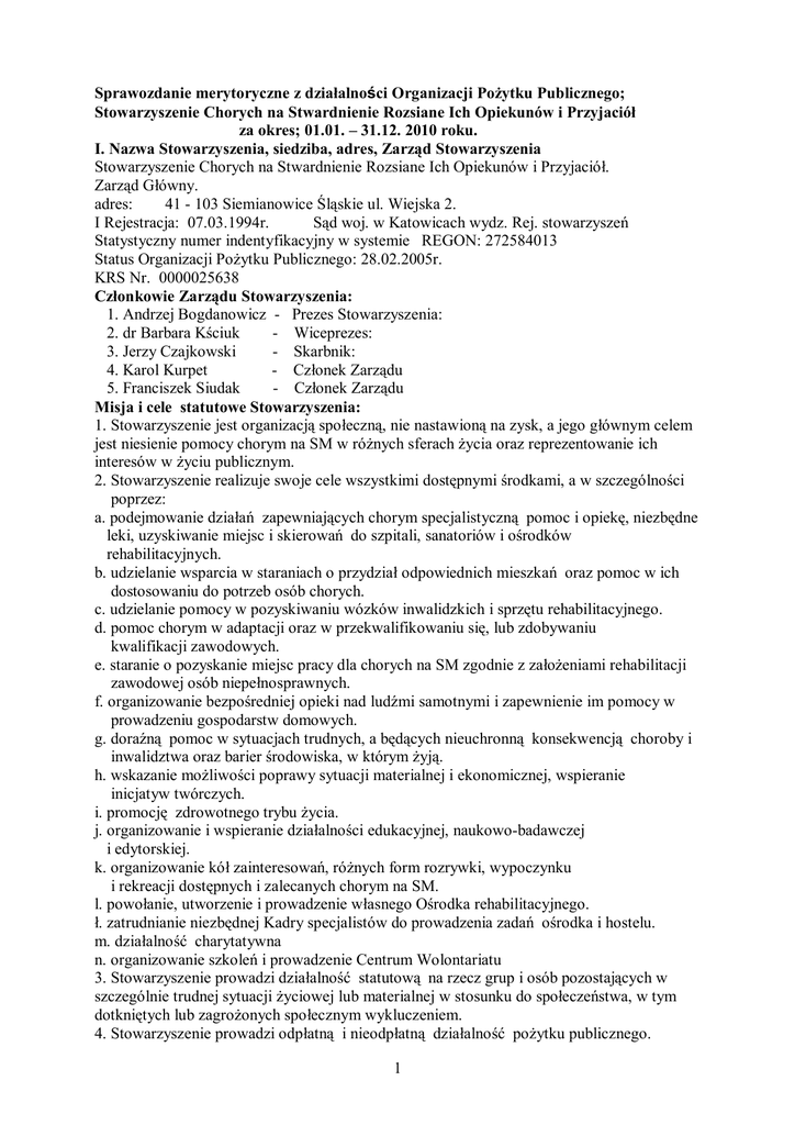Sprawozdanie merytoryczne z działalności Organizacji Pożytku Publicznego; Stowarzyszenie Chorych na Stwardnienie Rozsiane Ich Opiekunów i Przyjaciół za okres; 01.01. – 31.12. 2010 roku. I. Nazwa Stowarzyszenia, siedziba, adres, Zarząd Stowarzyszenia Stowarzyszenie Chorych na Stwardnienie Rozsiane Ich Opiekunów i Przyjaciół. Zarząd Główny. adres: 41 - 103 Siemianowice Śląskie ul. Wiejska 2. I Rejestracja: 07.03.1994r. Sąd woj. w Katowicach wydz. Rej. stowarzyszeń Statystyczny numer indentyfikacyjny w systemie REGON: 272584013 Status Organizacji Pożytku Publicznego: 28.02.2005r. KRS Nr. 0000025638 Członkowie Zarządu Stowarzyszenia: 1. Andrzej Bogdanowicz - Prezes Stowarzyszenia: 2. dr Barbara Kściuk - Wiceprezes: 3. Jerzy Czajkowski - Skarbnik: 4. Karol Kurpet - Członek Zarządu 5. Franciszek Siudak - Członek Zarządu Misja i cele statutowe Stowarzyszenia: 1. Stowarzyszenie jest organizacją społeczną, nie nastawioną na zysk, a jego głównym celem jest niesienie pomocy chorym na SM w różnych sferach życia oraz reprezentowanie ich interesów w życiu publicznym. 2. Stowarzyszenie realizuje swoje cele wszystkimi dostępnymi środkami, a w szczególności poprzez: a. podejmowanie działań zapewniających chorym specjalistyczną pomoc i opiekę, niezbędne leki, uzyskiwanie miejsc i skierowań do szpitali, sanatoriów i ośrodków rehabilitacyjnych. b. udzielanie wsparcia w staraniach o przydział odpowiednich mieszkań oraz pomoc w ich dostosowaniu do potrzeb osób chorych. c. udzielanie pomocy w pozyskiwaniu wózków inwalidzkich i sprzętu rehabilitacyjnego. d. pomoc chorym w adaptacji oraz w przekwalifikowaniu się, lub zdobywaniu kwalifikacji zawodowych. e. staranie o pozyskanie miejsc pracy dla chorych na SM zgodnie z założeniami rehabilitacji zawodowej osób niepełnosprawnych. f. organizowanie bezpośredniej opieki nad ludźmi samotnymi i zapewnienie im pomocy w prowadzeniu gospodarstw domowych. g. doraźną pomoc w sytuacjach trudnych, a będących nieuchronną konsekwencją choroby i inwalidztwa oraz barier środowiska, w którym żyją. h. wskazanie możliwości poprawy sytuacji materialnej i ekonomicznej, wspieranie inicjatyw twórczych. i. promocję zdrowotnego trybu życia. j. organizowanie i wspieranie działalności edukacyjnej, naukowo-badawczej i edytorskiej. k. organizowanie kół zainteresowań, różnych form rozrywki, wypoczynku i rekreacji dostępnych i zalecanych chorym na SM. l. powołanie, utworzenie i prowadzenie własnego Ośrodka rehabilitacyjnego. ł. zatrudnianie niezbędnej Kadry specjalistów do prowadzenia zadań ośrodka i hostelu. m. działalność charytatywna n. organizowanie szkoleń i prowadzenie Centrum Wolontariatu 3. Stowarzyszenie prowadzi działalność statutową na rzecz grup i osób pozostających w szczególnie trudnej sytuacji życiowej lub materialnej w stosunku do społeczeństwa, w tym dotkniętych lub zagrożonych społecznym wykluczeniem. 4. Stowarzyszenie prowadzi odpłatną i nieodpłatną działalność pożytku publicznego. 1 Działalność nieodpłatna to: Działalność fizjoterapeutyczna, prowadzenie grupowej i indywidualnej rehabilitacji społecznej i leczniczej, prowadzenie grupowych i indywidualnych zajęć w zakresie fizykoterapii, ( 85.14.A ) Pomoc społeczna pozostała, bez zakwaterowania ( 85.32.C ) Organizowanie prac badawczo rozwojowych, naukowo badawczej i edytorskiej w dziedzinie psychologii i socjologii ( 73.20.H ) Działalność pielęgniarek ( 85.14.C ) Działalność związana z ochroną zdrowia pozostała, gdzie indziej nie sklasyfikowana ( 85.14.F ) Działalność pozostałych organizacji członkowskich, gdzie indziej nie sklasyfikowana ( 91.33.Z ) Działalność psychologiczna i psychoterapeutyczna, pomoc psychologiczna, grupy wsparcia ( 85.14.D ) Działalność odpłatna to: Pomoc społeczna pozostała, z zakwaterowaniem, prowadzenie stacjonarnej placówki dla chorych na s. m. ( 85.31.B ) Działalność paramedyczna ( 85.14.E ) Organizowanie rozrywki, rekreacji, wypoczynku i turystyki osób niepełnosprawnych ( 92.34.Z ) Wydawanie książek, czasopism, broszur i folderów ( 22.11.Z ) Kształcenie ustawiczne dorosłych i pozostałe formy kształcenia, gdzie indziej nie sklasyfikowane ( 80.42.B ) W 2010 roku Stowarzyszenie nie prowadziło działalności odpłatnej. II. Działalność Statutowa Stowarzyszenia w 2010 roku. Podjęte działania na rzecz Członków Stowarzyszenia w 2010 roku 1. Kompleksowa i ciągła rehabilitacja społeczna i lecznicza chorych i ich rodzin. 2. Spotkania informacyjne, pogadanki, prowadzenie grup wsparcia, telefon informacji i zaufania. 3. Aplikowanie o pozyskanie środków na działalność stowarzyszenia. 4. Zatrudnianie niezbędnej kadry specjalistów do prowadzenia rehabilitacji. 5. Imprezy integracyjne; Festyny integracyjne, ogniska, grill. 6. Transport chorych do ośrodka, na spotkania i rehabilitację. 7. Dalszy remont i adaptacja ośrodka. 8. Stała współpraca z Kliniką Neurologii Śl. A.M. w Katowicach Ligocie 9. Współpraca z Samorządem Lokalnym Miast i Gmin. 10. Współpraca z Mediami lokalnymi. 11. Pozyskiwanie Wolontariuszy do prac w Ośrodku oraz odwiedzin chorych. 12. Organizacja obchodów ogłoszonego II Światowego dnia chorych na stwardnienie rozsiane. 13. Organizacja tradycyjnego Integracyjnego Festynu w Ośrodku 14. Przeprowadzenie kompleksowych badań okulistycznych w Poradni w Katowicach dla ok. 80 beneficjentów. 15. Organizacja turnusu rehabilitacyjnego w Międzywodziu. 16. Organizacja wyjazdowych szkoleń dla chorych oraz opiekunów 17. Organizacja spotkania opłatkowego oraz wigilijnego 18. Organizacja paczek mikołajkowo świątecznych dla najuboższych członków 2 Sprawozdanie merytoryczne z działalności Stowarzyszenia Chorych na Stwardnienie Rozsiane Ich Opiekunów I Przyjaciół w Siemianowicach Śl. Za rok 2010. Stowarzyszenie w 2010 kontynuowało program, w zakresie rozpoczętego w 1999 roku zadania w zakresie reha