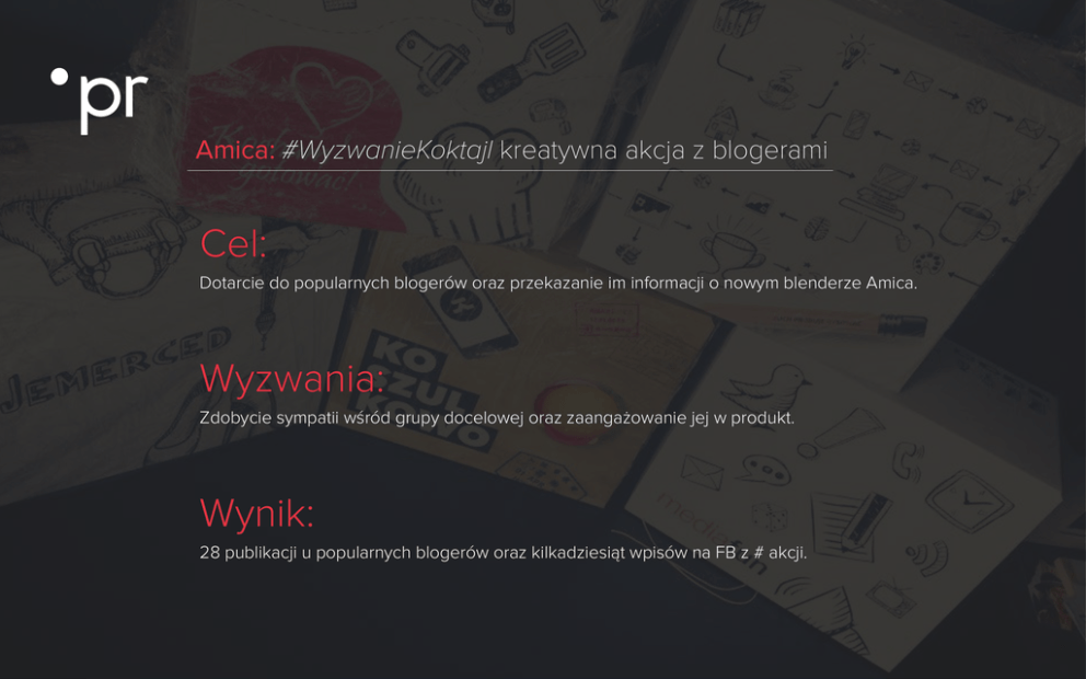 Amica: #WyzwanieKoktajl kreatywna akcja z blogerami Cel: Dotarcie do popularnych blogerów oraz przekazanie im informacji o nowym blenderze Amica. Wyzwania: Zdobycie sympatii wśród grupy docelowej oraz zaangażowanie jej w produkt. Wynik: 28 publikacji u popularnych blogerów oraz kilkadziesiąt wpisów na FB z # akcji. ZAŁOŻENIA PROJEKTU Cele Dotarcie do wybranych blogerów oraz zaangażowanie ich w promocję nowego produktu Amica – blender. Zaangażowanie blogerów i zbudowanie dłuższych relacji celem dalszej współpracy. Rozpropagowanie hashtagu #wyzwaniekoktajl oraz zaangażowanie społeczności z fan page do przesyłania swoich własnych przepisów. Zdobycie zasięgu w social media dla akcji. Opis projektu Cała akcja była prowadzona w myśl głównego przesłania Amica – Inteligentny styl. Każdemu z blogerów zaproponowano stylowy i zdrowy koktajl zgodnie z jego upodobaniami. Akcja wspierana była #WyzwanieKoktajl. POMYSŁ I REALIZACJA Agencja w ramach działań komunikacyjnych dla klienta, celem promocji nowego produktu AGD, zdecydowała się na zaangażowanie 30 blogerów (w tym z: JeMerced, Koszulkowo.com, Zuch Rysuje, Mediafun i Kocham Gotować) do przygotowanie swoich przepisów na koktajle owocowe. Pierwszym etapem akcji było przesłanie wybranym blogerom produktu klineta (blendera) wraz z przepisem na koktajl oraz personalizowanym listem z propozycją przygotowania swojego własnego przepisu. W drugim etapie kreatywna wysyłka dotarła do 25 kolejnych blogerów. Akcję rozszerzono także o konkurs na fan page Amica, na którym fani mogli zgłaszać swoje pomysły na zdrowe i ciekawe koktajle – walcząc tym samym o nagrody. EFEKTY DZIAŁAŃ Ponad 28 publikacji na blogach i kilkadziesiąt wpisów na platoformie Facebook z użyciem #hastaga akcji. Zdobycie ponad 40 przepisów do specjalnej publikacji Amica. Nawiązanie stałej relacji z wybranymi blogerami i stworzenie z nich ambasadorów marki. Grupa dotPR [email protected] +48 604 705 233