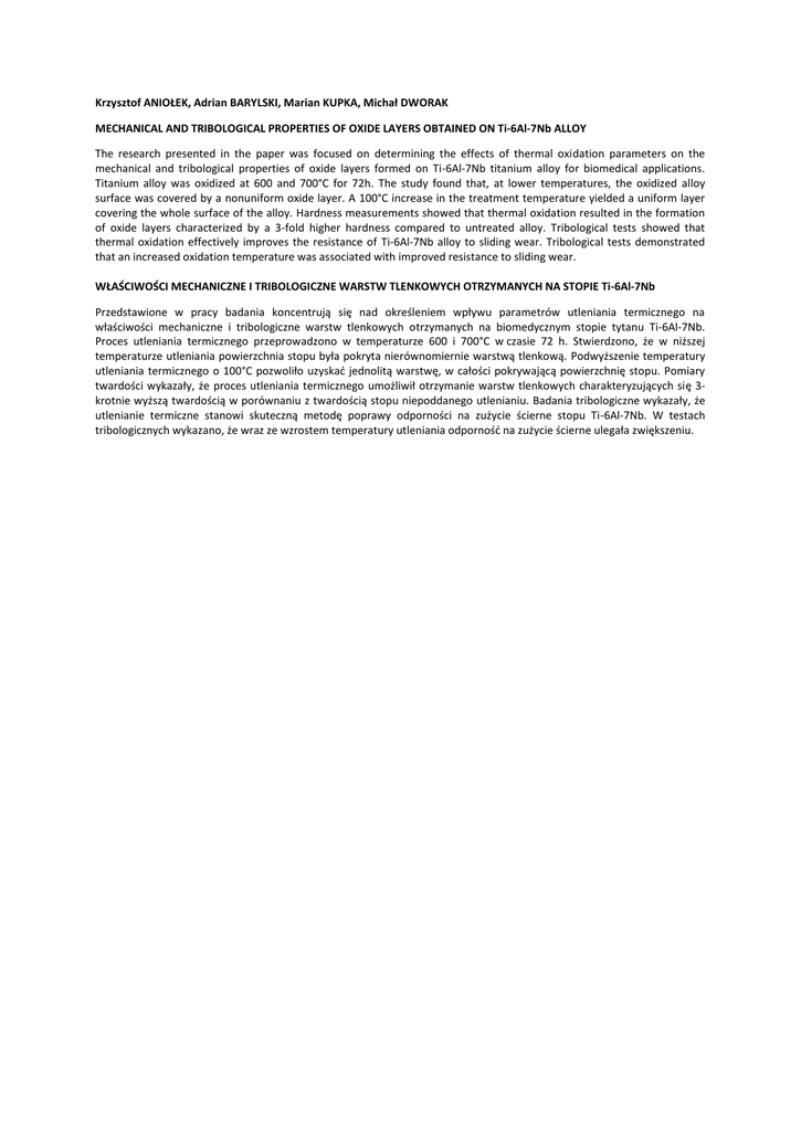 Krzysztof ANIOŁEK, Adrian BARYLSKI, Marian KUPKA, Michał DWORAK MECHANICAL AND TRIBOLOGICAL PROPERTIES OF OXIDE LAYERS OBTAINED ON Ti-6Al-7Nb ALLOY The research presented in the paper was focused on determining the effects of thermal oxidation parameters on the mechanical and tribological properties of oxide layers formed on Ti-6Al-7Nb titanium alloy for biomedical applications. Titanium alloy was oxidized at 600 and 700°C for 72h. The study found that, at lower temperatures, the oxidized alloy surface was covered by a nonuniform oxide layer. A 100°C increase in the treatment temperature yielded a uniform layer covering the whole surface of the alloy. Hardness measurements showed that thermal oxidation resulted in the formation of oxide layers characterized by a 3-fold higher hardness compared to untreated alloy. Tribological tests showed that thermal oxidation effectively improves the resistance of Ti-6Al-7Nb alloy to sliding wear. Tribological tests demonstrated that an increased oxidation temperature was associated with improved resistance to sliding wear. WŁAŚCIWOŚCI MECHANICZNE I TRIBOLOGICZNE WARSTW TLENKOWYCH OTRZYMANYCH NA STOPIE Ti-6Al-7Nb Przedstawione w pracy badania koncentrują się nad określeniem wpływu parametrów utleniania termicznego na właściwości mechaniczne i tribologiczne warstw tlenkowych otrzymanych na biomedycznym stopie tytanu Ti-6Al-7Nb. Proces utleniania termicznego przeprowadzono w temperaturze 600 i 700°C w czasie 72 h. Stwierdzono, że w niższej temperaturze utleniania powierzchnia stopu była pokryta nierównomiernie warstwą tlenkową. Podwyższenie temperatury utleniania termicznego o 100°C pozwoliło uzyskać jednolitą warstwę, w całości pokrywającą powierzchnię stopu. Pomiary twardości wykazały, że proces utleniania termicznego umożliwił otrzymanie warstw tlenkowych charakteryzujących się 3krotnie wyższą twardością w porównaniu z twardością stopu niepoddanego utlenianiu. Badania tribologiczne wykazały, że utlenianie termiczne stanowi skuteczną metodę poprawy odporności na zużycie ścierne stopu Ti-6Al-7Nb. W testach tribologicznych wykazano, że wraz ze wzrostem temperatury utleniania odporność na zużycie ścierne ulegała zwiększeniu.
