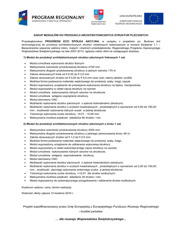 ZAKUP MODUŁÓW DO PRODUKCJI ARCHITEKTONICZNYCH STRUKTUR PLECIONYCH Przedsiębiorstwo PROGRESS ECO SPÓŁKA AKCYJNA, w związku z projektem pn. Budowa linii technologicznej do produkcji architektonicznych struktur metalowych realizowanym w ramach Działania 1.1 – Bezpośrednie wsparcie sektora mikro, małych i średnich przedsiębiorstw, Regionalnego Programu Operacyjnego Województwa Świętokrzyskiego na lata 2007-2013, ogłasza nabór ofert na następujące dostawy: 1) Moduł do produkcji architektonicznych struktur plecionych linkowych 1 szt. • • • • • • • • • • • • • • • Moduł umoŜliwia wykonanie struktur tkanych Maksymalna szerokość produkowanej struktury 4100 mm Maksymalna długość produkowanej struktury w jednym odcinku 170 m Zakres stosowanych linek od fi 0,45 do fi 3,0 mm Zakres stosowanych drutów od fi 0,20 do fi 5,0 mm oraz rurki, taśmy płaskie i profile MoŜliwa forma podawania materiału wejściowego do produkcji: pręty, kręgi, szpule Moduł wyposaŜony urządzenie do przewijania wykonanej struktury na bębny transportowe. Moduł wyposaŜany w układ cięcia struktury na wymiar Moduł umoŜliwia wykonywanie róŜnych wzorów na strukturze Moduł umoŜliwia wstępne wypręŜanie struktury. Moduł sterowany CNC MoŜliwość wykonania struktur plecionych o splocie holenderskim (skośnym) MoŜliwość wykonania struktur o oczkach kwadratowych , prostokątnych o wymiarach od 0,00 do 150,00 mm , moŜliwość wykonania róŜnych oczek w jednej strukturze Tolerancja wykonania oczka struktury +0,01 - +0,05 mm Maksymalna moŜliwa prędkość składania 60 drutów / min 2) Moduł do produkcji architektonicznych struktur plecionych z drutu 1 szt. • • • • • • • • • • • • • • Maksymalna szerokość produkowanej struktury 4000 mm. Maksymalna długość produkowanej struktury z jednego zamocowania drutu- 60 m. Zakres stosowanych drutów od fi 1,0 do fi 5,0 mm. MoŜliwa forma podawania materiału wejściowego do produkcji: pręty, kręgi,. Moduł wyposaŜony urządzenie do odbierania wykonanej struktury. Moduł wyposaŜany w układ automatycznego cięcia struktury na wymiar. Moduł umoŜliwia wykonywanie róŜnych wzorów na strukturze . Moduł umoŜliwia wstępne wyprostowanie struktury. Moduł sterowany CNC. MoŜliwość wykonania struktur plecionych o splocie holenderskim (skośnym). MoŜliwość wykonania struktur o oczkach kwadratowych , prostokątnych o wymiarach od 2,00 do 150,00 mm , moŜliwość płynnego wykonania zmiennego oczka w jednej strukturze. Tolerancja wykonania oczka struktury +/-0,01 dla drutów wzdłuŜnych . Maksymalna moŜliwa prędkość składania 30 drutów / min. Moduł wyposaŜony do automatycznego przygotowania i odbierania drutów wzdłuŜnych. Kryterium wyboru: cena, termin realizacji. WaŜność oferty upływa 12 kwietnia 2010 r. Projekt współfinansowany przez Unię Europejską z Europejskiego Funduszu Rozwoju Regionalnego i budŜet państwa … dla rozwoju Województwa Świętokrzyskiego… Zainteresowanych prosimy o kontakt: PROGRESS ECO S.A. Dobrów 7, 28-142 Tuczępy Tel. 015 864 62 70 Fax. 015 864 62 72 e-mail: [email protected] Osoba do kontaktu: Pan Paweł Waszczuk Projekt współfinansowany przez Unię Europejską z Europejskiego Funduszu Rozwoju Regionalnego i budŜet państwa … dla rozwoju Województwa Świętokrzyskiego…