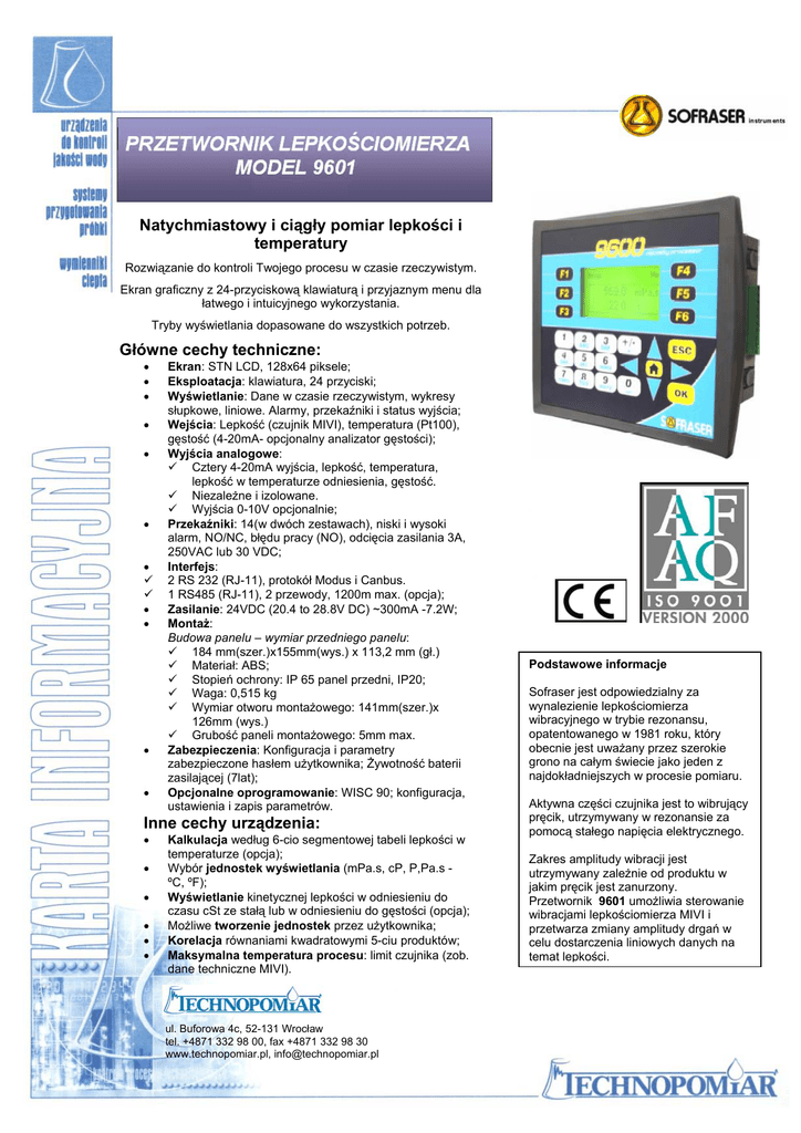Natychmiastowy i ciągły pomiar lepkości i temperatury Rozwiązanie do kontroli Twojego procesu w czasie rzeczywistym. Ekran graficzny z 24-przyciskową klawiaturą i przyjaznym menu dla łatwego i intuicyjnego wykorzystania. Tryby wyświetlania dopasowane do wszystkich potrzeb. Główne cechy techniczne: • • • • • • • 9 9 • • • • Ekran: STN LCD, 128x64 piksele; Eksploatacja: klawiatura, 24 przyciski; Wyświetlanie: Dane w czasie rzeczywistym, wykresy słupkowe, liniowe. Alarmy, przekaźniki i status wyjścia; Wejścia: Lepkość (czujnik MIVI), temperatura (Pt100), gęstość (4-20mA- opcjonalny analizator gęstości); Wyjścia analogowe: 9 Cztery 4-20mA wyjścia, lepkość, temperatura, lepkość w temperaturze odniesienia, gęstość. 9 Niezależne i izolowane. 9 Wyjścia 0-10V opcjonalnie; Przekaźniki: 14(w dwóch zestawach), niski i wysoki alarm, NO/NC, błędu pracy (NO), odcięcia zasilania 3A, 250VAC lub 30 VDC; Interfejs: 2 RS 232 (RJ-11), protokół Modus i Canbus. 1 RS485 (RJ-11), 2 przewody, 1200m max. (opcja); Zasilanie: 24VDC (20.4 to 28.8V DC) ~300mA -7.2W; Montaż: Budowa panelu – wymiar przedniego panelu: 9 184 mm(szer.)x155mm(wys.) x 113,2 mm (gł.) 9 Materiał: ABS; 9 Stopień ochrony: IP 65 panel przedni, IP20; 9 Waga: 0,515 kg 9 Wymiar otworu montażowego: 141mm(szer.)x 126mm (wys.) 9 Grubość paneli montażowego: 5mm max. Zabezpieczenia: Konfiguracja i parametry zabezpieczone hasłem użytkownika; Żywotność baterii zasilającej (7lat); Opcjonalne oprogramowanie: WISC 90; konfiguracja, ustawienia i zapis parametrów. Inne cechy urządzenia: • • • • • • Kalkulacja według 6-cio segmentowej tabeli lepkości w temperaturze (opcja); Wybór jednostek wyświetlania (mPa.s, cP, P,Pa.s ºC, ºF); Wyświetlanie kinetycznej lepkości w odniesieniu do czasu cSt ze stałą lub w odniesieniu do gęstości (opcja); Możliwe tworzenie jednostek przez użytkownika; Korelacja równaniami kwadratowymi 5-ciu produktów; Maksymalna temperatura procesu: limit czujnika (zob. dane techniczne MIVI). ul. Buforowa 4c, 52-131 Wrocław tel. +4871 332 98 00, fax +4871 332 98 30 www.technopomiar.pl, [email protected] Podstawowe informacje Sofraser jest odpowiedzialny za wynalezienie lepkościomierza wibracyjnego w trybie rezonansu, opatentowanego w 1981 roku, który obecnie jest uważany przez szerokie grono na całym świecie jako jeden z najdokładniejszych w procesie pomiaru. Aktywna części czujnika jest to wibrujący pręcik, utrzymywany w rezonansie za pomocą stałego napięcia elektrycznego. Zakres amplitudy wibracji jest utrzymywany zależnie od produktu w jakim pręcik jest zanurzony. Przetwornik 9601 umożliwia sterowanie wibracjami lepkościomierza MIVI i przetwarza zmiany amplitudy drgań w celu dostarczenia liniowych danych na temat lepkości.