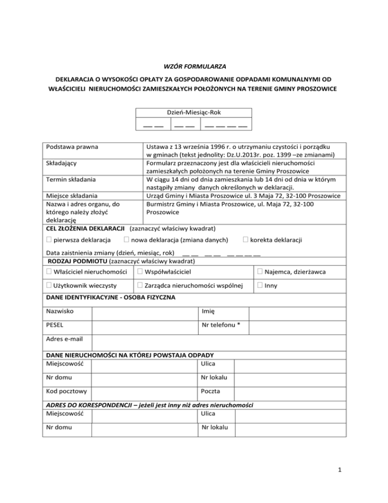 WZÓR FORMULARZA DEKLARACJA O WYSOKOŚCI OPŁATY ZA GOSPODAROWANIE ODPADAMI KOMUNALNYMI OD WŁAŚCICIELI NIERUCHOMOŚCI ZAMIESZKAŁYCH POŁOŻONYCH NA TERENIE GMINY PROSZOWICE Dzień-Miesiąc-Rok __ __ Podstawa prawna __ __ __ __ __ __ Ustawa z 13 września 1996 r. o utrzymaniu czystości i porządku w gminach (tekst jednolity: Dz.U.2013r. poz. 1399 –ze zmianami) Formularz przeznaczony jest dla właścicieli nieruchomości zamieszkałych położonych na terenie Gminy Proszowice W ciągu 14 dni od dnia zamieszkania lub 14 dni od dnia w którym nastąpiły zmiany danych określonych w deklaracji. Urząd Gminy i Miasta Proszowice ul. 3 Maja 72, 32-100 Proszowice Burmistrz Gminy i Miasta Proszowice, ul. Maja 72, 32-100 Proszowice Składający Termin składania Miejsce składania Nazwa i adres organu, do którego należy złożyć deklarację CEL ZŁOŻENIA DEKLARACJI (zaznaczyć właściwy kwadrat) pierwsza deklaracja nowa deklaracja (zmiana danych) korekta deklaracji Data zaistnienia zmiany (dzień, miesiąc, rok) __ __ __ __ __ __ __ __ RODZAJ PODMIOTU (zaznaczyć właściwy kwadrat) Właściciel nieruchomości Współwłaściciel Najemca, dzierżawca Użytkownik wieczysty Zarządca nieruchomości wspólnej Inny DANE IDENTYFIKACYJNE - OSOBA FIZYCZNA Nazwisko Imię PESEL Nr telefonu * Adres e-mail DANE NIERUCHOMOŚCI NA KTÓREJ POWSTAJA ODPADY Miejscowość Ulica Nr domu Nr lokalu Kod pocztowy Poczta ADRES DO KORESPONDENCJI – jeżeli jest inny niż adres nieruchomości Miejscowość Ulica Nr domu Nr lokalu 1 Kod pocztowy Poczta Adres e-mail DANE IDENTYFIKACYJNE -POZOSTAŁE PODMIOTY Nazwisko i imię/pełna nazwa Nazwa skrócona NIP/PESEL Adres e-mail Nr telefonu* Osoby upoważnione do reprezentowania, podstawa umocowania, sposób reprezentacji OŚWIADCZAM, ŻE ODPADY Z NIERUCHOMOŚCI BĘDĄ ZBIERANE W SPOSÓB:1) selektywny zmieszany OPŁATA ZA ODBIERANIE I ZAGOSPODAROWNIE ODPADÓW KOMUNALNYCH Stawka opłaty określona w Uchwale Rady Miejskiej w Proszowicach ……………….. zł/miesiąc w sprawie ustalenia stawki opłaty 2) Ilość osób zamieszkujących nieruchomość ..………… 3) Ilość osób uprawnionych do korzystania ze zwolnienia ………….. Należność do zapłaty4) ………………… zł Słownie: ………………………………………………………………………………………………….……………………… Liczba załączników …………….. szt Data Czytelny podpis (z podaniem imienia i nazwiska; pieczątka osoby upoważnionej) …………………………………………… ………………………………………………………………………………………………………………….. POUCZENIE Niniejsza deklaracja stanowi podstawę do wystawienia tytułu wykonawczego, zgodnie z przepisami ustawy z 17 czerwca 1966 r. o postępowaniu egzekucyjnym w administracji (t.j. Dz. U. z 2014 r. poz. 1619 – z późn. zm.) Zgodnie z art. 6m ustawy z 13 września 1996 r. o utrzymaniu czystości i porządku w gminach właściciel nieruchomości jest obowiązany złożyć do właściwego organu deklarację o wysokości opłaty za gospodarowanie odpadami komunalnymi w terminie 14 dni od dnia zamieszkania na danej nieruchomości pierwszego mieszkańca. W przypadku zmiany danych będących podstawą ustalenia wysokości należnej opłaty za gospodarowanie odpadami komunalnymi właściciel nieruchomości jest obowiązany złożyć nową deklarację w terminie 14 dni od dnia nastąpienia zmiany. Zgodnie z art. 6o cytowanej ustawy w razie niezłożenia deklaracji o wysokości opłaty za gospodarowanie odpadami komunalnymi albo uzasadnionych wątpliwości co do danych zawartych w deklaracji właściwy organ określa, w drodze decyzji, wysokość opłaty za gospodarowanie odpadami komunalnymi. 2 1) 2) 3) 4) Sposób zbierania odpadów będzie podlegał bieżącej kontroli w zakresie zgodności z Regulaminem Utrzymania Czystości i Porządku na terenie Gminy i Miasta Proszowice. Stawki opłat określone są w uchwale Rady Miejskiej w Proszowicach w sprawie ustalenia stawek opłaty za gospodarowanie odpadami komunalnymi. W przypadku wyboru metody selektywnego zbierania odpadów komunalnych należy wybrać opłatę obniżoną, a w przypadku nie prowadzenia selektywnej zbiórki opłatę podwyższoną. W przypadku korzystania ze zwolnienia w części z opłaty za gospodarowanie odpadami komunalnymi właścicieli nieruchomości, na których zamieszkują mieszkańcy, w części dotyczącej gospodarstw domowych, w których dochód nie przekracza kwoty uprawniającej do świadczeń pieniężnych z pomocy społecznej, o której mowa w art. 8 ust. 1 lub 2 ustawy z dnia 12 marca 2004 r. o pomocy społecznej (tekst jedn. Dz. U. 2015 r. poz. 163 z późn. zm.) lub rodziny wielodzietne, o których mowa w ustawie z dnia 5 grudnia 2014 r. o Karcie Dużej Rodziny (Dz.U. 2014 r. poz. 1863 ze zmianami) na zasadach określonych w odrębnej uchwale należy podać liczbę osób uprawnionych do korzystania ze zwolnienia oraz wypełnić załącznik nr 2 do uchwały w sprawie wzoru deklaracji Należność do zapłaty należy obliczyć mnożąc stawkę opłaty przez ilość osób zamieszkujących nieruchomość. Dla osób uprawnionych do zwolnień uwzględnić zwolnienia oraz wykazać te osoby w załączniku nr 2 do uchwały w sprawie wzoru deklaracji. * Wyrażam zgodę na otrzymywanie powiadomień za pomocą komunikatorów SMS 3