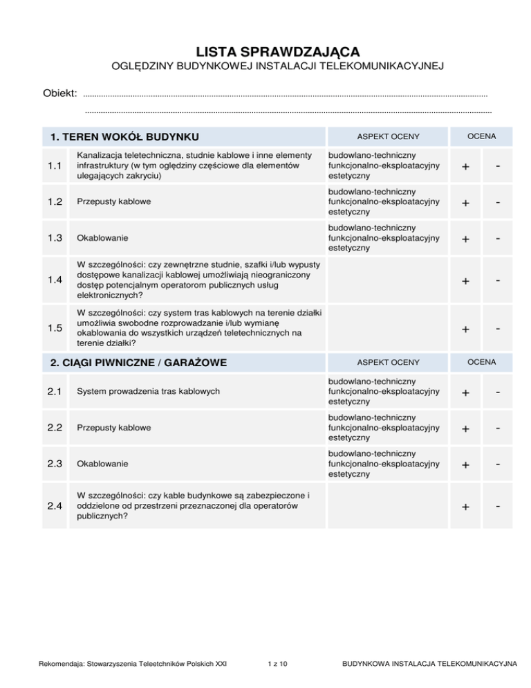 LISTA SPRAWDZAJĄCA OGLĘDZINY BUDYNKOWEJ INSTALACJI TELEKOMUNIKACYJNEJ Obiekt: .................................................................................................................................................................................... ..................................................................................................................................................................................... 1. TEREN WOKÓŁ BUDYNKU ASPEKT OCENY OCENA 1.1 Kanalizacja teletechniczna, studnie kablowe i inne elementy infrastruktury (w tym oględziny częściowe dla elementów ulegających zakryciu) budowlano-techniczny funkcjonalno-eksploatacyjny estetyczny + - 1.2 Przepusty kablowe budowlano-techniczny funkcjonalno-eksploatacyjny estetyczny + - 1.3 Okablowanie budowlano-techniczny funkcjonalno-eksploatacyjny estetyczny + - 1.4 W szczególności: czy zewnętrzne studnie, szafki i/lub wypusty dostępowe kanalizacji kablowej umożliwiają nieograniczony dostęp potencjalnym operatorom publicznych usług elektronicznych? + - 1.5 W szczególności: czy system tras kablowych na terenie działki umożliwia swobodne rozprowadzanie i/lub wymianę okablowania do wszystkich urządzeń teletechnicznych na terenie działki? + - 2. CIĄGI PIWNICZNE / GARAŻOWE ASPEKT OCENY OCENA 2.1 System prowadzenia tras kablowych budowlano-techniczny funkcjonalno-eksploatacyjny estetyczny + - 2.2 Przepusty kablowe budowlano-techniczny funkcjonalno-eksploatacyjny estetyczny + - 2.3 Okablowanie budowlano-techniczny funkcjonalno-eksploatacyjny estetyczny + - 2.4 W szczególności: czy kable budynkowe są zabezpieczone i oddzielone od przestrzeni przeznaczonej dla operatorów publicznych? + - Rekomendaja: Stowarzyszenia Teleetchników Polskich XXI 1 z 10 BUDYNKOWA INSTALACJA TELEKOMUNIKACYJNA 3. PIONY KABLOWE ASPEKT OCENY OCENA 3.1 System prowadzenia tras kablowych budowlano-techniczny funkcjonalno-eksploatacyjny estetyczny + - 3.2 Przepusty kablowe budowlano-techniczny funkcjonalno-eksploatacyjny estetyczny + - 3.3 Okablowanie budowlano-techniczny funkcjonalno-eksploatacyjny estetyczny + - 3.4 W szczególności: czy kable budynkowe są zabezpieczone i oddzielone od przestrzeni przeznaczonej dla operatorów publicznych? + - 4. CIĄGI POZIOME (KORYTARZOWE) ASPEKT OCENY OCENA System prowadzenia tras kablowych (w tym oględziny częściowe dla elementów ulegających zakryciu) budowlano-techniczny funkcjonalno-eksploatacyjny estetyczny + - 4.2 Przepusty kablowe budowlano-techniczny funkcjonalno-eksploatacyjny estetyczny + - 4.3 Okablowanie budowlano-techniczny funkcjonalno-eksploatacyjny estetyczny + - 4.4 W szczególności: czy pozostawiono rezerwowe ciągi kablowe na dodatkowe okablowanie i czy są one w pełni drożne? + - 4.5 W szczególności: czy kable budynkowe są zabezpieczone i oddzielone od przestrzeni przeznaczonej dla operatorów publicznych? + - 4.1 5. INSTALACJE DACHOWE ASPEKT OCENY OCENA 5.1 Maszty antenowe budowlano-techniczny funkcjonalno-eksploatacyjny estetyczny + - 5.2 System prowadzenia tras kablowych budowlano-techniczny funkcjonalno-eksploatacyjny estetyczny + - 5.3 Przepusty kablowe budowlano-techniczny funkcjonalno-eksploatacyjny estetyczny + - 5.4 Okablowanie budowlano-techniczny funkcjonalno-eksploatacyjny estetyczny + - 5.5 W szczególności: czy instalacja dachowa umożliwia dostęp potencjalnym operatorom publicznych usług elektronicznych? + - Rekomendaja: Stowarzyszenia Teleetchników Polskich XXI 2 z 10 BUDYNKOWA INSTALACJA TELEKOMUNIKACYJNA 6. INSTALACJE ABONENCKIE ASPEKT OCENY OCENA 6.1 System prowadzenia tras kablowych (w tym oględziny częściowe dla elementów ulegających zakryciu) budowlano-techniczny funkcjonalno-eksploatacyjny estetyczny + - 6.2 Przepusty kablowe budowlano-techniczny funkcjonalno-eksploatacyjny estetyczny + - 6.3 Okablowanie budowlano-techniczny funkcjonalno-eksploatacyjny estetyczny + - 6.4 Telekomunikacyjne skrzynki mieszkaniowe (TSM) budowlano-techniczny funkcjonalno-eksploatacyjny estetyczny + - 6.5 Gniazda abonenckie budowlano-techniczny funkcjonalno-eksploatacyjny estetyczny + - 6.6 Urządzenia i systemy lokalne budowlano-techniczny funkcjonalno-eksploatacyjny estetyczny + - 6.7 Pomiary sprawdzające i testy działania dla co najmniej 2 % obwodów, urządzeń i systemów + - 7. PUNKTY DYSTRYBUCYJNE ASPEKT OCENY OCENA 7.1 Pomieszczenia techniczne, punkty kolokacyjno-dystrybucyjne budowlano-techniczny funkcjonalno-eksploatacyjny estetyczny + - 7.2 System prowadzenia tras kablowych budowlano-techniczny funkcjonalno-eksploatacyjny estetyczny + - 7.3 Przepusty kablowe budowlano-techniczny funkcjonalno-eksploatacyjny estetyczny + - 7.4 Okablowanie budowlano-techniczny funkcjonalno-eksploatacyjny estetyczny + - 7.5 Urządzenia i elementy dystrybucji połączeń (krosowań) budowlano-techniczny funkcjonalno-eksploatacyjny estetyczny + - 7.6 Pomiary sprawdzające i testy działania dla co najmniej 2 % obwodów, urządzeń i systemów + - 7.7 W szczególności: czy publiczni operatorzy i dostawcy usług elektronicznych mają nieograniczony dostęp za pomocą okablowania budynkowego do wszystkich lokali? + - Rekomendaja: Stowarzyszenia Teleetchników Polskich XXI 3 z 10 BUDYNKOWA INSTALACJA TELEKOMUNIKACYJNA 7.8 W szczególności: czy główny punkt kolokacyjno-dystrybucyjny dostępny jest dla wszystkich lokalnych systemów i urządzeń teletechnicznych? + - Komisja odbiorcza w składzie: .......................................................................................................... ................................ .......................................................................................................... ................................ .......................................................................................................... ................................ .......................................................................................................... ................................ 
