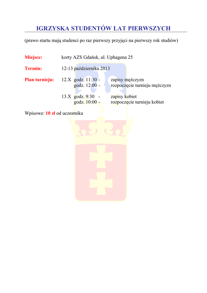 IGRZYSKA STUDENTÓW LAT PIERWSZYCH (prawo startu mają studenci po raz pierwszy przyjęci na pierwszy rok studiów) Miejsce: korty AZS Gdańsk, ul. Uphagena 25 Termin: 12-13 października 2013 Plan turnieju: 12.X godz. 11:30 godz. 12:00 - zapisy mężczyzn rozpoczęcie turnieju mężczyzn 13.X godz. 9:30 godz. 10:00 - zapisy kobiet rozpoczęcie turnieju kobiet Wpisowe: 10 zł od uczestnika