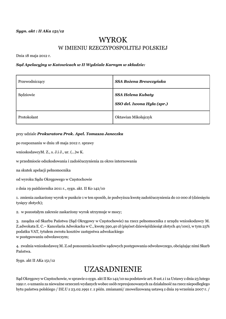 Sygn. akt : II AKa 151/12 WYROK W IMIENIU RZECZYPOSPOLITEJ POLSKIEJ Dnia 18 maja 2012 r. Sąd Apelacyjny w Katowicach w II Wydziale Karnym w składzie: Przewodniczący SSA Bożena Brewczyńska Sędziowie SSA Helena Kubaty SSO del. Iwona Hyła (spr.) Protokolant Oktawian Mikołajczyk przy udziale Prokuratora Prok. Apel. Tomasza Janeczka po rozpoznaniu w dniu 18 maja 2012 r. sprawy wnioskodawcyM. Z., s. J.i J., ur. (...)w K. w przedmiocie odszkodowania i zadośćuczynienia za okres internowania na skutek apelacji pełnomocnika od wyroku Sądu Okręgowego w Częstochowie z dnia 19 października 2011 r., sygn. akt. II Ko 142/10 1. zmienia zaskarżony wyrok w punkcie 1 w ten sposób, że podwyższa kwotę zadośćuczynienia do 10 000 zł (dziesięciu tysięcy złotych); 2. w pozostałym zakresie zaskarżony wyrok utrzymuje w mocy; 3. zasądza od Skarbu Państwa (Sąd Okręgowy w Częstochowie) na rzecz pełnomocnika z urzędu wnioskodawcy M. Z.adwokata E. C.– Kancelaria Adwokacka w C., kwotę 590,40 zł (pięćset dziewięćdziesiąt złotych 40/100), w tym 23% podatku VAT, tytułem zwrotu kosztów zastępstwa adwokackiego w postępowaniu odwoławczym; 4. zwalnia wnioskodawcę M. Z.od ponoszenia kosztów sądowych postępowania odwoławczego, obciążając nimi Skarb Państwa. Sygn. akt II AKa 151/12 UZASADNIENIE Sąd Okręgowy w Częstochowie, w sprawie o sygn. akt II Ko 142/10 na podstawie art. 8 ust.1 i 1a Ustawy z dnia 23 lutego 1991 r. o uznaniu za nieważne orzeczeń wydanych wobec osób represjonowanych za działalność na rzecz niepodległego bytu państwa polskiego / DZ.U z 23.02.1991 r. z późn. zmianami/ znowelizowaną ustawą z dnia 19 września 2007 r. / DZ.U. z dnia 18.10.2007 r./ zasądził od Skarbu Państwa na rzecz wnioskodawcy M. Z.kwotę 5.000 złotych tytułem zadośćuczynienia za internowanie go w okresie od dnia 16 grudnia 1981 r. do dnia 23 stycznia 1982 r. w związku z wprowadzeniem w Polsce stanu wojennego w dniu 13 grudnia 1981 r. W pozostałej części oddalił powództwo, a kosztami postępowania obciążył Skarb Państwa. Apelację wniósł pełnomocnik wyznaczony z urzędu dla wnioskodawcy i zaskarżył wyrok w części oddalającej wniosek w zakresie kwoty 150.000 zł tytułem odszkodowania i kwoty 145.000 zł, tytułem zadośćuczynienia. Wyrokowi zarzucił: • błąd w ustaleniach faktycznych mający wpływ na treść orzeczenia, a polegający na przyjęciu, że wnioskodawca był internowany jedynie w okresie od 16.12.1981 r. do 23.01.1982 r. oraz że na skutek internowania nie poniósł żadnych strat, podczas gdy z wyjaśnień wnioskodawcy wynika, że był on pozbawiony wolności w okresie przyjętym przez sąd oraz przebywał w L. od 24.01.82 do 26.02.82, w C. od 25.06.82 do 25.08.82, od 25.06.83 do 25.08.83, od 25.06.84 do 25.08.84, od 25.06.85 do 25.08.85 a takie potraktowanie wnioskodawcy i zmuszenie go do opuszczenia kraju doprowadziło całą rodzinę do ruiny finansowej, • niewyjaśnienie okoliczności niezbędnych dla określenia okresu internowania poprzez oddalenie wniosku o dopuszczenie dowodu z zeznań świadków mających wiedzę o powyższych okolicznościach, • interpretowanie wątpliwości wynikających z opinii biegłych na niekorzyść wnioskodawcy. Podnosząc powyższe zarzuty skarżący wniósł o zmianę zaskarżonego orzeczenia i zasądzenie na rzecz wnioskodawcy kwoty 150.000 zł tytułem odszkodowania i kwoty 150.000 zł tytułem zadośćuczynienia, ewentualnie o uchylenie zaskarżonego wyroku i przekazanie sprawy do ponownego rozpoznania, celem uzupełnienia materiału dowodowego. Sąd Apelacyjny zważył, co następuje: Apelacja nie zasługiwała na uwzględnienie, a stawiane zaskarżonemu wyrokowi zarzuty okazały się niezasadne. Konsekwencją jednak rozpoznania środka odwoławczego, stała się konieczność podwyższenia zasądzonej od Skarbu Państwa na rzecz wnioskodawcy kwoty zadośćuczynienia do 10.000 złotych. Przechodząc do zarzutów stawianych zaskarżonemu orzeczeniu wskazać na wstępie należy, że Sąd Okręgowy w sposób trafny i precyzyjny ustalił faktyczny okres internowania wnioskodawcy i przyjął, że M. Z.był internowany wyłącznie w okresie od 16 grudnia 1981 r. do dnia 23 stycznia 1982 r., kiedy to został zwolniony z ośrodka internowania w Z.- Z.i powrócił do miejsca zamieszkania. Brak jest jakichkolwiek wiarygodnych i uzasadnionych podstaw, aby przyjmować za wnioskodawcą i jego pełnomocnikiem, dłuższy okres pozbawienia wolności i to zarówno na skutek internowania, jak i innych – bliżej nieokreślonych przez skarżącego – decyzji, czy orzeczeń organów PRL. Zarówno z akt nadesłanych przez Instytut Pamięci Narodowej Komisji Ścigania Zbrodni przeciwko Narodowi Polskiemu, jak i z dowodów przeprowadzonych przez Sąd I instancji niezbicie wynika, że wnioskodawca po zwolnieniu go z internowania powrócił do miejsca zamieszkania i do pracy, jaką wówczas wykonywał w Zespole Szkół (...). Słusznie uznał Sąd Okręgowy za wiarygodny dokument w postaci informacji szpitala psychiatrycznego w L., gdzie rzekomo M. Z.miał być „wożony” przez służbę bezpieczeństwa i gdzie aplikowano mu leki psychotropowe. Dokument ten w jednoznaczny sposób kwestionuje fakt pobytu M. Z.w szpitalu i leczenia go w tamtym okresie. Podobnie zasadnie uznano za wiarygodny dokument w postaci protokołu konferencji Rady Pedagogicznej (k.291 – 293), dokumenty znajdujące się aktach pracowniczych wnioskodawcy, aktach ZUS- u, które zdecydowanie wykluczają fakt jego nieobecności w pracy w okresie po zwolnieniu go z internowania, a więc po 23 stycznia 1982 roku. Podobnie zeznania współpracowników wnioskodawcy, a więc świadka G.i L., potwierdzają ustalenia dotyczące powrotu wnioskodawcy do pracy i jej świadczenia w Zespole Szkół (...)w C.. W aktach pracowniczych znajduje się pismo z dnia 27 kwietnia 1982 r. zawiadamiające wnioskodawcę o przyznaniu mu dodatku za wysługę lat o