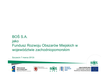 BOŚ S.A. jako Fundusz Rozwoju Obszarów Miejskich w województwie zachodniopomorskim Szczecin 7 marca 2012r. Projekty miejskie - cechy Projekty ujęte w lokalnych programach rewitalizacji Projekty, które nie mają szansy na pozyskanie środków w warunkach rynkowych, z uwagi na specyfikę przedsięwzięć rewitalizacyjnych: nieduŜą rentowność inwestycji ryzyko związane z realizacją element społeczny (traktowany drugoplanowo w ocenie projektu dokonywanej przez banki komercyjne) 2 BOŚ S.A. vs. Wnioskodawcy Wsparcie w identyfikacji moŜliwości zaciągnięcia PoŜyczki JESSICA (współpraca z KARR S.A.) Wsparcie w przygotowaniu dokumentacji aplikacyjnej (KARR S.A.) Konferencje tematyczne i indywidualne konsultacje Warsztaty nt. zasad przygotowania dokumentacji aplikacyjnej Indywidualne podejście do kaŜdego Wnioskodawcy środków JESSICA Udział w Projekcie 4x4 Biznes 3 Dostępne środki Środki JESSICA – 65 mln PLN (obszar poza SOM) Dźwignia finansowa BOŚ S.A. – 100 mln PLN Wydatkowanie środków JESSICA – czerwiec 2015r. bądź do wyczerpania alokacji. 4 PoŜyczka JESSICA – preferencyjność oferty FROM zarządzany przez BOŚ S.A. na finansowanie Projektów Miejskich proponuje preferencyjną PoŜyczkę JESSICA: niŜsza cena finansowania dłuŜszy okres finansowania dłuŜszy okres karencji w spłacie kapitału brak dodatkowych kosztów (opłat i prowizji) za obsługę i udzielenie PoŜyczki JESSICA 5 PoŜyczka JESSICA – warunki oferowania Okres kredytowania Maksymalny okres kredytowania wynosi 15 lat (180 miesięcy) Oprocentowanie PoŜyczka JESSICA – WIBOR3M minus 2 p.p. p.a. (przy czym oprocentowanie nie moŜe być niŜsze niŜ 1 % p.a.) MontaŜ finansowy PoŜyczka JESSICA – maksymalnie 75% całkowitych wydatków kwalifikowanych w Projekcie miejskim, z zastrzeŜeniem, Ŝe 25% Wydatków kwalifikowanych Projektu miejskiego stanowić będą środki własne Wnioskodawcy lub inne, zewnętrzne źródła finansowania w formie pozbawionej wsparcia ze środków publicznych Prowizje i opłaty – brak Karencja – kapitału (max 24 miesiące); odsetek - nie 6 Nabór wniosków Strona internetowa www.bosbank.pl zakładka Unia Europejska Ogłoszenie o naborze Pliki do pobrania ze stron internetowych Regulamin finansowania Projektów miejskich przez BOŚ S.A. Wniosek – PoŜyczka JESSICA Wykaz dokumentów dla PoŜyczki JESSICA Akty prawne 7 Główne etapy procesu ubiegania się o PoŜyczkę JESSICA w BOŚ S.A. złoŜenie wniosku w Centrum Korporacyjnym (CK) w Szczecinie: Szczecin i Koszalin ocena formalna i merytoryczna ocena ekonomiczno-finansowa uzgodnienie warunków i struktury finansowania oraz odpowiedniej formy zabezpieczenia Komitet Inwestycyjny – decyzja o kwalifikowaniu Projektu miejskiego decyzja kredytowa – właściwy organ banku zawarcie Umowy Inwestycyjnej Podczas ubiegania się o PoŜyczkę JESSICA, BOŚ S.A., jako FROM udziela wsparcia przy przygotowywaniu wniosku oraz innych dokumentów. 8 Wyzwania w województwie zachodniopomorskim Zwiększenie świadomości przedsiębiorców Rola samorządów: Inwestor? czy Mecenat? Współpraca samorządów społeczny i prywatny Bariery: potrzeba aktualizacji LPR; zadłuŜenie JST Projekty dotacyjne, a Inicjatywa JESSICA Inwestuj w zachodniopomorskim – działania skierowane do inwestorów z całej Polski z 9 przedsiębiorcami – interes BOŚ S.A. jako FROM Dziękujemy za uwagę! Małgorzata Dusza, Dyrektor Małgorzata Kowalczuk Marcin Pergoł Arkadiusz Ferenz Departament Instytucji Finansowych Bank Ochrony Srodowiska S.A. Kontakt: Piotr Podębski, Dyrektor CK Szczecin Agnieszka Turowska, Dyrektor SprzedaŜy (Koszalin) mail: [email protected] Jacek Iglewski, Dyrektor SprzedaŜy (Szczecin) mail: [email protected] 10