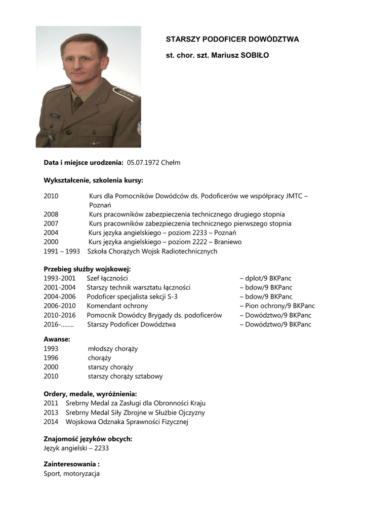 STARSZY PODOFICER DOWÓDZTWA st. chor. szt. Mariusz SOBIŁO Data i miejsce urodzenia: 05.07.1972 Chełm Wykształcenie, szkolenia kursy: 2010 2008 2007 2004 2000 1991 – 1993 Kurs dla Pomocników Dowódców ds. Podoficerów we współpracy JMTC – Poznań Kurs pracowników zabezpieczenia technicznego drugiego stopnia Kurs pracowników zabezpieczenia technicznego pierwszego stopnia Kurs języka angielskiego – poziom 2233 – Poznań Kurs języka angielskiego – poziom 2222 – Braniewo Szkoła Chorążych Wojsk Radiotechnicznych Przebieg służby wojskowej: 1993-2001 Szef łączności 2001-2004 Starszy technik warsztatu łączności 2004-2006 Podoficer specjalista sekcji S-3 2006-2010 Komendant ochrony 2010-2016 Pomocnik Dowódcy Brygady ds. podoficerów 2016-…….. Starszy Podoficer Dowództwa Awanse: 1993 1996 2000 2010 młodszy chorąży chorąży starszy chorąży starszy chorąży sztabowy Ordery, medale, wyróżnienia: 2011 Srebrny Medal za Zasługi dla Obronności Kraju 2013 Srebrny Medal Siły Zbrojne w Służbie Ojczyzny 2014 Wojskowa Odznaka Sprawności Fizycznej Znajomość języków obcych: Język angielski – 2233 Zainteresowania : Sport, motoryzacja – dplot/9 BKPanc – bdow/9 BKPanc – bdow/9 BKPanc – Pion ochrony/9 BKPanc – Dowództwo/9 BKPanc – Dowództwo/9 BKPanc