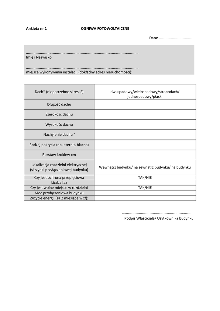 Ankieta nr 1 OGNIWA FOTOWOLTAICZNE Data: ………………………………. ………………………………………………………………………………………………………… Imię i Nazwisko ………………………………………………………………………………………………………… miejsce wykonywania instalacji (dokładny adres nieruchomości): Dach* (niepotrzebne skreślić) dwuspadowy/wielospadowy/stropodach/ jednospadowy/płaski Długość dachu Szerokość dachu Wysokość dachu Nachylenie dachu ° Rodzaj pokrycia (np. eternit, blacha) Rozstaw krokiew cm Lokalizacja rozdzielni elektrycznej (skrzynki przyłączeniowej budynku) Czy jest ochrona przepięciowa Liczba faz Czy jest wolne miejsce w rozdzielni Moc przyłączeniowa budynku Zużycie energii (za 2 miesiące w zł): Wewnątrz budynku/ na zewnątrz budynku/ na budynku TAK/NIE TAK/NIE ..……………………………………………………………….. Podpis Właściciela/ Użytkownika budynku