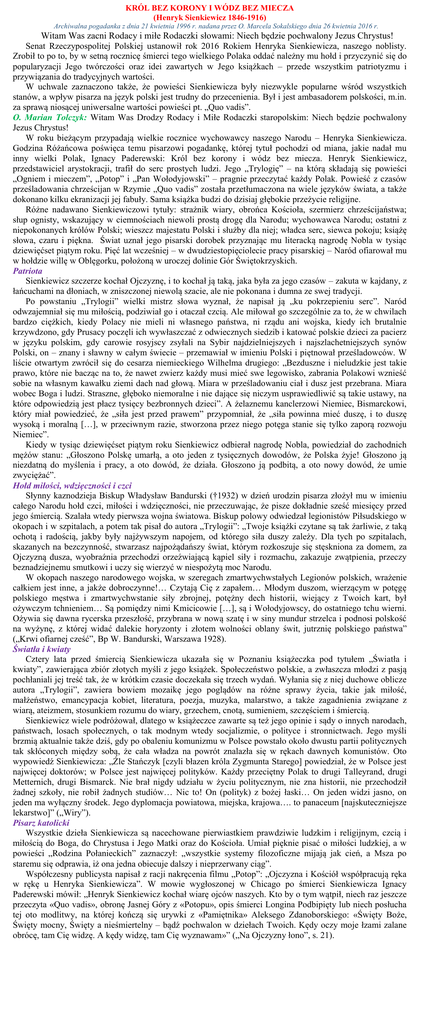 KRÓL BEZ KORONY I WÓDZ BEZ MIECZA (Henryk Sienkiewicz 1846-1916) Archiwalna pogadanka z dnia 21 kwietnia 1996 r. nadana przez O. Marcela Sokalskiego dnia 26 kwietnia 2016 r. Witam Was zacni Rodacy i miłe Rodaczki słowami: Niech będzie pochwalony Jezus Chrystus! Senat Rzeczypospolitej Polskiej ustanowił rok 2016 Rokiem Henryka Sienkiewicza, naszego noblisty. Zrobił to po to, by w setną rocznicę śmierci tego wielkiego Polaka oddać należny mu hołd i przyczynić się do popularyzacji Jego twórczości oraz idei zawartych w Jego książkach – przede wszystkim patriotyzmu i przywiązania do tradycyjnych wartości. W uchwale zaznaczono także, że powieści Sienkiewicza były niezwykle popularne wśród wszystkich stanów, a wpływ pisarza na język polski jest trudny do przecenienia. Był i jest ambasadorem polskości, m.in. za sprawą niosącej uniwersalne wartości powieści pt. „Quo vadis”. O. Marian Tolczyk: Witam Was Drodzy Rodacy i Miłe Rodaczki staropolskim: Niech będzie pochwalony Jezus Chrystus! W roku bieżącym przypadają wielkie rocznice wychowawcy naszego Narodu – Henryka Sienkiewicza. Godzina Różańcowa poświęca temu pisarzowi pogadankę, której tytuł pochodzi od miana, jakie nadał mu inny wielki Polak, Ignacy Paderewski: Król bez korony i wódz bez miecza. Henryk Sienkiewicz, przedstawiciel arystokracji, trafił do serc prostych ludzi. Jego „Trylogię” – na którą składają się powieści „Ogniem i mieczem”, „Potop” i „Pan Wołodyjowski” – pragnie przeczytać każdy Polak. Powieść z czasów prześladowania chrześcijan w Rzymie „Quo vadis” została przetłumaczona na wiele języków świata, a także dokonano kilku ekranizacji jej fabuły. Sama książka budzi do dzisiaj głębokie przeżycie religijne. Różne nadawano Sienkiewiczowi tytuły: strażnik wiary, obrońca Kościoła, szermierz chrześcijaństwa; słup ognisty, wskazujący w ciemnościach niewoli prostą drogę dla Narodu; wychowawca Narodu; ostatni z niepokonanych królów Polski; wieszcz majestatu Polski i służby dla niej; władca serc, siewca pokoju; książę słowa, czaru i piękna. Świat uznał jego pisarski dorobek przyznając mu literacką nagrodę Nobla w tysiąc dziewięćset piątym roku. Pięć lat wcześniej – w dwudziestopięciolecie pracy pisarskiej – Naród ofiarował mu w hołdzie willę w Oblęgorku, położoną w uroczej dolinie Gór Świętokrzyskich. Patriota Sienkiewicz szczerze kochał Ojczyznę, i to kochał ją taką, jaka była za jego czasów – zakuta w kajdany, z łańcuchami na dłoniach, w zniszczonej niewolą szacie, ale nie pokonana i dumna ze swej tradycji. Po powstaniu „Trylogii” wielki mistrz słowa wyznał, że napisał ją „ku pokrzepieniu serc”. Naród odwzajemniał się mu miłością, podziwiał go i otaczał czcią. Ale miłował go szczególnie za to, że w chwilach bardzo ciężkich, kiedy Polacy nie mieli ni własnego państwa, ni rządu ani wojska, kiedy ich brutalnie krzywdzono, gdy Prusacy poczęli ich wywłaszczać z odwiecznych siedzib i katować polskie dzieci za pacierz w języku polskim, gdy carowie rosyjscy zsyłali na Sybir najdzielniejszych i najszlachetniejszych synów Polski, on – znany i sławny w całym świecie – przemawiał w imieniu Polski i piętnował prześladowców. W liście otwartym zwrócił się do cesarza niemieckiego Wilhelma drugiego: „Bezduszne i nieludzkie jest takie prawo, które nie bacząc na to, że nawet zwierz każdy musi mieć swe legowisko, zabrania Polakowi wznieść sobie na własnym kawałku ziemi dach nad głową. Miara w prześladowaniu ciał i dusz jest przebrana. Miara wobec Boga i ludzi. Straszne, głęboko niemoralne i nie dające się niczym usprawiedliwić są takie ustawy, na które odpowiedzią jest płacz tysięcy bezbronnych dzieci”. A żelaznemu kanclerzowi Niemiec, Bismarckowi, który miał powiedzieć, że „siła jest przed prawem” przypomniał, że „siła powinna mieć duszę, i to duszę wysoką i moralną […], w przeciwnym razie, stworzona przez niego potęga stanie się tylko zaporą rozwoju Niemiec”. Kiedy w tysiąc dziewięćset piątym roku Sienkiewicz odbierał nagrodę Nobla, powiedział do zachodnich mężów stanu: „Głoszono Polskę umarłą, a oto jeden z tysięcznych dowodów, że Polska żyje! Głoszono ją niezdatną do myślenia i pracy, a oto dowód, że działa. Głoszono ją podbitą, a oto nowy dowód, że umie zwyciężać”. Hołd miłości, wdzięczności i czci Słynny kaznodzieja Biskup Władysław Bandurski (†1932) w dzień urodzin pisarza złożył mu w imieniu całego Narodu hołd czci, miłości i wdzięczności, nie przeczuwając, że pisze dokładnie sześć miesięcy przed jego śmiercią. Szalała wtedy pierwsza wojna światowa. Biskup polowy odwiedzał legionistów Piłsudskiego w okopach i w szpitalach, a potem tak pisał do autora „Trylogii”: „Twoje książki czytane są tak żarliwie, z taką ochotą i radością, jakby były najżywszym napojem, od którego siła duszy zależy. Dla tych po szpitalach, skazanych na bezczynność, stwarzasz najpożądańszy świat, którym rozkoszuje się stęskniona za domem, za Ojczyzną dusza, wyobraźnia przechodzi orzeźwiającą kąpiel siły i rozmachu, zakazuje zwątpienia, przeczy beznadziejnemu smutkowi i uczy się wierzyć w niespożytą moc Narodu. W okopach naszego narodowego wojska, w szeregach zmartwychwstałych Legionów polskich, wrażenie całkiem jest inne, a jakże dobroczynne!… Czytają Cię z zapałem… Młodym duszom, wierzącym w potęgę polskiego męstwa i zmartwychwstanie siły zbrojnej, potężny dech historii, wiejący z Twoich kart, był ożywczym tchnieniem… Są pomiędzy nimi Kmicicowie […], są i Wołodyjowscy, do ostatniego tchu wierni. Ożywia się dawna rycerska przeszłość, przybrana w nową szatę i w siny mundur strzelca i podnosi polskość na wyżynę, z której widać dalekie horyzonty i złot