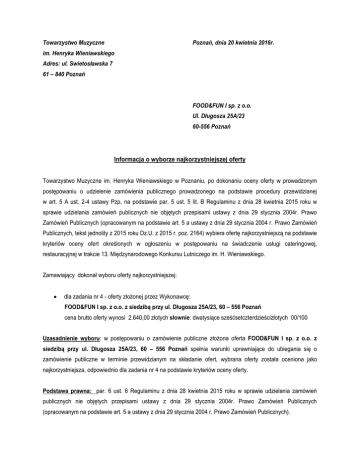 Towarzystwo Muzyczne Poznań, dnia 20 kwietnia 2016r. im. Henryka Wieniawskiego Adres: ul. Swietosławska 7 61 – 840 Poznań FOOD&FUN I sp. z o.o. Ul. Długosza 25A/23 60-556 Poznań Informacja o wyborze najkorzystniejszej oferty Towarzystwo Muzyczne im. Henryka Wieniawskiego w Poznaniu, po dokonaniu oceny oferty w prowadzonym postępowaniu o udzielenie zamówienia publicznego prowadzonego na podstawie procedury przewidzianej w art. 5 A ust. 2-4 ustawy Pzp, na podstawie par. 5 ust. 5 lit. B Regulaminu z dnia 28 kwietnia 2015 roku w sprawie udzielania zamówień publicznych nie objętych przepisami ustawy z dnia 29 stycznia 2004r. Prawo Zamówień Publicznych (opracowanym na podstawie art. 5 a ustawy z dnia 29 stycznia 2004 r. Prawo Zamówień Publicznych, tekst jednolity z 2015 roku Dz.U. z 2015 r. poz. 2164) wybiera ofertę najkorzystniejszą na podstawie kryteriów oceny ofert określonych w ogłoszeniu w postępowaniu na świadczenie usługi cateringowej, restauracyjnej w trakcie 13. Międzynarodowego Konkursu Lutniczego im. H. Wieniawskiego. Zamawiający dokonał wyboru oferty najkorzystniejszej: dla zadania nr 4 - oferty złożonej przez Wykonawcę: FOOD&FUN I sp. z o.o. z siedzibą przy ul. Długosza 25A/23, 60 – 556 Poznań cena brutto oferty wynosi 2.640,00 złotych słownie: dwatysiące sześćsetczterdzieścizłotych 00/100 Uzasadnienie wyboru: w postępowaniu o zamówienie publiczne złożona oferta FOOD&FUN I sp. z o.o. z siedzibą przy ul. Długosza 25A/23, 60 – 556 Poznań spełnia warunki uprawniające do ubiegania się o zamówienie publiczne w terminie przewidzianym na składanie ofert, wybrana oferty została oceniona jako najkorzystniejsza, odpowiednio dla zadania nr 4 na podstawie kryteriów oceny oferty. Podstawa prawna: par. 6 ust. 6 Regulaminu z dnia 28 kwietnia 2015 roku w sprawie udzielania zamówień publicznych nie objętych przepisami ustawy z dnia 29 stycznia 2004r. Prawo Zamówień Publicznych (opracowanym na podstawie art. 5 a ustawy z dnia 29 stycznia 2004 r. Prawo Zamówień Publicznych). Podpisanie umowy: Wybrany Wykonawca obowiązany jest skontaktować się z Zamawiającym w sprawie podpisania umowy w siedzibie Towarzystwa Muzycznego im. Henryka Wieniawskiego w Poznaniu w dniu: 25 kwietnia 2016 roku. Z poważaniem Bartosz Bryła Prezes